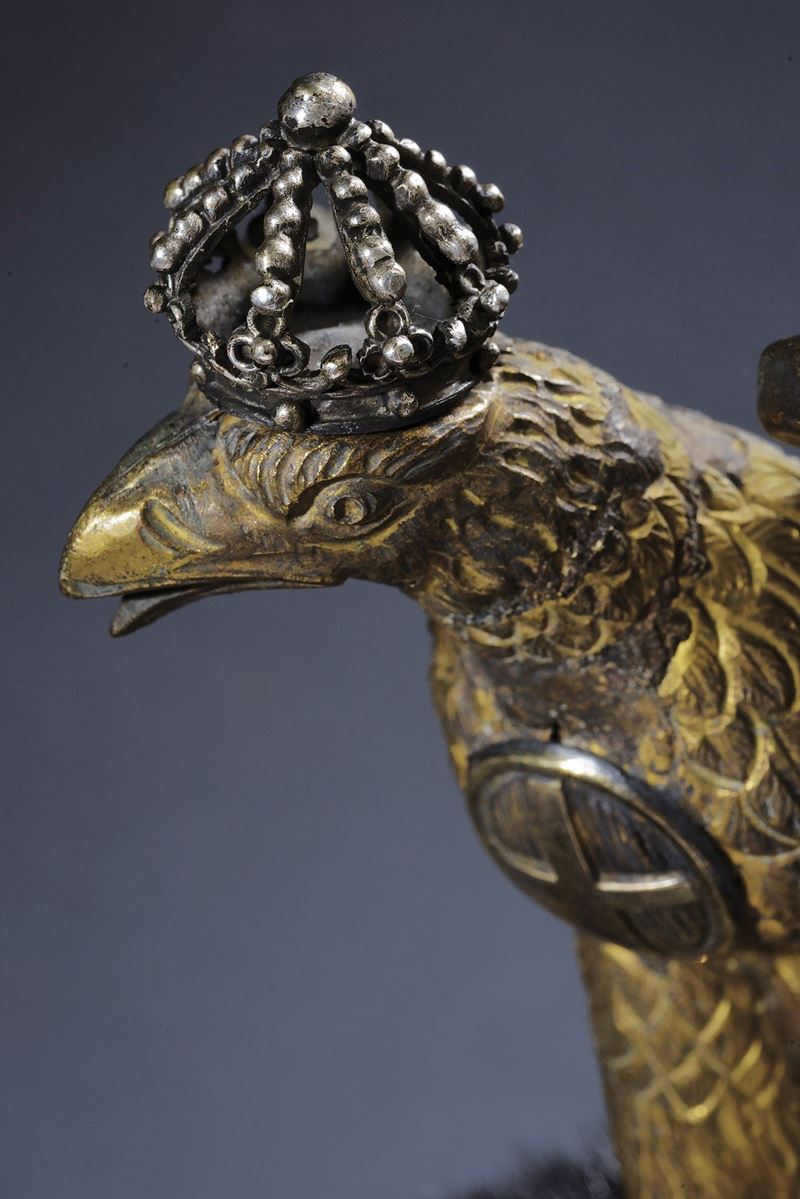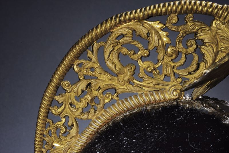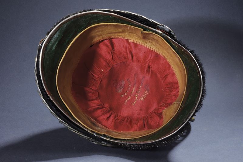 Coppo in galletta rivestito da pelliccia di colore nero. Base del cimiero, raggiera e sottogola a squame in argento; cimiero messo a giorno in metallo dorato, come l'aquila a tuttotondo recante sul petto la croce sabauda e la stella del fregio frontale caricata dalla cifra reale; completa di coccarda tricolore originale in seta e filo d'argento. L'interno con visera di pelle verde, alluda in marocchino color marrone, bella cuffia in seta rossa con impressione in oro del fabbricante "WAYGAND NAPOLI". Completo del rarissimo piumaggio antico culto a mano. Molto raro.
