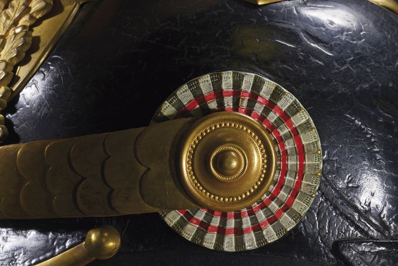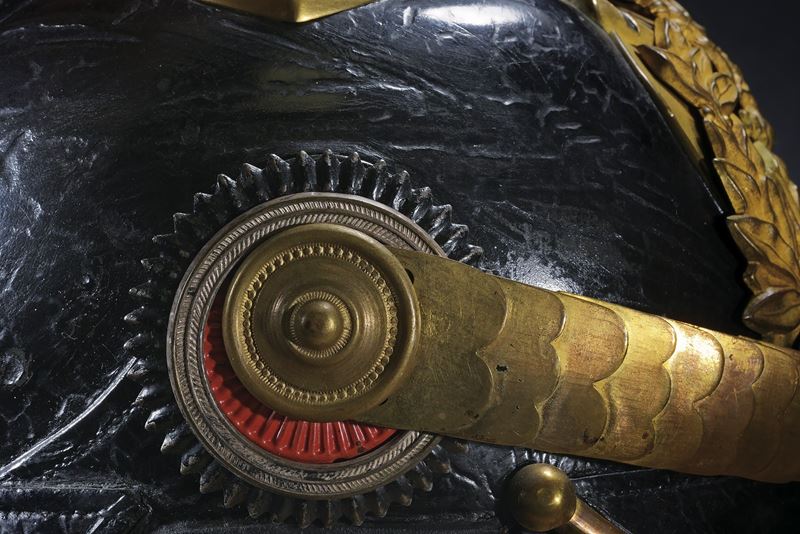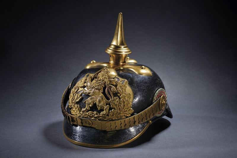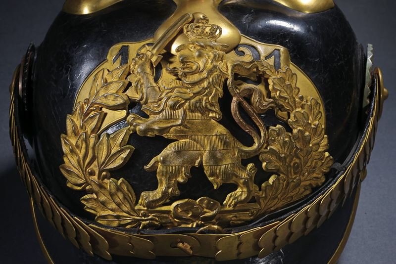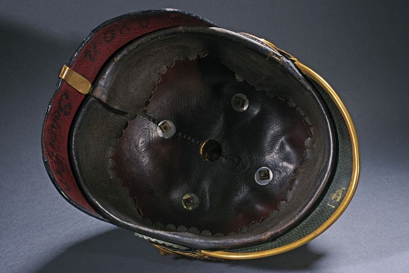 Nella forma pre 1897; coppo in cuoio, visiera tonda. Fornimenti dorati, puntale scanalato su base a croce; fregio frontale con leone entro fronde di lauro e quercia e bandeau "1621". Soggoli a squame piatte su entrambe le coccarde, quella del Reich e quella nei colori dell'Assia. L'interno con alluda in pelle e resti di cuffia in seta bordeaux; pochissimi resti del nome del proprietario. Raro.