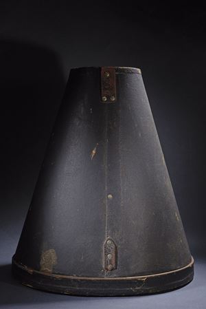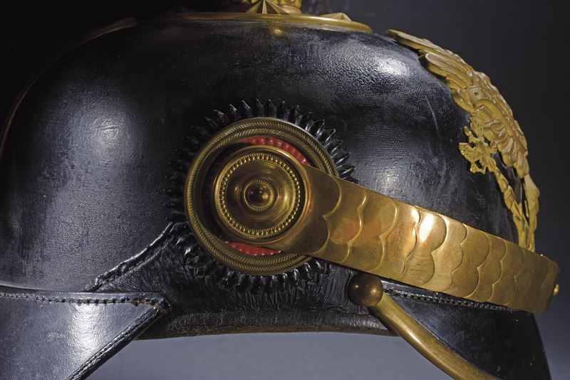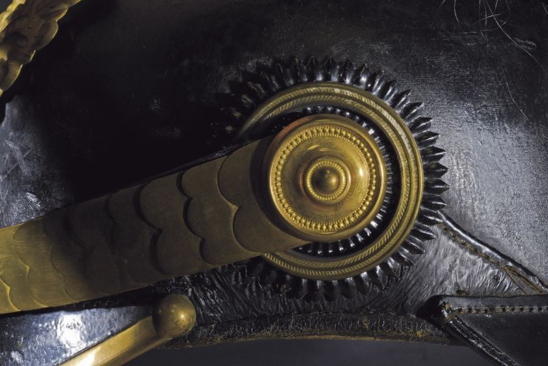 Coppo, visiera tonda e gronda in cuoio; tutti i fornimenti in ottone, alto puntale liscio con pennacchio in folto crine nero. All'interno manca una vite del fregio frontale ed è presente un restauro; alluda in pelle e cuffia in seta color verde. In custodia, resti delle cinghie.