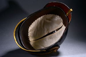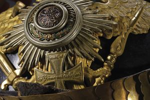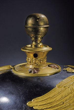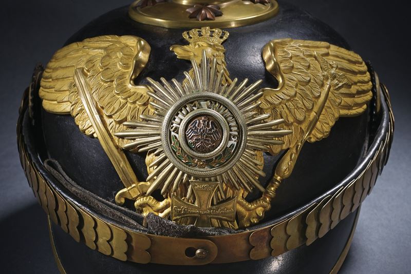 Coppo, visiera e gronda in cuoio annerito. Fregio frontale ad aquila della guardia dorata con stella parzialmente smaltata dell'Ordine dell'Aquila Nera, sotto la croce da riservisti. Puntale a palla su base tonda con rivetti a stella (uno mancante). Soggoli in ottone a squame piatte con entrambe le coccarde. All'interno alluda in pelle e cuffia in seta (la cuffia di epoca successiva).