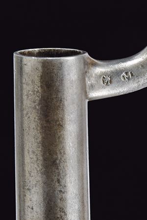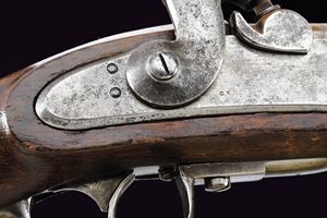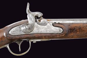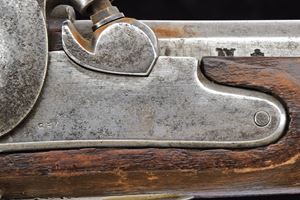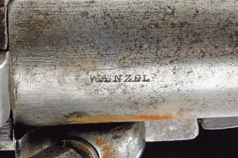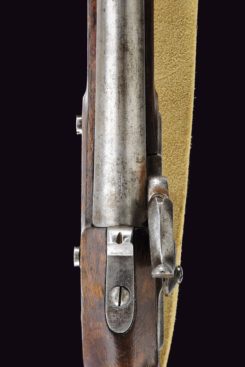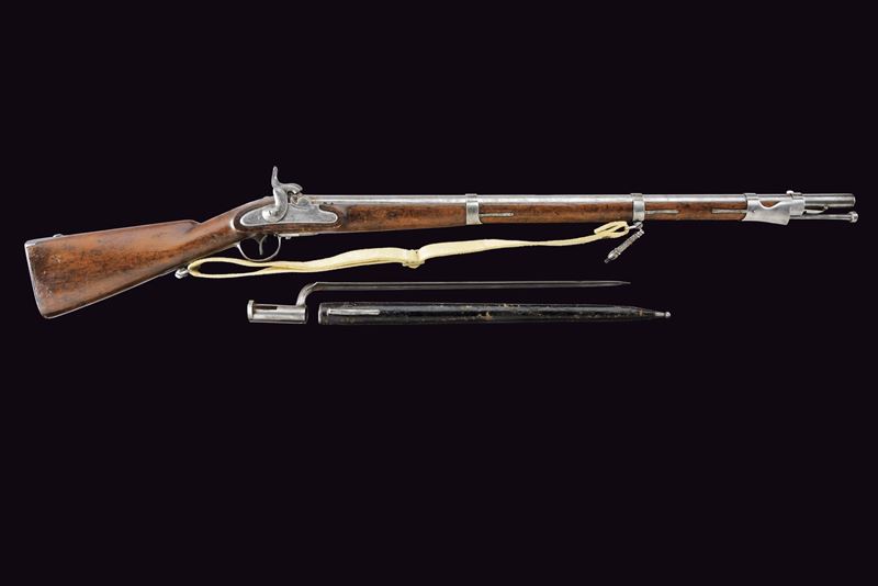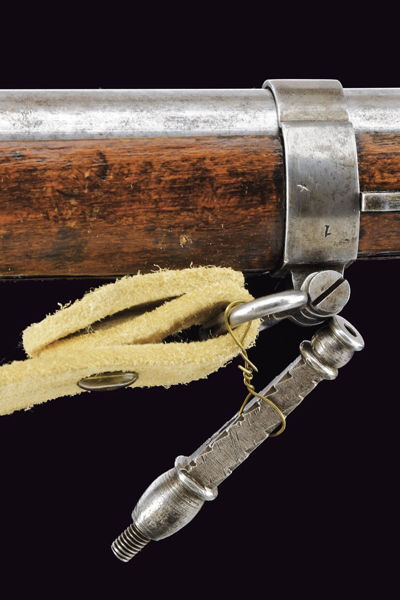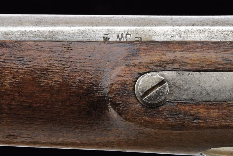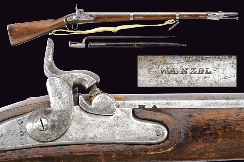 Canna tonda liscia, con base a fianchi piani marcata “WANZEL”, “ML”, “B” e altri punzoni; mirino; calibro 17 mm. Batteria a percussione con molla anteriore, marcata “854” e recante punzone imperiale; meccanica funzionante a due scatti. Cassa intera in legno. Fornimenti in ferro con alcune marcature. Bacchetta in ferro. Completo di baionetta a ghiera con varie marcature e relativo fodero. Cinghia in cuoio bianco. Insieme a un attrezzo per la pulizia della canna.