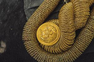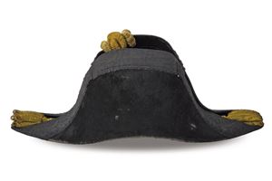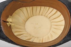 In feltro nero pettinato (coniglio?) con qualche segno d'usura, con gallone in fettuccia nera ricamata a fronde. Coccarda sempre nera. Ganza in spessa grovigliola intrecciata. Bottone dorato con emblema della marina imperiale in rilievo (Sakura su àncora). Maccheroni sempre in grovigliola dorata. Fascia in alluda con lievi segni d'uso e del tempo. Cuffia in seta bianca ben conservata con marcature in ideogrammi.