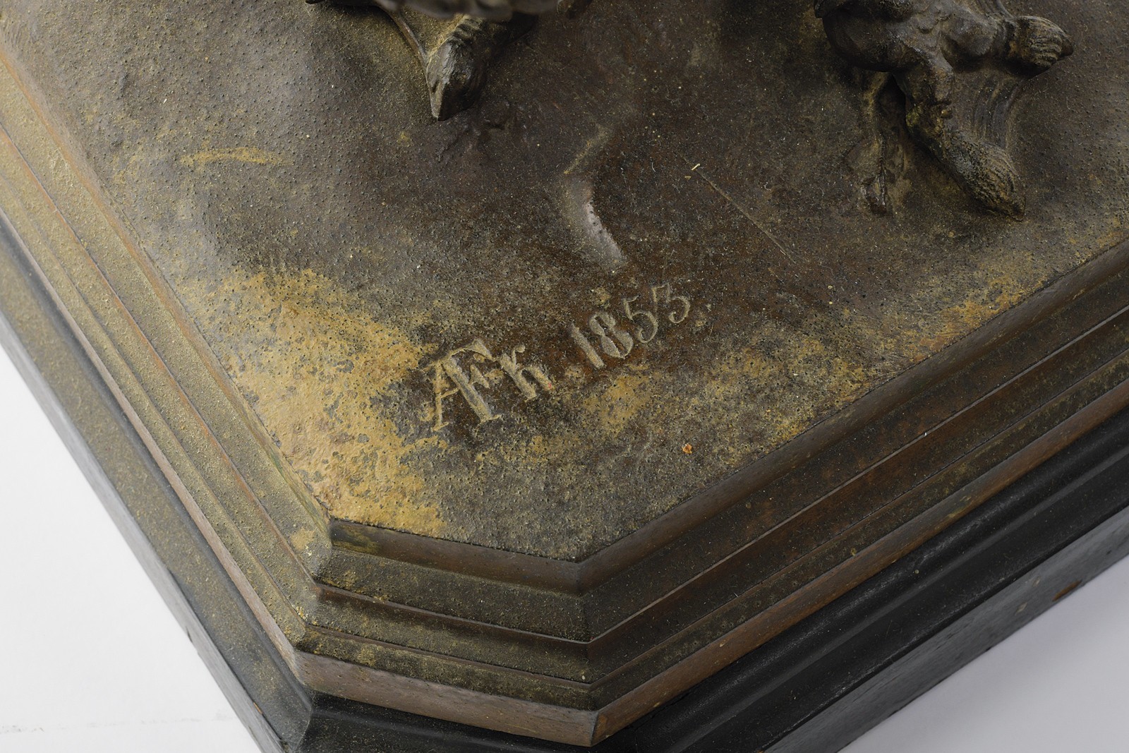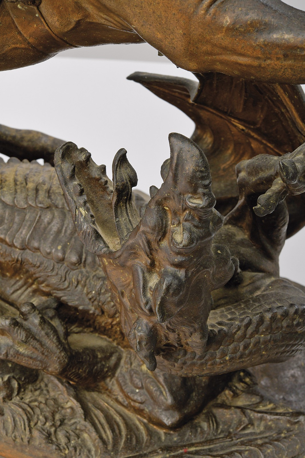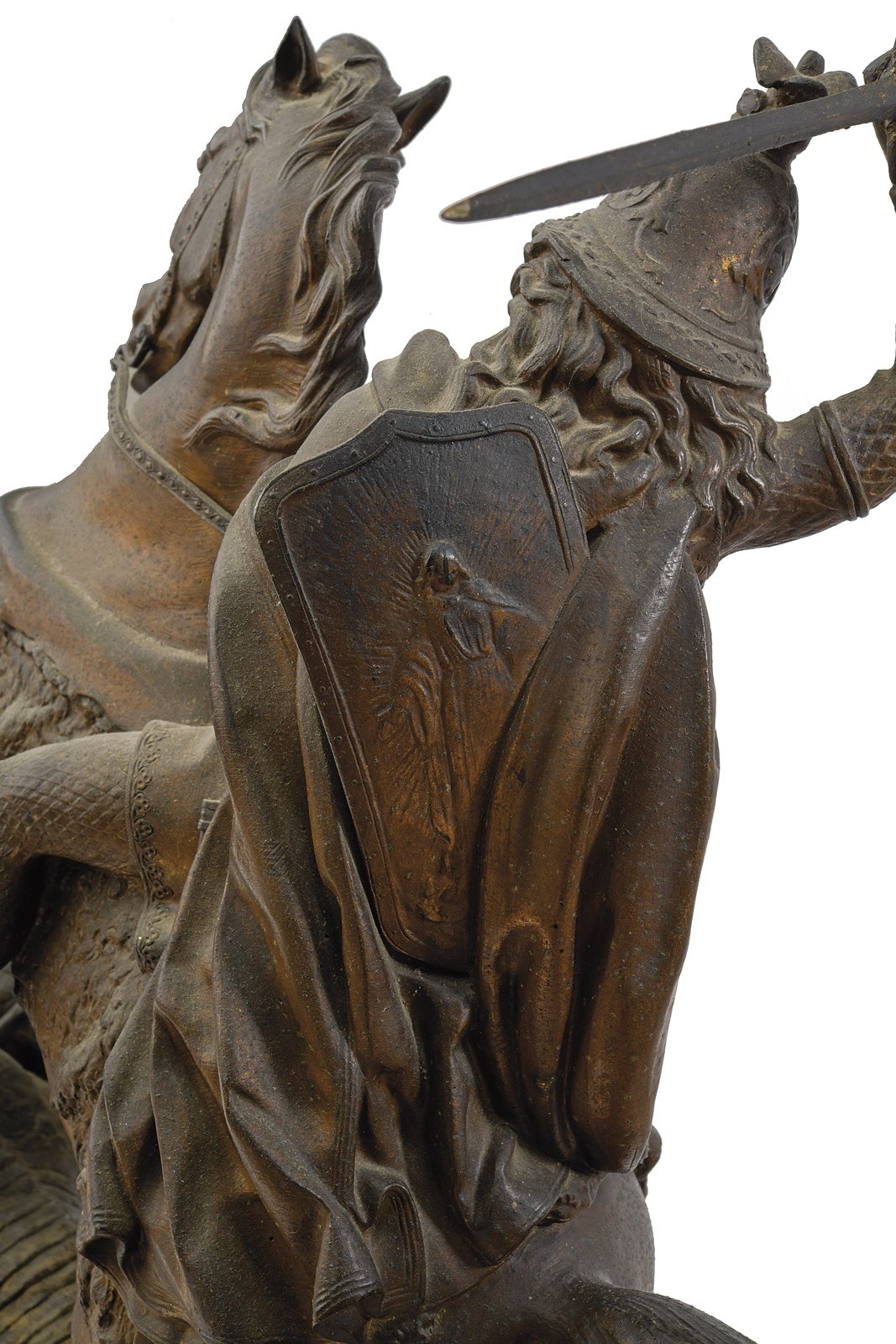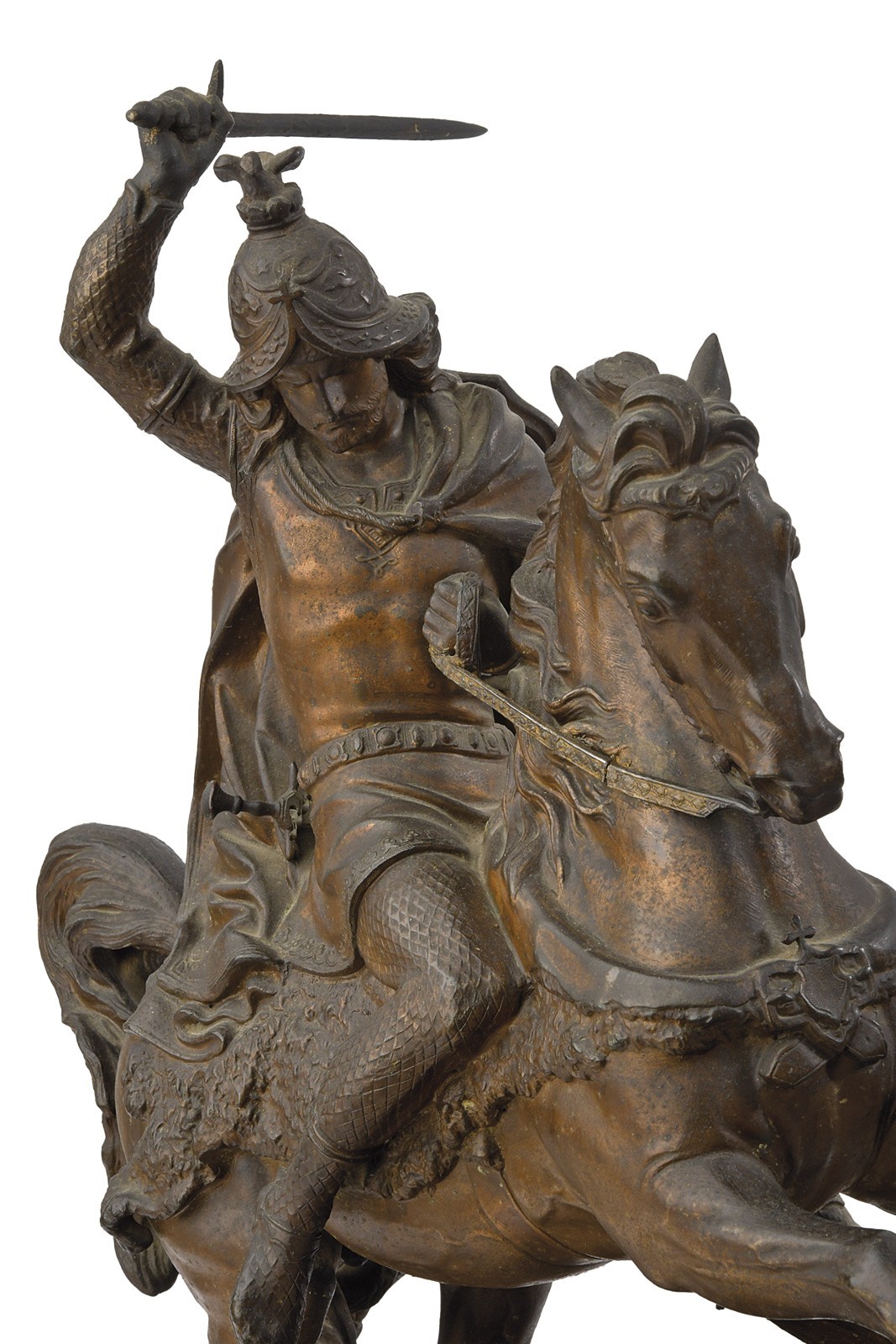 Bellissima replica ottocentesca in metallo bianco bronzato raffigurante San Giorgio che indossa l'armatura completa, con elmo crestato e mantello al vento, con la mano destra alza la spada per infliggere il colpo finale al drago. Sulla spalla uno scudo con effige della madre di dio. Sotto marcato "AFK 1853". La base in legno.