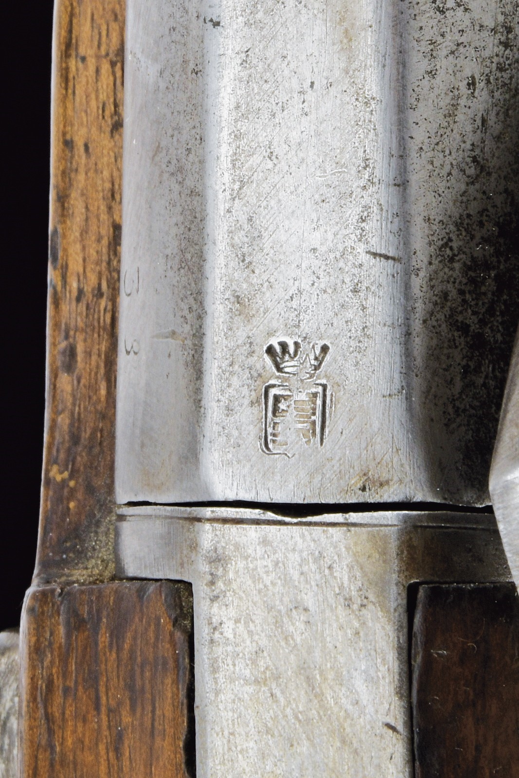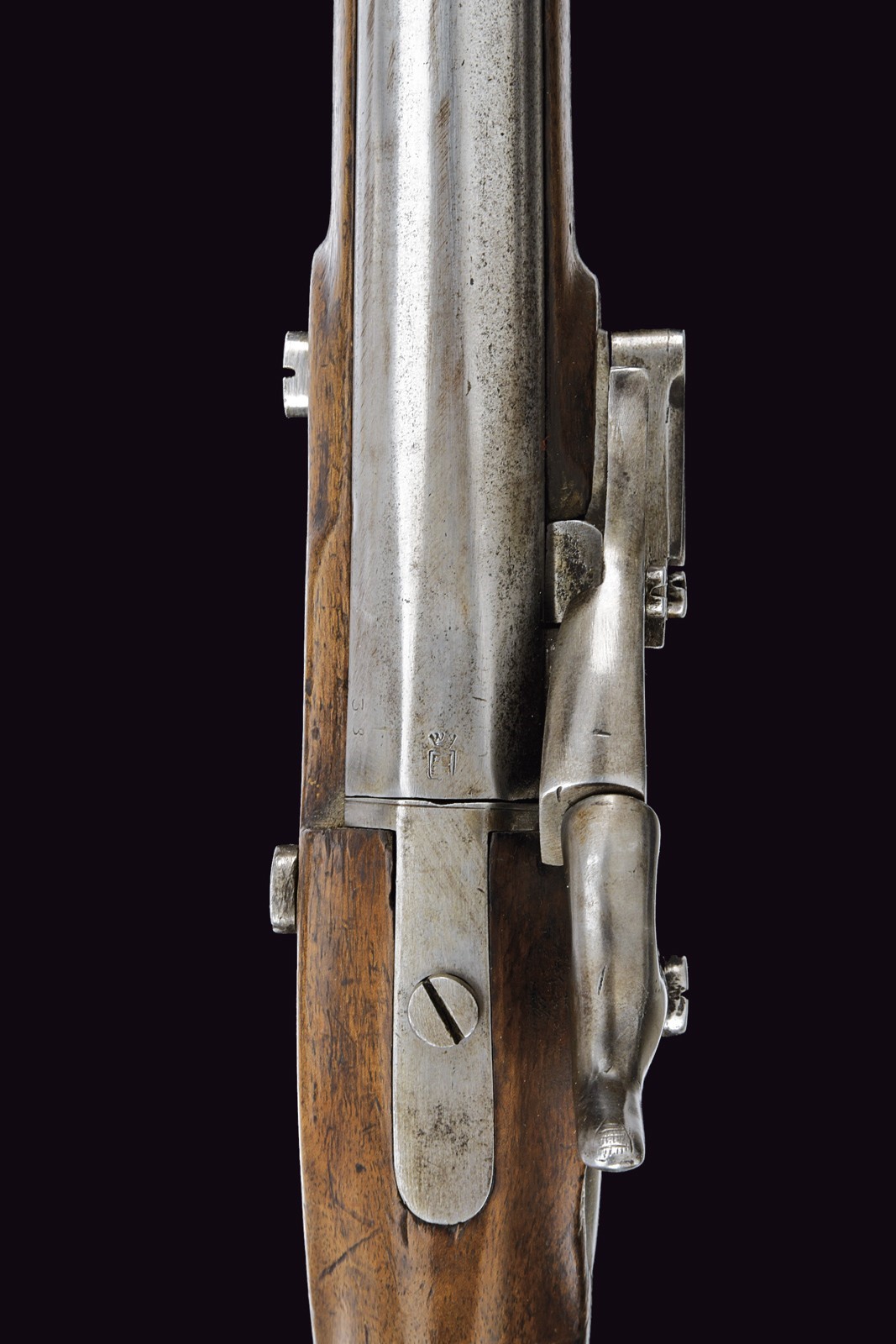 Canna liscia, tonda, con base ottagonale, marcata con un punzone poco leggibile, dotata di attacco per la baionetta; cal. 18 mm. Codetta liscia. Batteria a luminello con pochi resti di una firma e con copri-luminello. Cassa intera in legno con fornimenti in ottone; il primo reggicanna reca il mirino. Bacchetta in ferro.