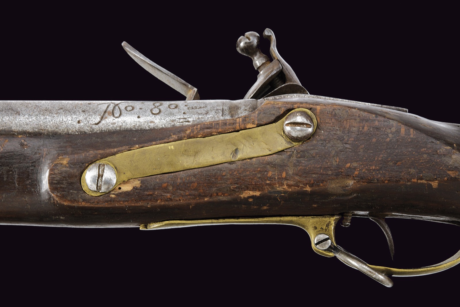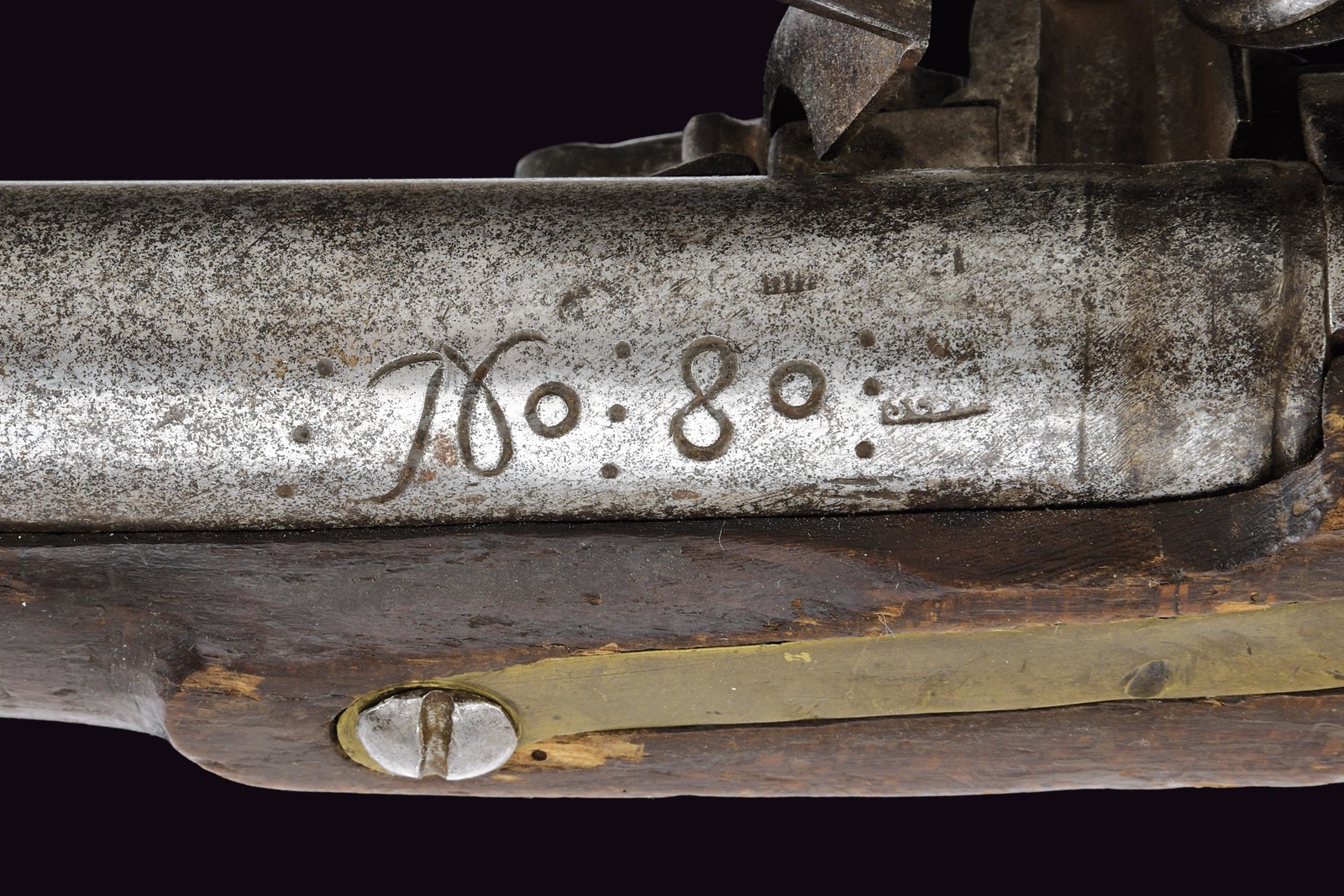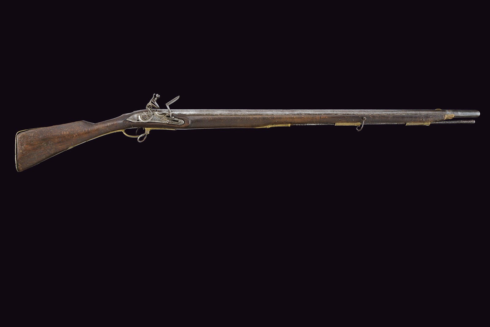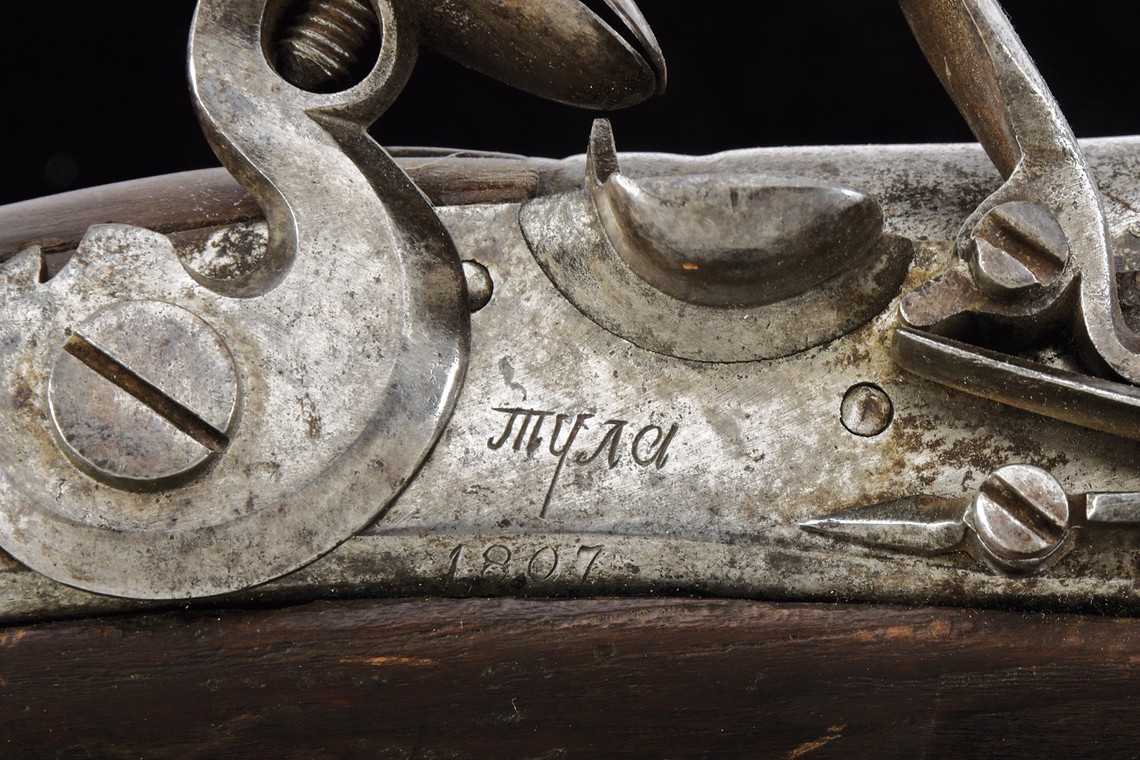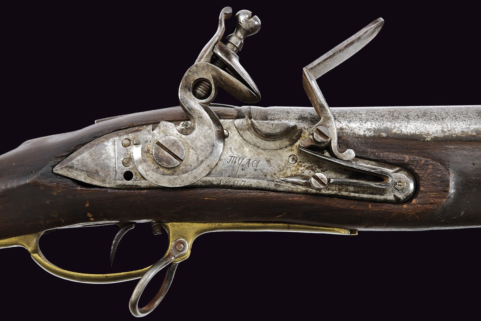Cana tonda, liscia; la base recante sgusciatura ad anello, resti di punzoni e numerazione; alla volata mirino in ottone e dente d'innesto per la baionetta; cal. 19 mm. Batteria a pietra focaia con cartella piatta con bordi obliqui; marcata Tula in cirillico e datata "1807". Cassa intera in legno (alcuni difetti, segni d'uso e del tempo) con fornimenti in ottone; il ponticello punzonato e il calciolo recante aquila bicipite incisa e numeri di reparto con cifre cirilliche e numeri. Manca la fascetta alla volata. Bacchetta in ferro (danni da ruggine). Raro.