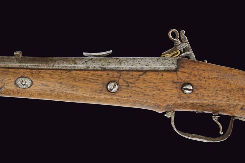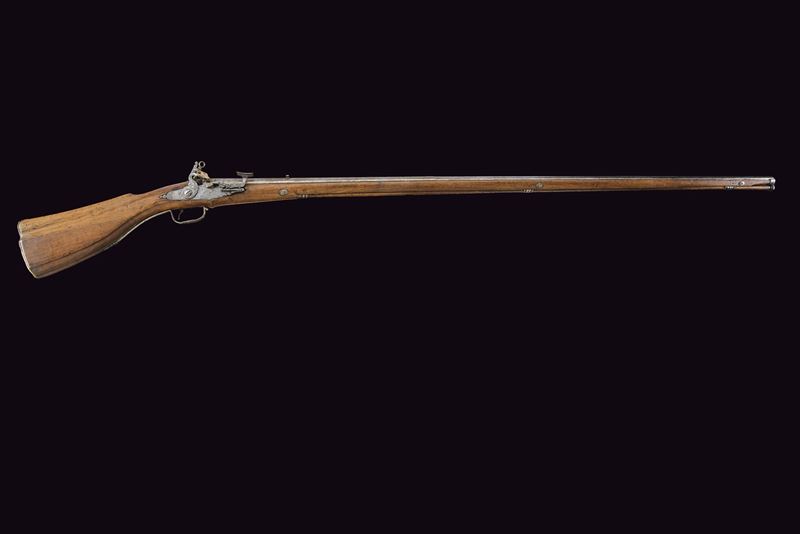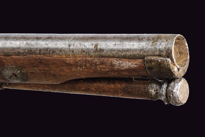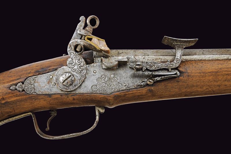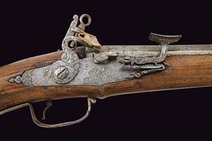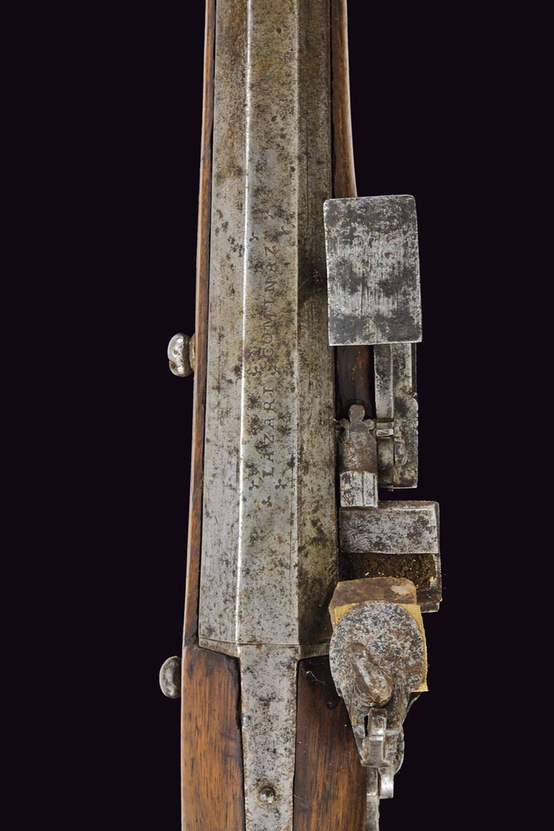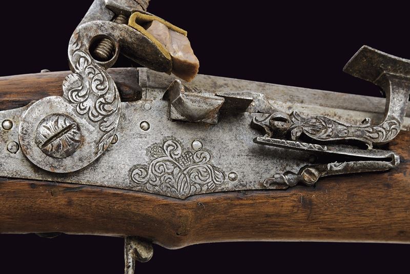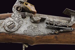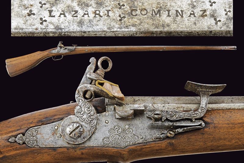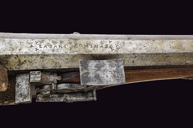 Lunga canna a due ordini, liscia, quadra e tonda con cornicette al cambio, munita di tacca di mira e mirino a sella; marcata alla camera di scoppio "LAZARI COMINAZ" (per Lazarino Cominazzo; cal. 16.5 mm. Bella batteria arcaica alla fiorentina, cartella piatta incisa a volute e racemi, come pure il cane ed il collo della martellina; scodellino scorrevole. Cassa intera in noce con calcio scanalato a forma di prosciutto, calciolo in ferro con placchetta in incisa da stemma nobiliare e data "1656". Fornimenti in ferro, con ponticello e passanti della bacchetta scanalati. Bacchetta originale in legno con cavastracci e battipalla torniti in ferro.