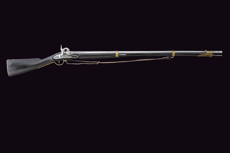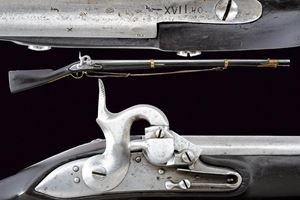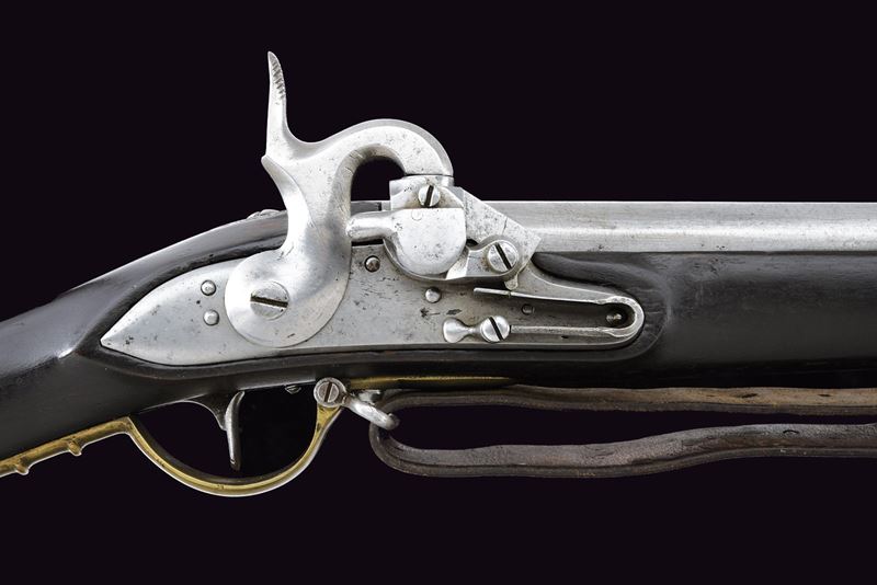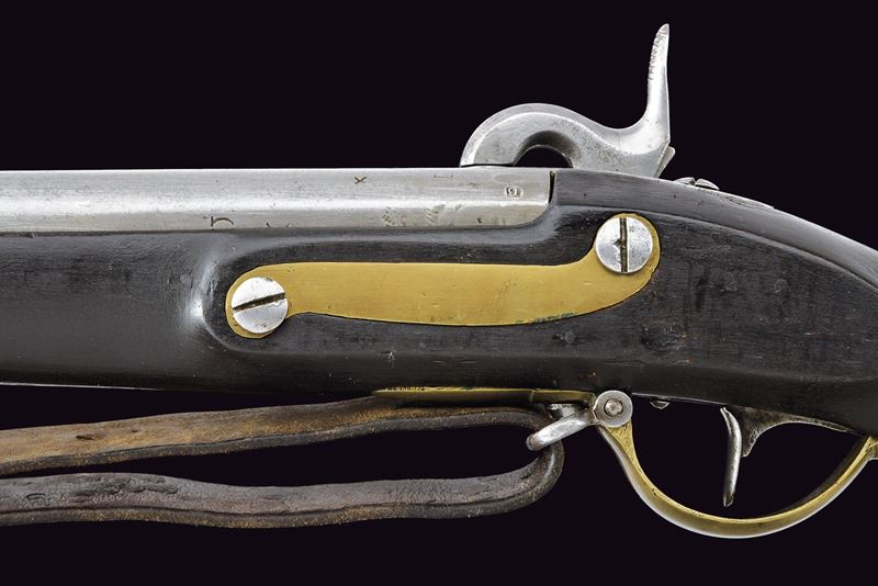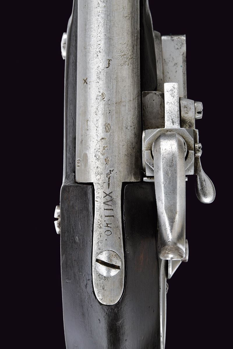 Canna tonda liscia, con fianchi appiattiti alla base; vari punzoni fra i quali “B”, “X”, “M” e altri; calibro 18 mm. Batteria ridotta con sistema Augustin, meccanica funzionante. Cassa intera in legno annerito con fornimenti in ottone. Bacchetta in ferro. Lungo bocchino. Cinghia in cuoio.
