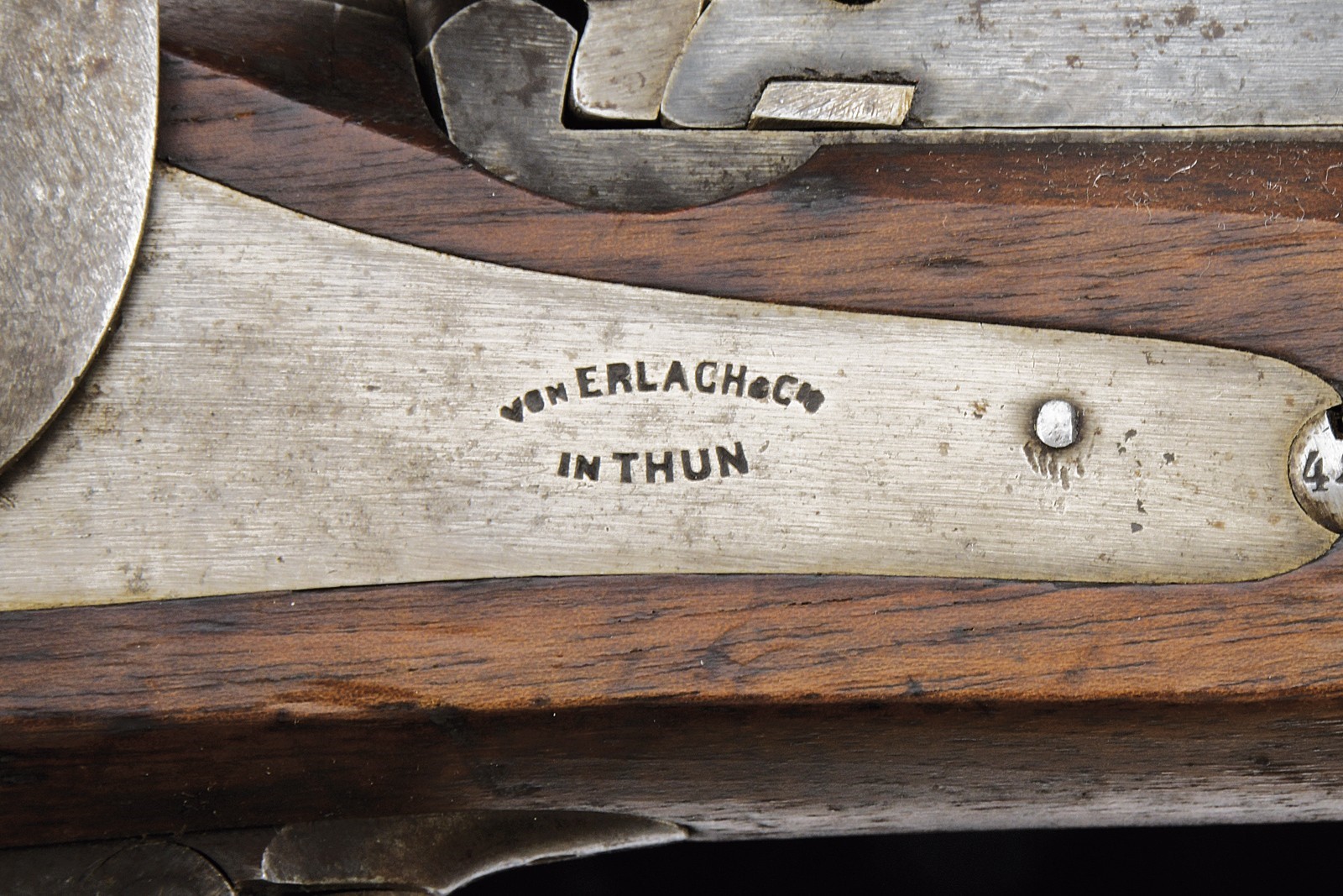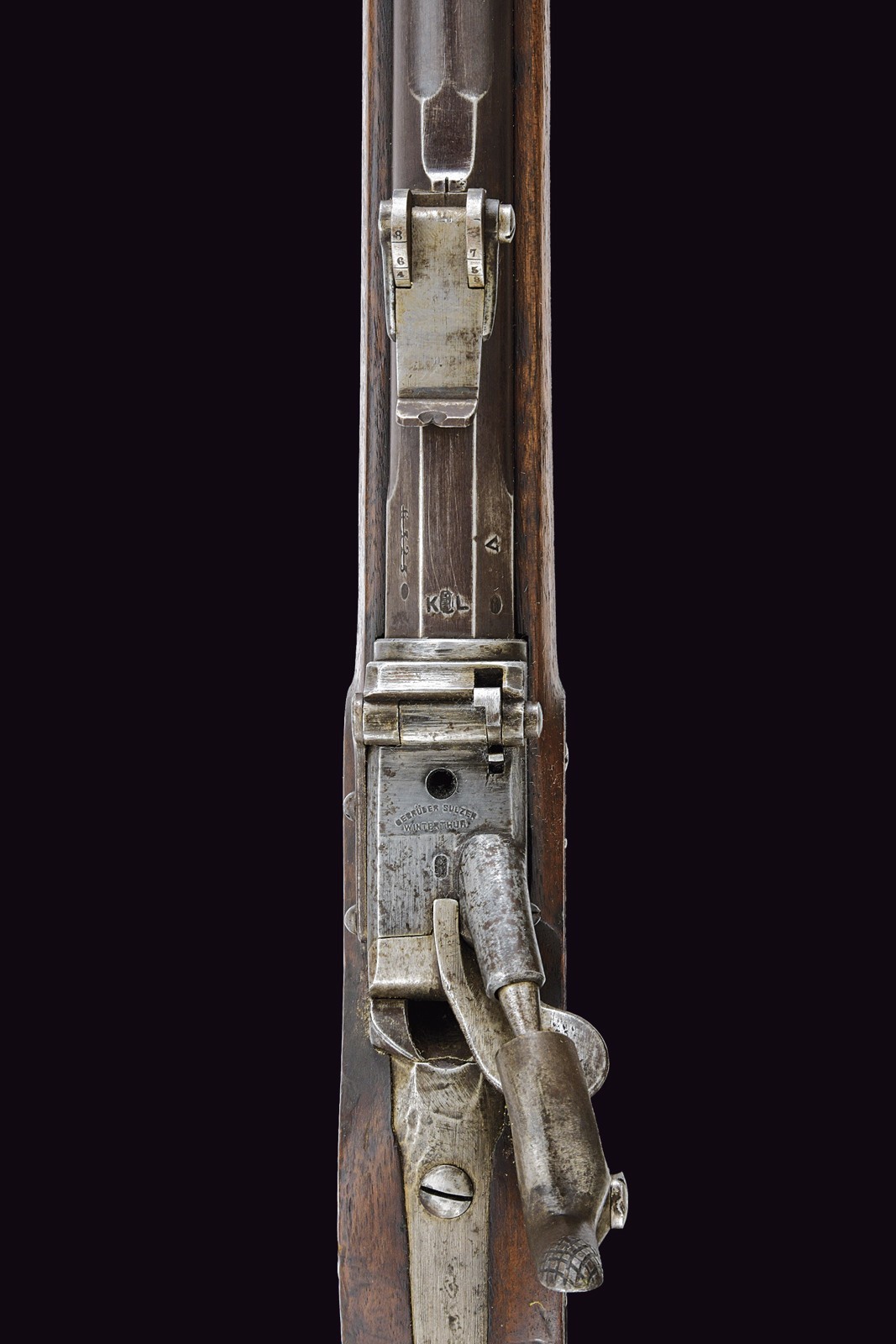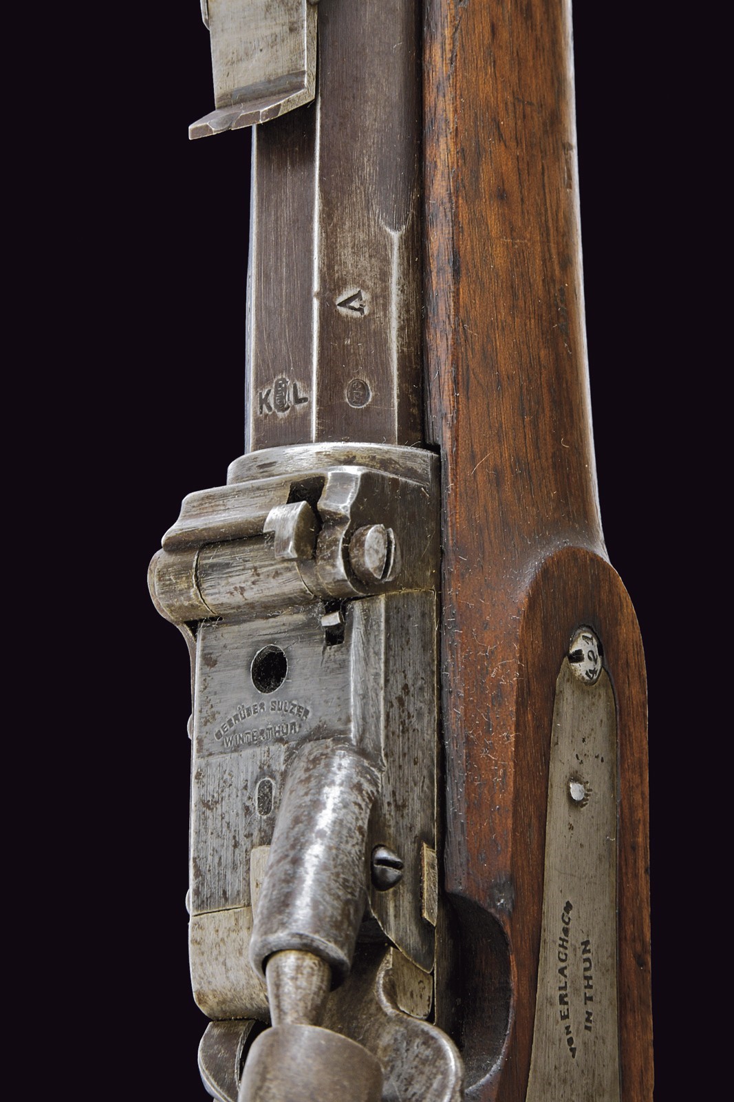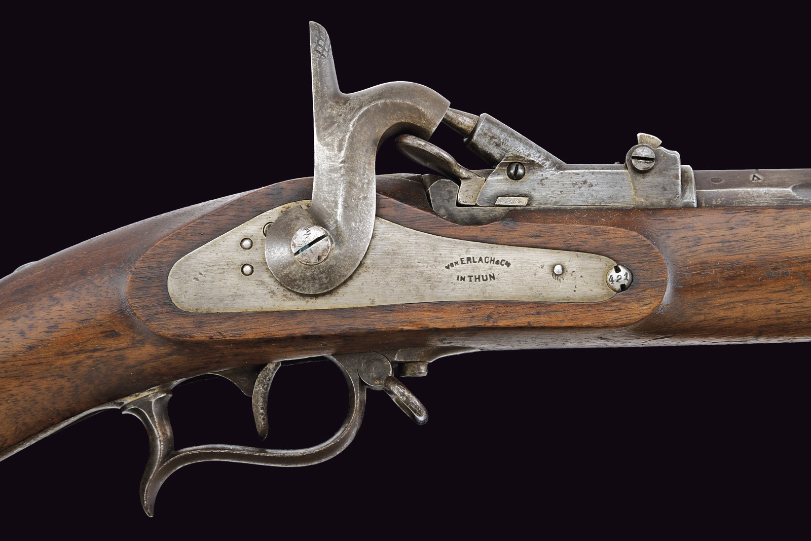 Canna tonda rigata con mirino, alzo regolabile, culatta ottagonale con punzoni e matricola "63xx" , cal. 11 mm. Otturatore ribaltabile marcato "BEBRÜBER SULZER VINTERTHUR". Batteria a molla in avanti marcata "v. ERLACH & Cie THUN". Cassa intera in legno. Fornimenti in ferro con punzoni (alcuni danni da ruggine superficiale). Bacchetta in ferro sostituita.
