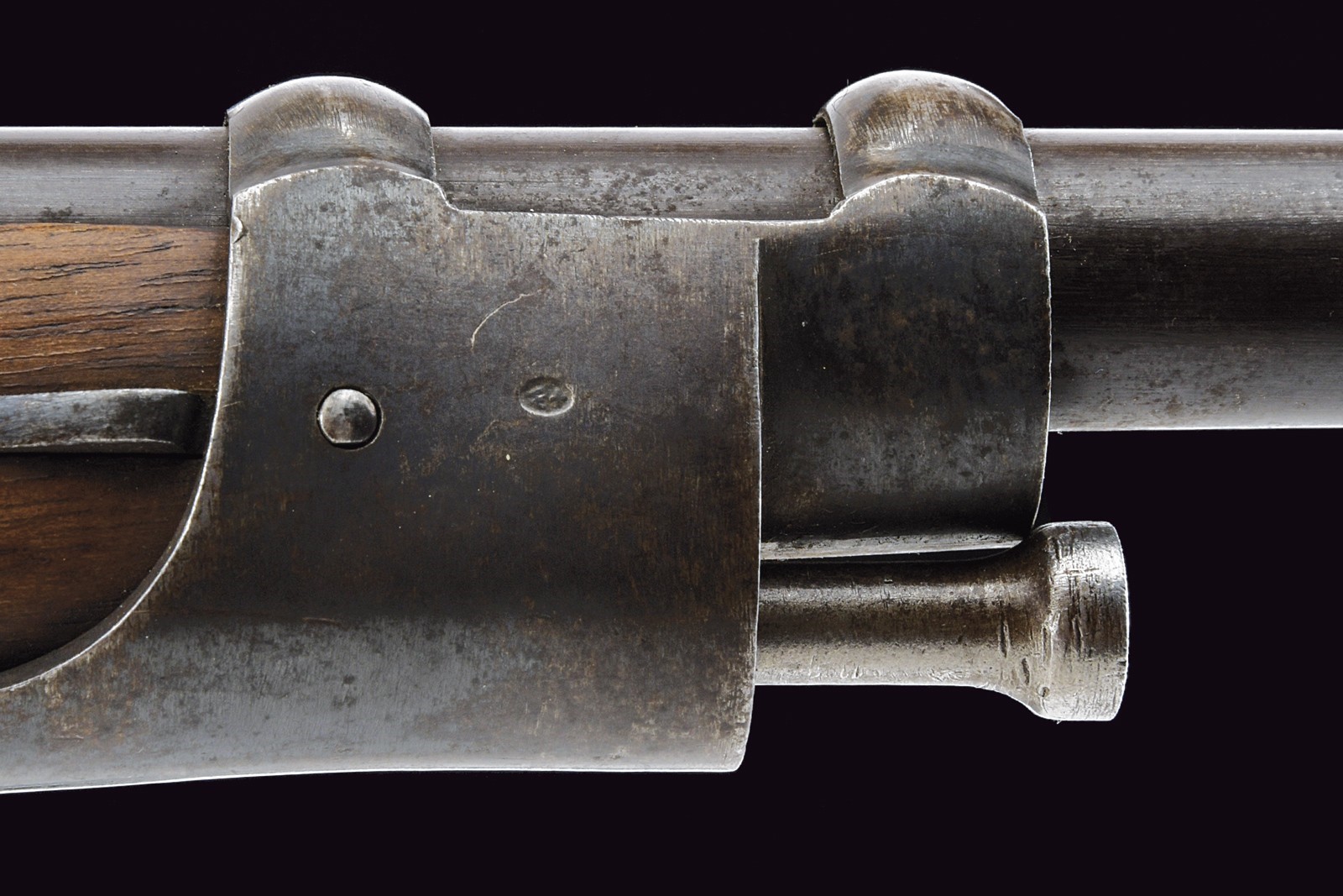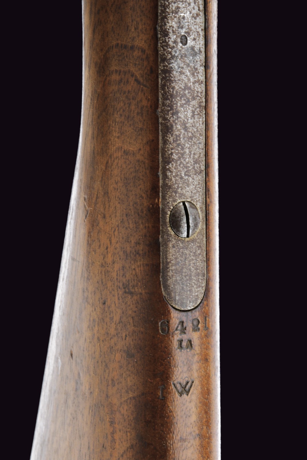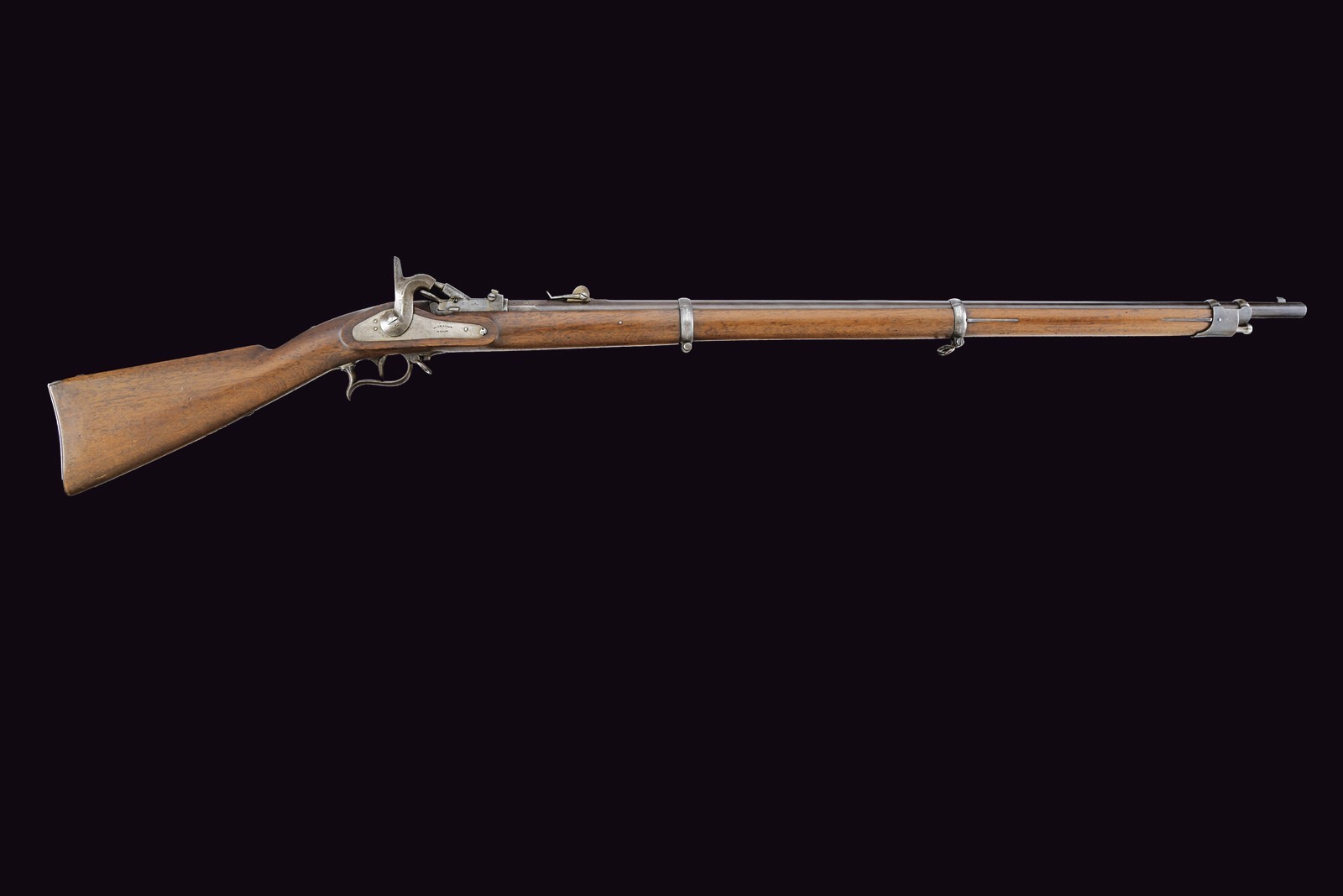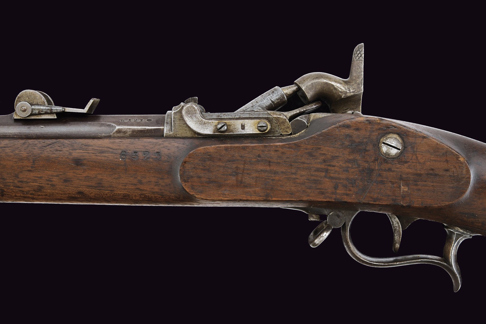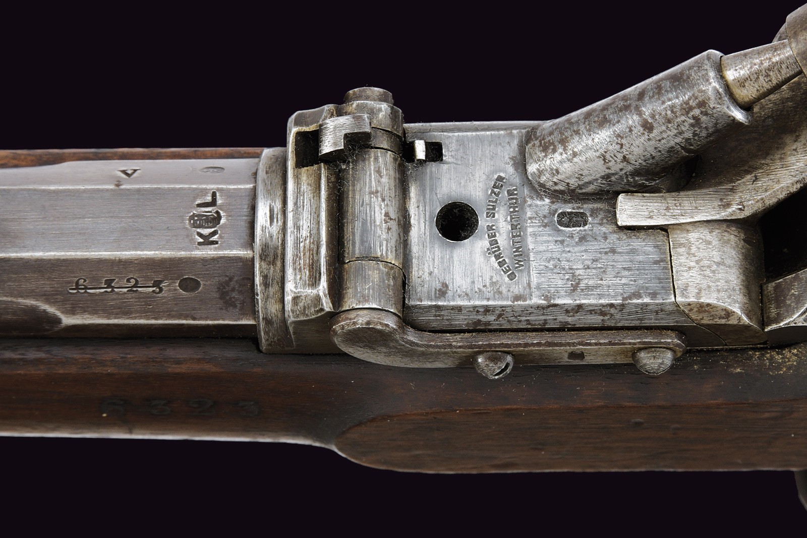 Canna tonda rigata con mirino, alzo regolabile, culatta ottagonale con punzoni e matricola "63xx" , cal. 11 mm. Otturatore ribaltabile marcato "BEBRÜBER SULZER VINTERTHUR". Batteria a molla in avanti marcata "v. ERLACH & Cie THUN". Cassa intera in legno. Fornimenti in ferro con punzoni (alcuni danni da ruggine superficiale). Bacchetta in ferro sostituita.