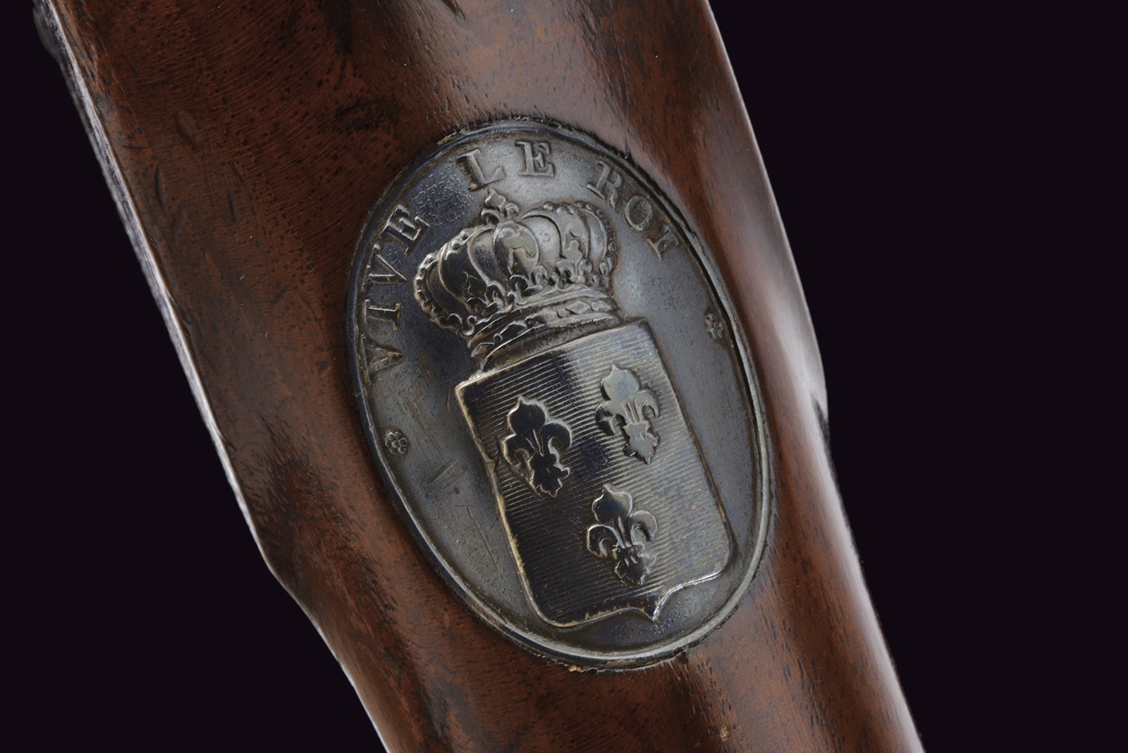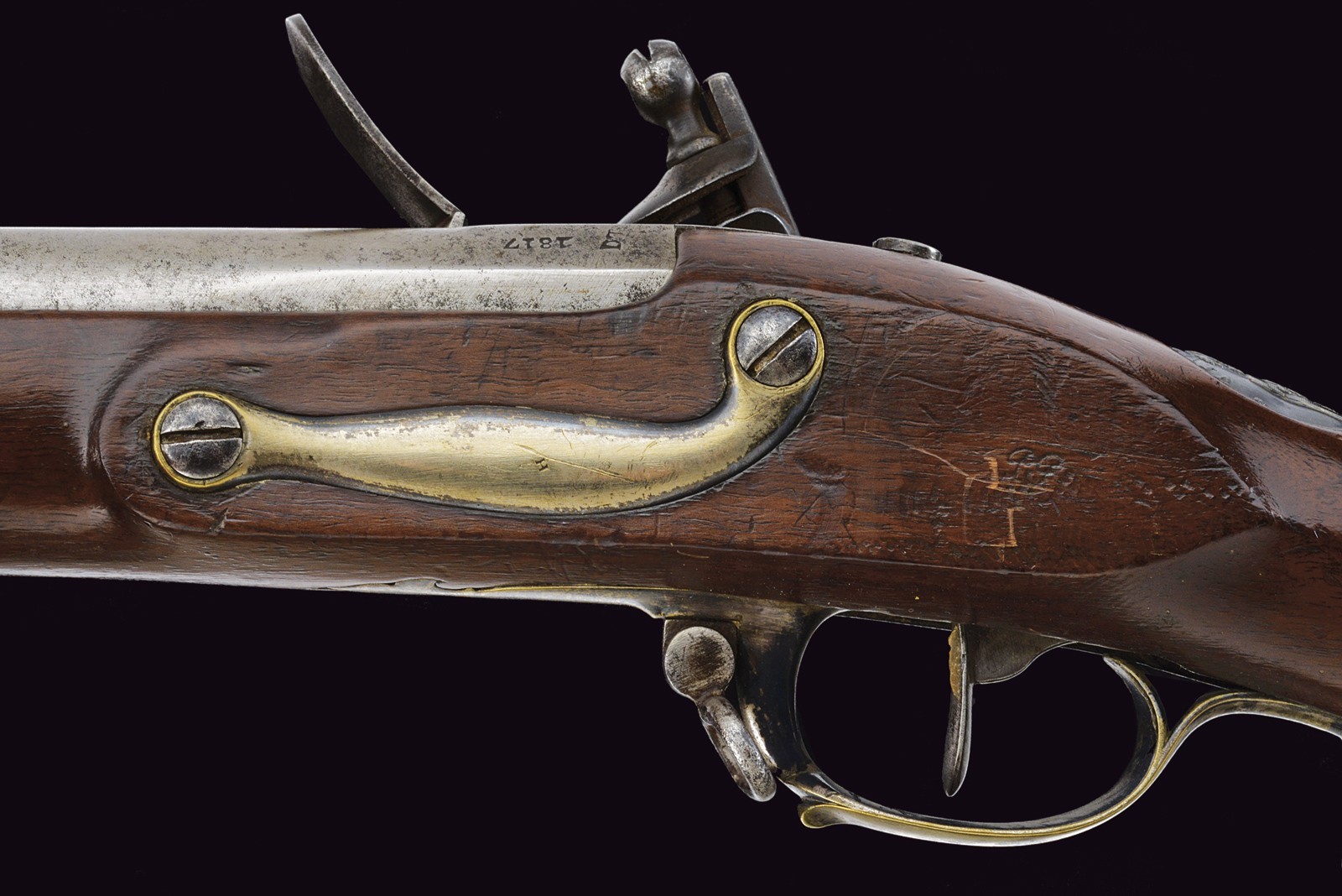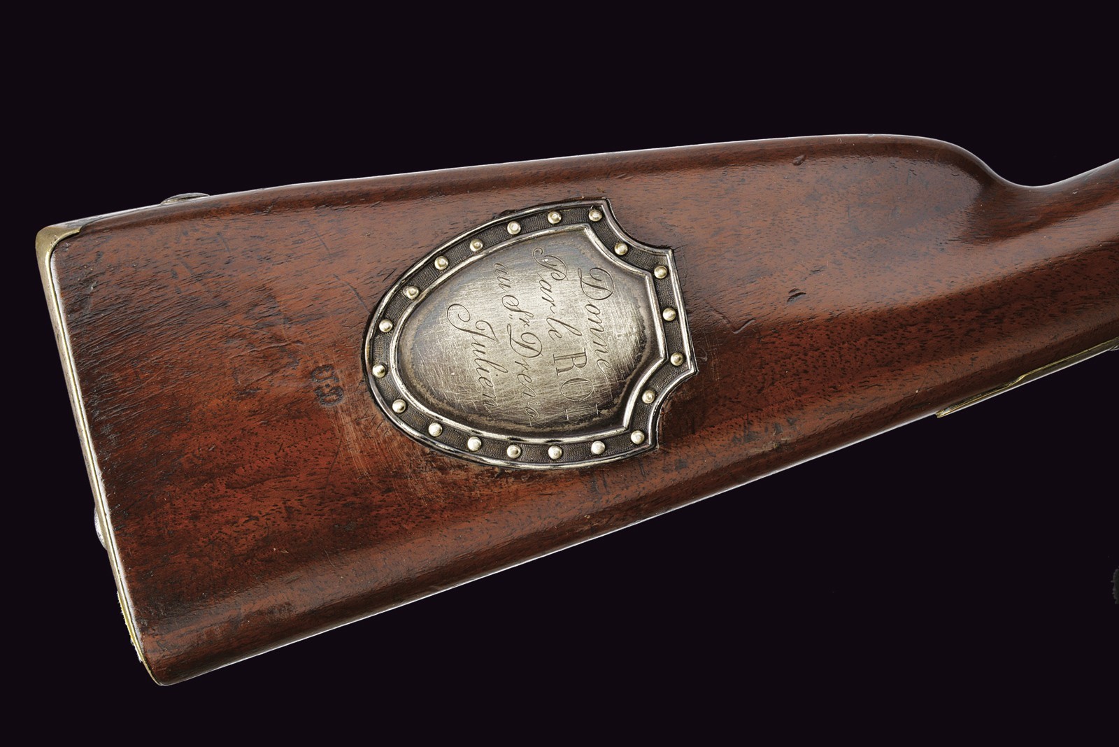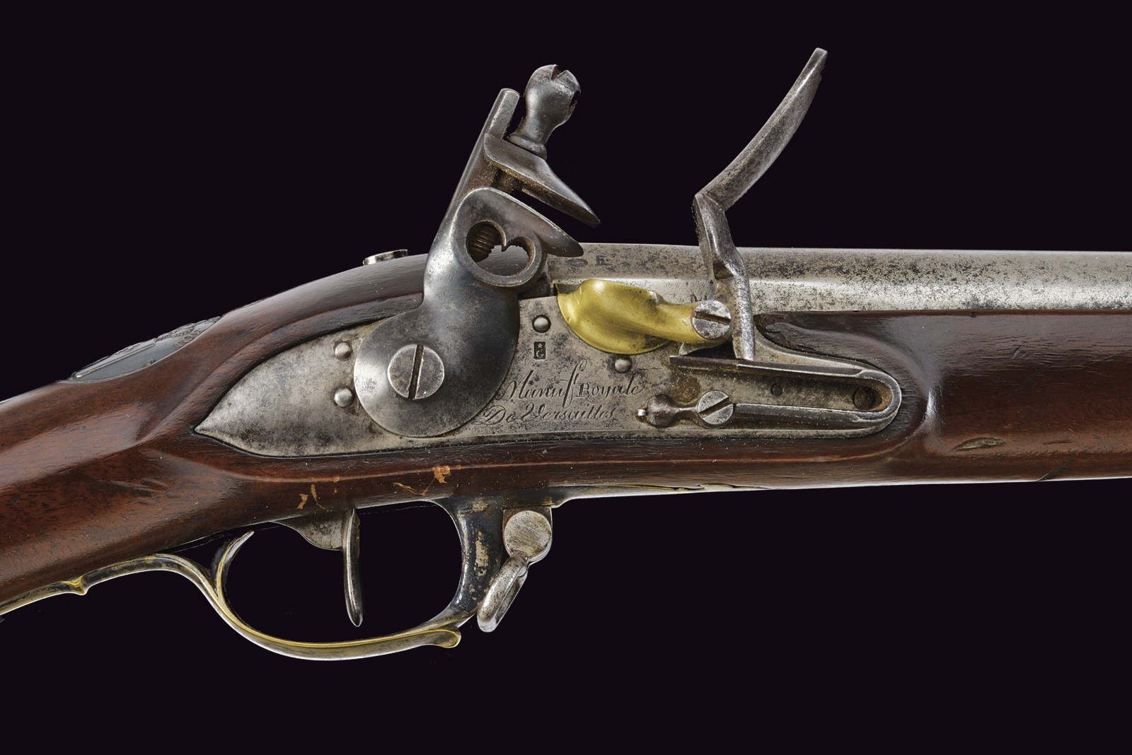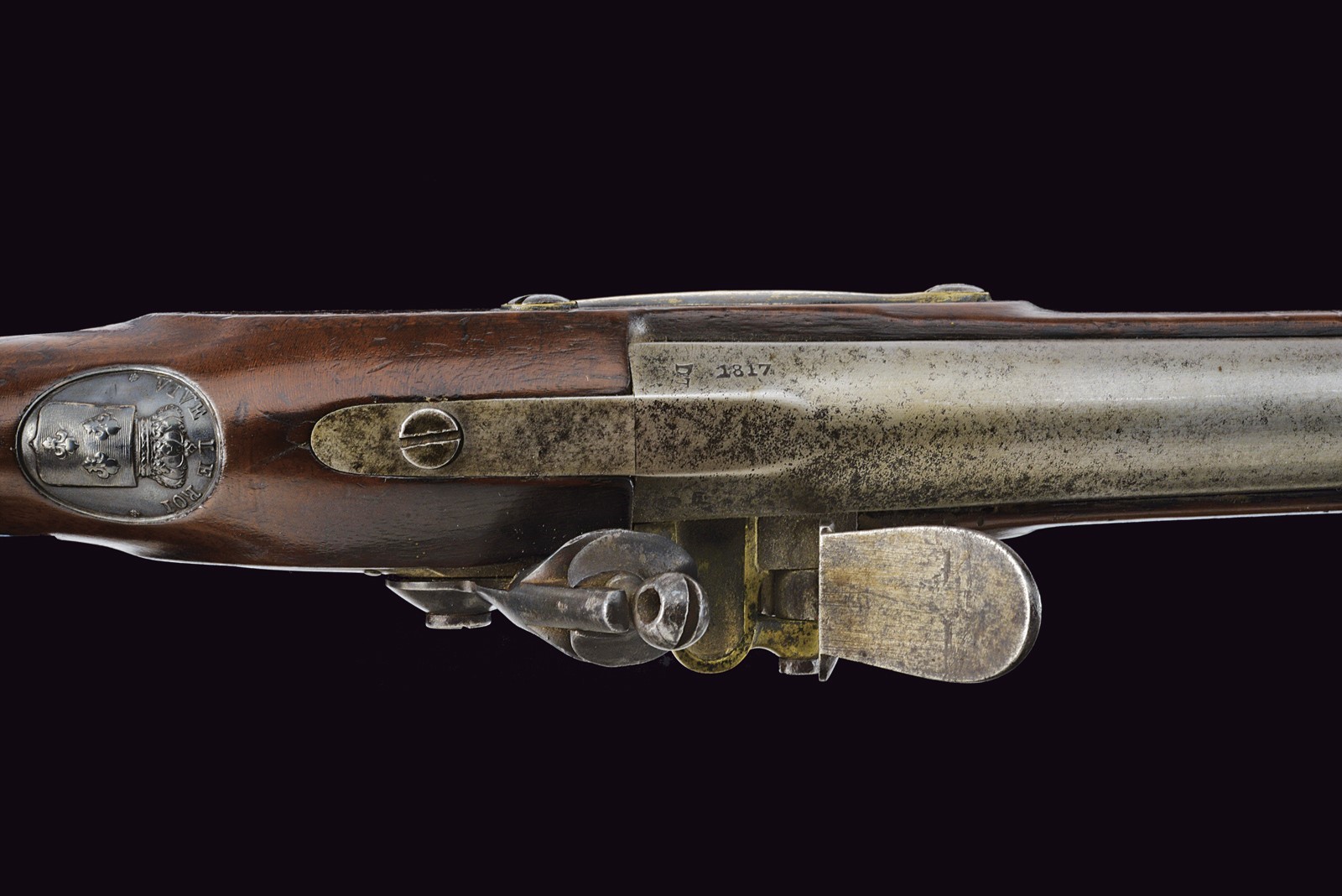 Modello uguale a quello della Guardia. Canna liscia tonda con base ottagonale marcata "DT", datata "1817" e con due altri punzoni poco leggibili, mirino sul bocchino, attacco per la baionetta, cal. 17 mm; codetta liscia; batteria firmata "Manuf. Royale de Versailles", munito di punzone "G" sotto stella e con scodellino in ottone. Meccanica funzionante a due scatti. Cassa intera in legno con resti di un timbro sulla parte della contropiastra. Alcuni fornimenti in argento marcati "H". Sul dorso scudetto ovale in argento con stemma reale (a tre gigli sormontati dalla corona reale) con motto "VIVE LE ROI". Sulla guancia destra placca in argento a forma di scudetto recante la iscrizione "Donne par le ROI au Sr. Drevo Julien". Bacchetta in ferro. Il fucile è accompagnato dal brevetto reale che attesta l’attribuzione a Drevo, firmato da re Luigi XVIII e dal Ministro della Guerra in data 11 luglio 1817. Il documento reca stemma reale e timbro in carta, presentato in cornice e sotto vetro.