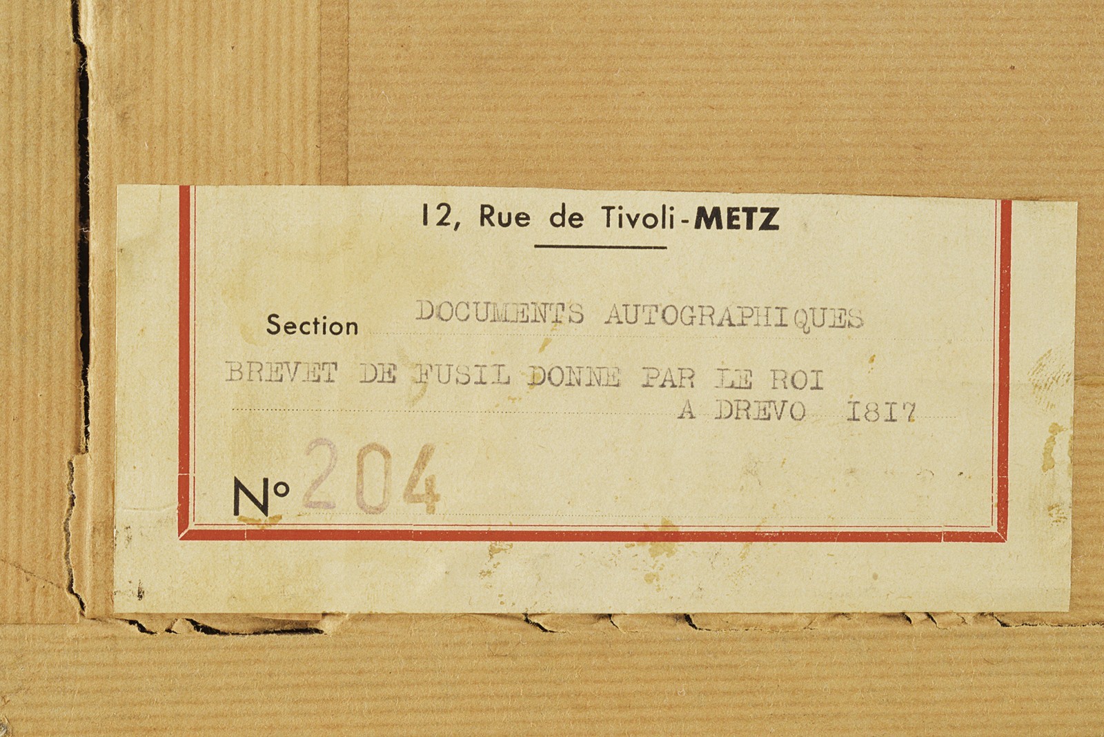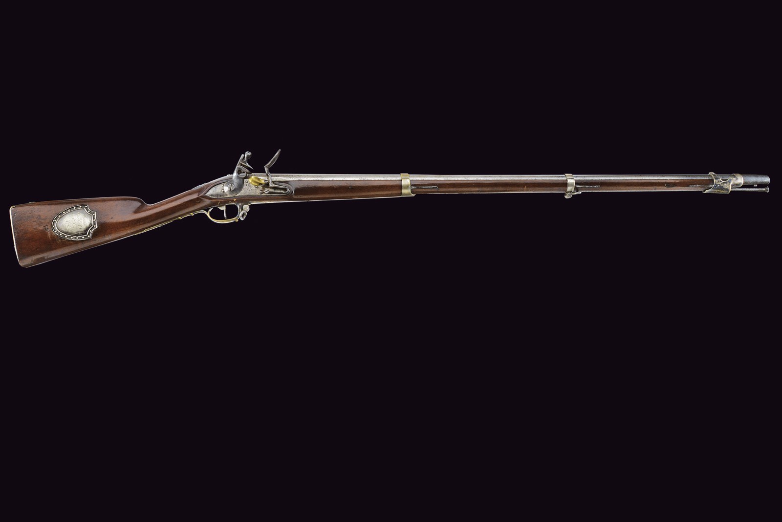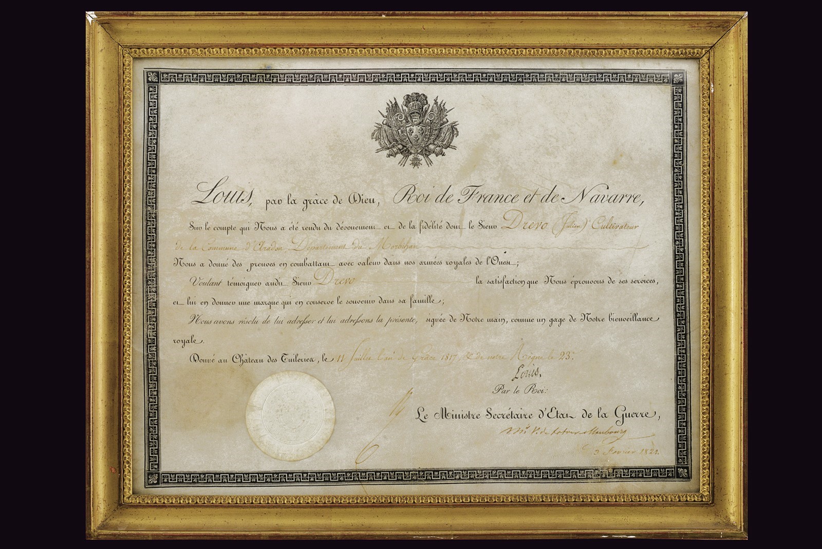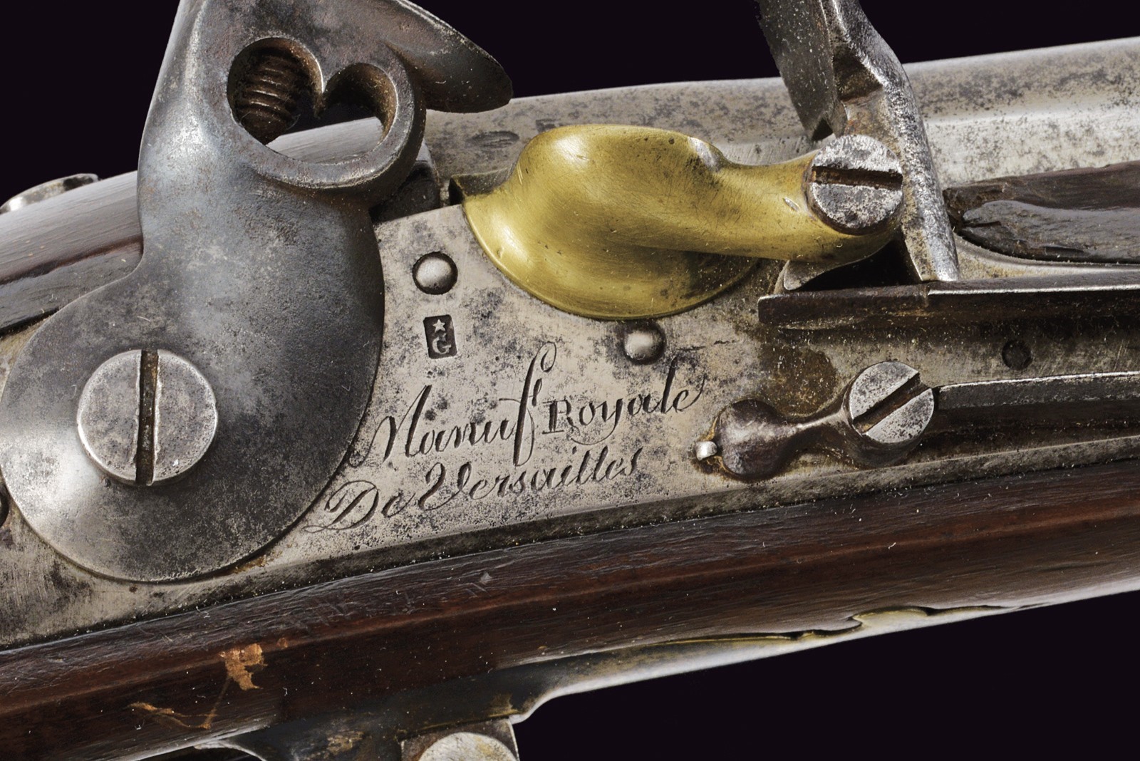 Modello uguale a quello della Guardia. Canna liscia tonda con base ottagonale marcata "DT", datata "1817" e con due altri punzoni poco leggibili, mirino sul bocchino, attacco per la baionetta, cal. 17 mm; codetta liscia; batteria firmata "Manuf. Royale de Versailles", munito di punzone "G" sotto stella e con scodellino in ottone. Meccanica funzionante a due scatti. Cassa intera in legno con resti di un timbro sulla parte della contropiastra. Alcuni fornimenti in argento marcati "H". Sul dorso scudetto ovale in argento con stemma reale (a tre gigli sormontati dalla corona reale) con motto "VIVE LE ROI". Sulla guancia destra placca in argento a forma di scudetto recante la iscrizione "Donne par le ROI au Sr. Drevo Julien". Bacchetta in ferro. Il fucile è accompagnato dal brevetto reale che attesta l’attribuzione a Drevo, firmato da re Luigi XVIII e dal Ministro della Guerra in data 11 luglio 1817. Il documento reca stemma reale e timbro in carta, presentato in cornice e sotto vetro.