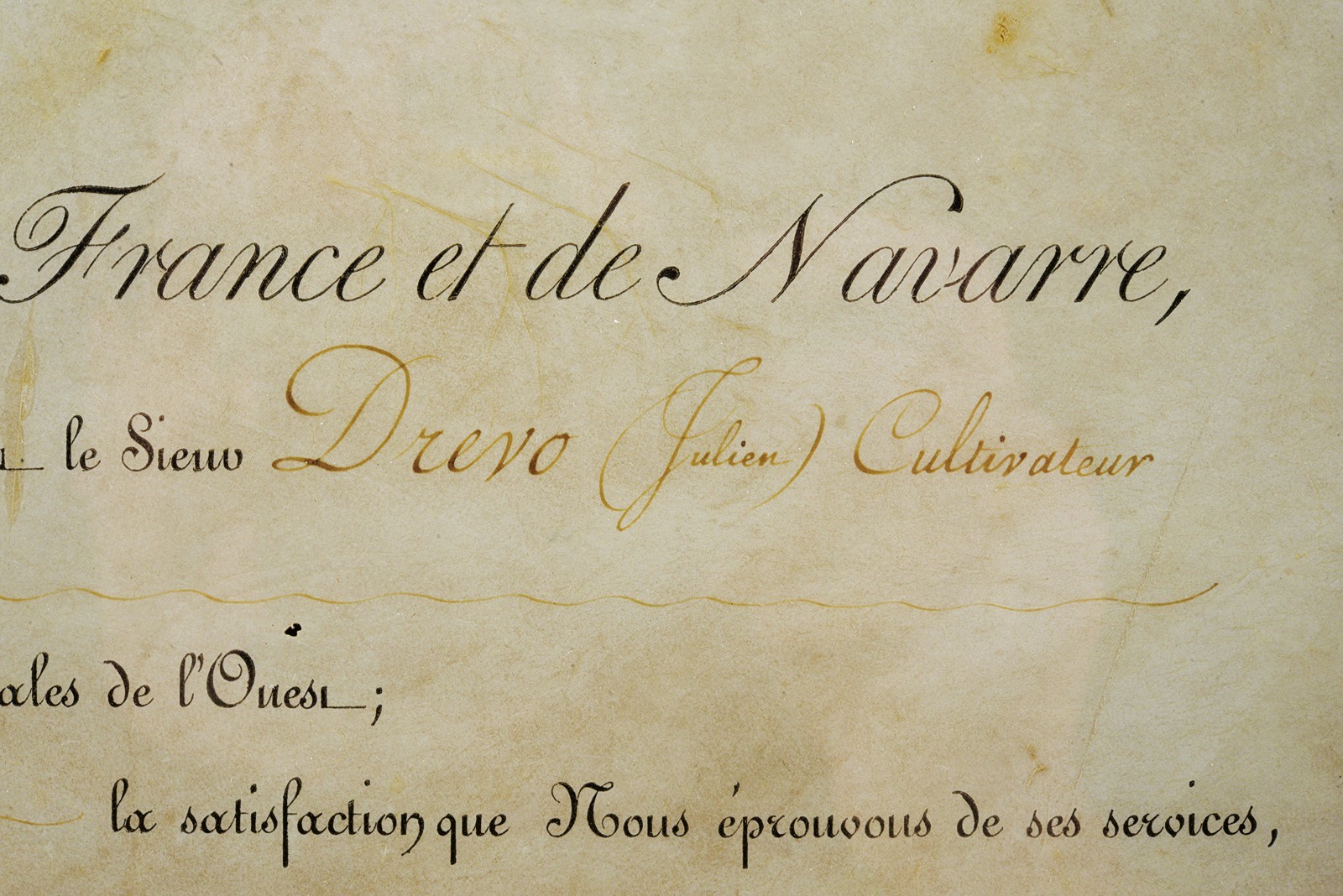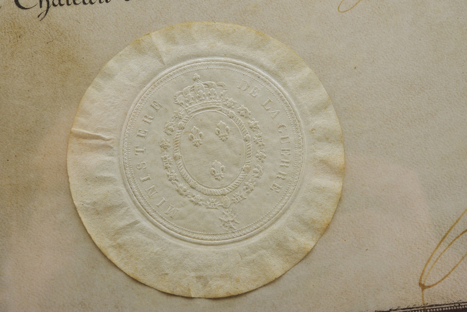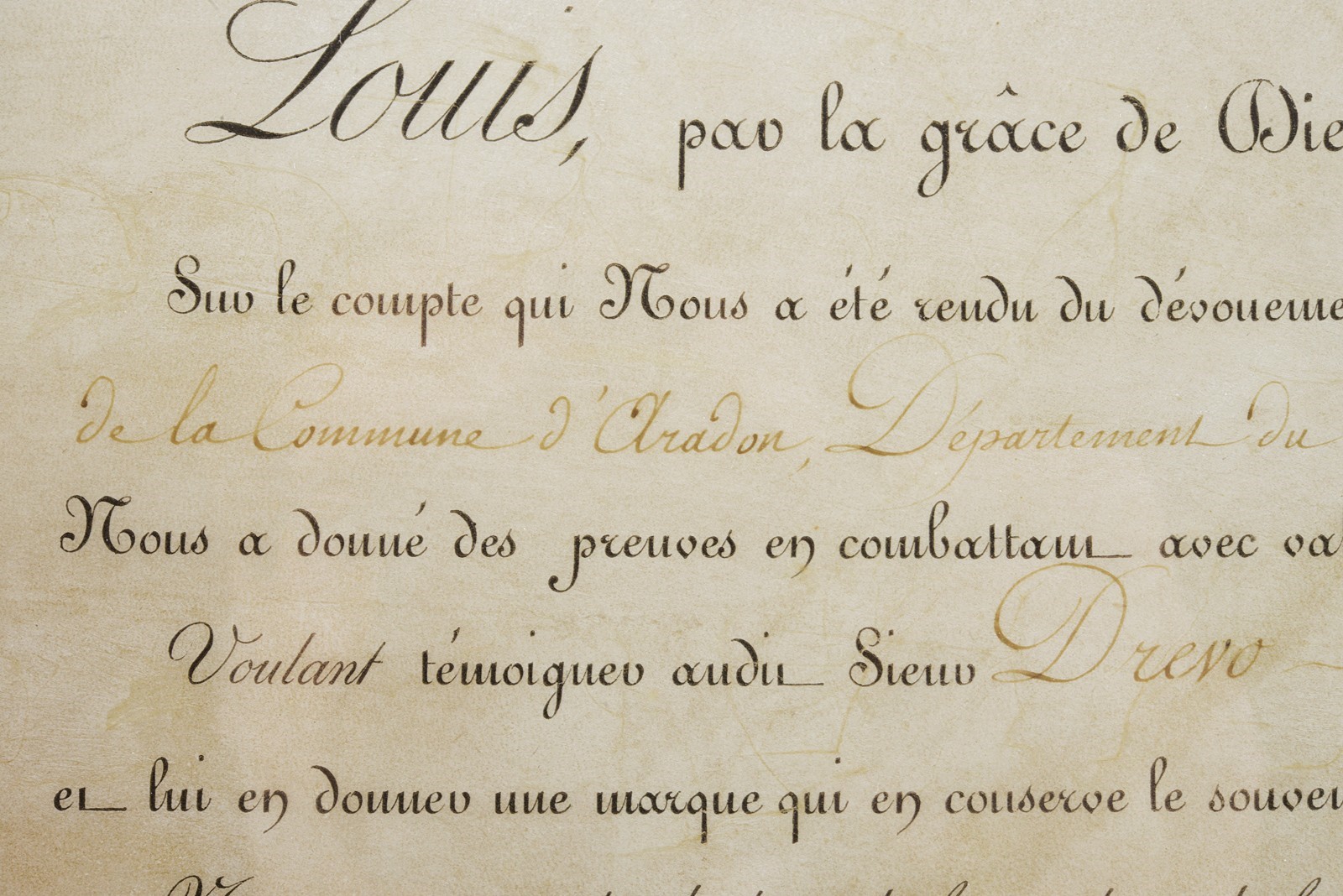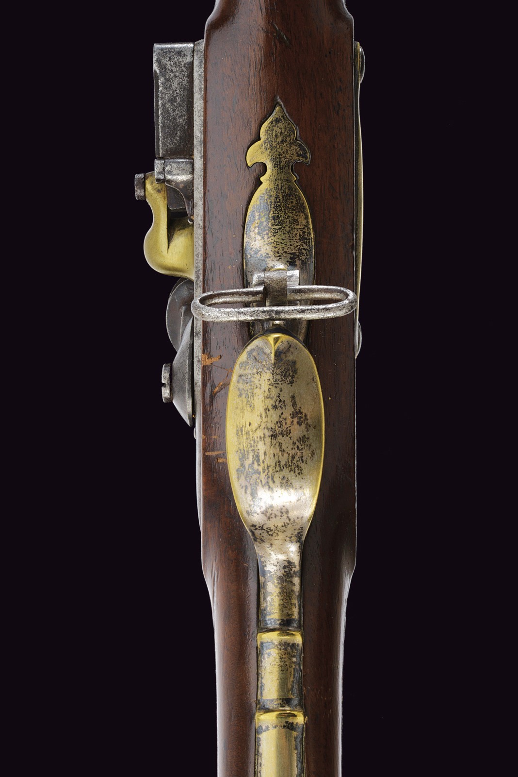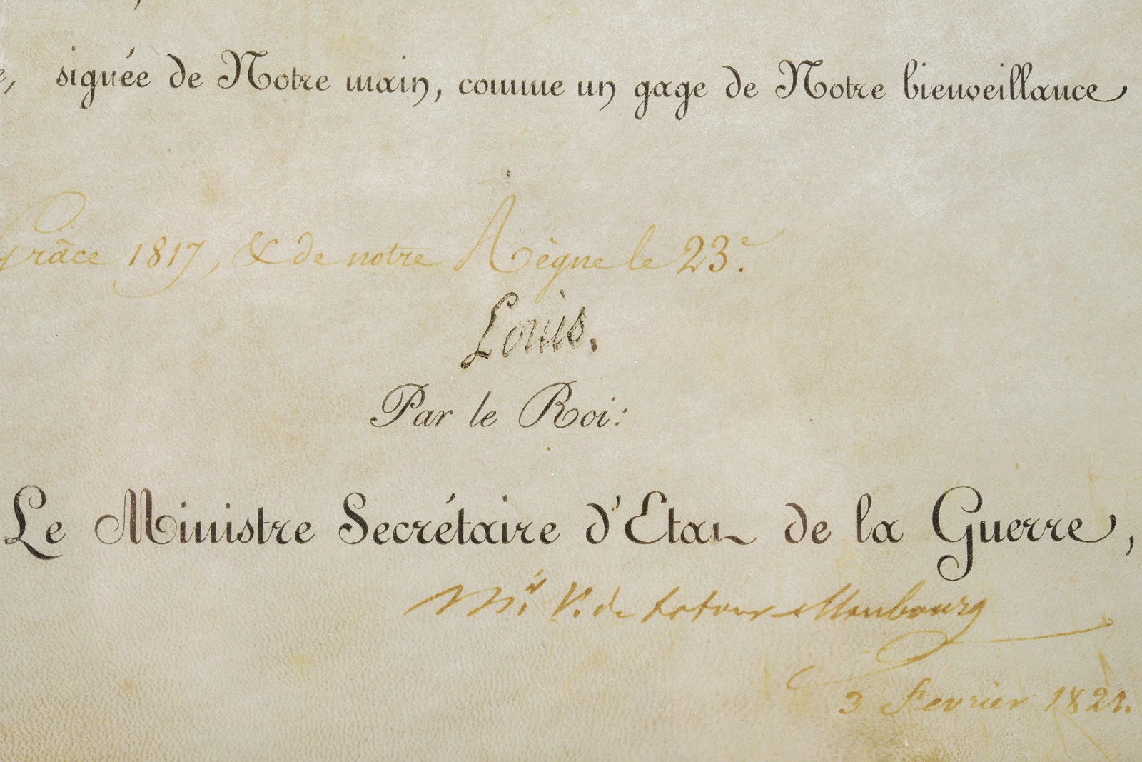 Modello uguale a quello della Guardia. Canna liscia tonda con base ottagonale marcata "DT", datata "1817" e con due altri punzoni poco leggibili, mirino sul bocchino, attacco per la baionetta, cal. 17 mm; codetta liscia; batteria firmata "Manuf. Royale de Versailles", munito di punzone "G" sotto stella e con scodellino in ottone. Meccanica funzionante a due scatti. Cassa intera in legno con resti di un timbro sulla parte della contropiastra. Alcuni fornimenti in argento marcati "H". Sul dorso scudetto ovale in argento con stemma reale (a tre gigli sormontati dalla corona reale) con motto "VIVE LE ROI". Sulla guancia destra placca in argento a forma di scudetto recante la iscrizione "Donne par le ROI au Sr. Drevo Julien". Bacchetta in ferro. Il fucile è accompagnato dal brevetto reale che attesta l’attribuzione a Drevo, firmato da re Luigi XVIII e dal Ministro della Guerra in data 11 luglio 1817. Il documento reca stemma reale e timbro in carta, presentato in cornice e sotto vetro.