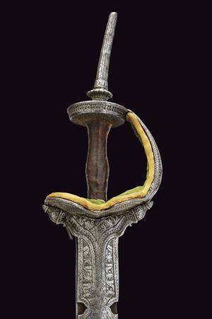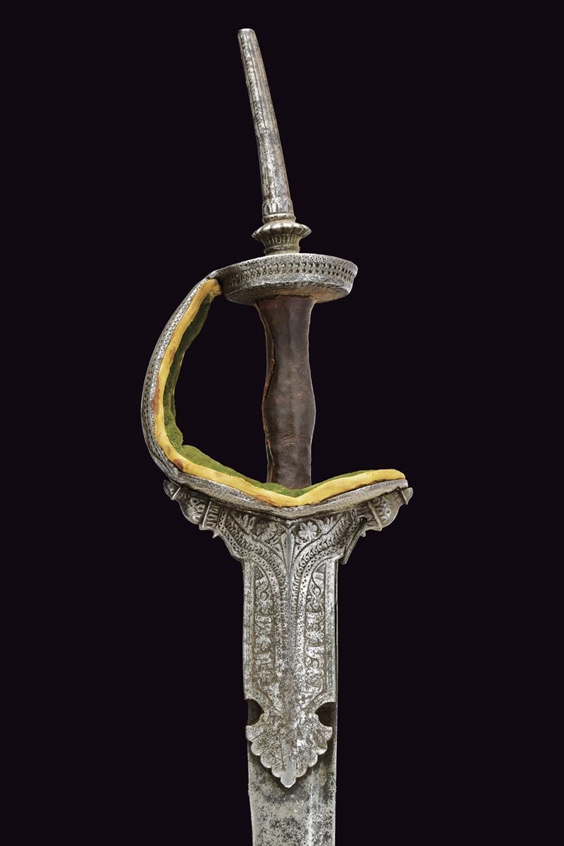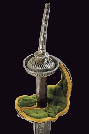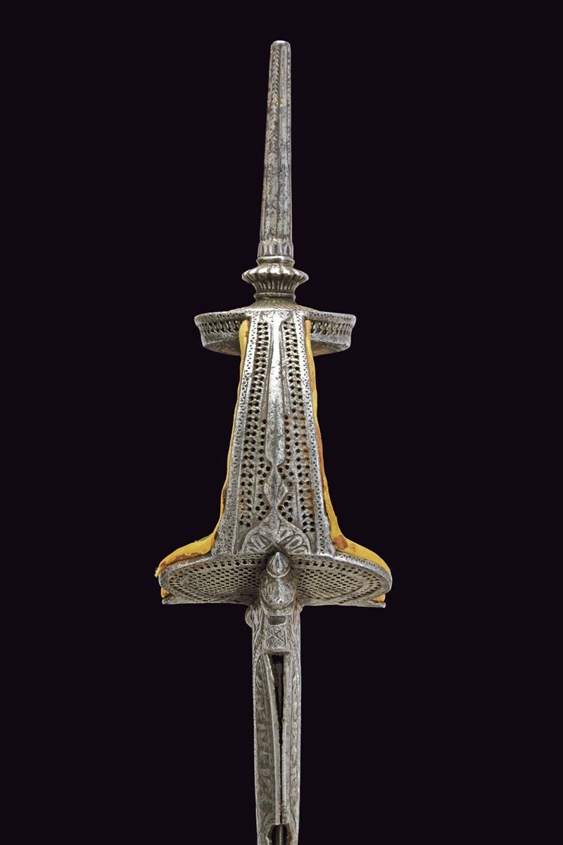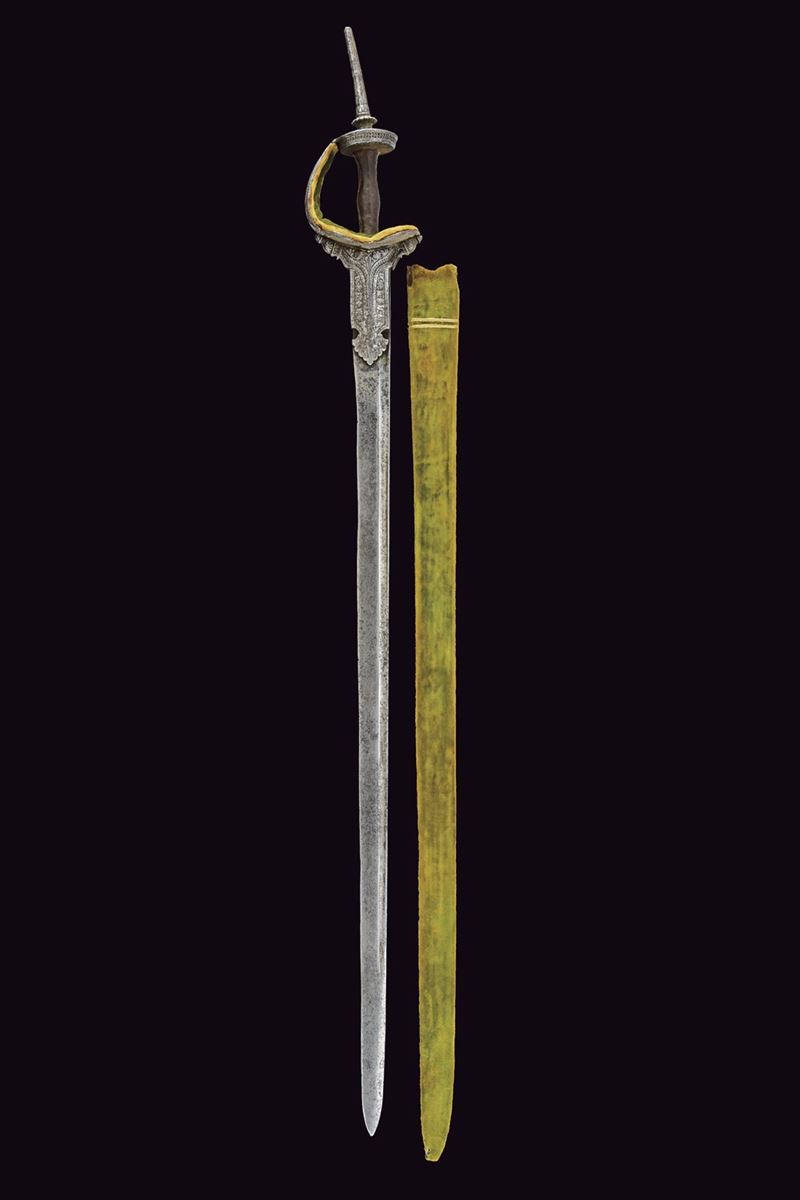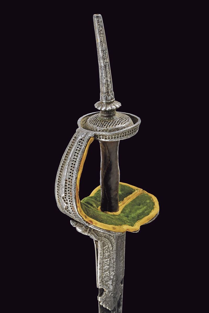 Lunga lama dritta a un filo con controfilo, con profonda scanalatura sotto il dorso; alla base due robuste lunghe ali che tengono la lama, intagliate e incise con motivi floreali e geometrici. Fornimento tipico in ferro, completamente decorato a fini trafori; ampio ramo di guardia con marcata nervatura centrale. Impugnatura rivestita di cuoio; coccia e ramo di guardia foderati in velluto verde con bordino bianco (tracce del tempo e dell’uso). Fodero in legno rivestito di velluto, probabilmente di epoca successiva.