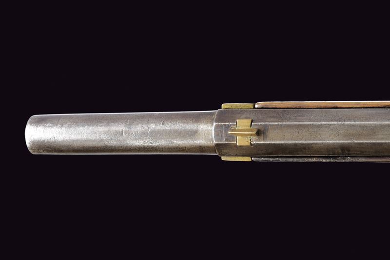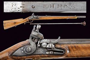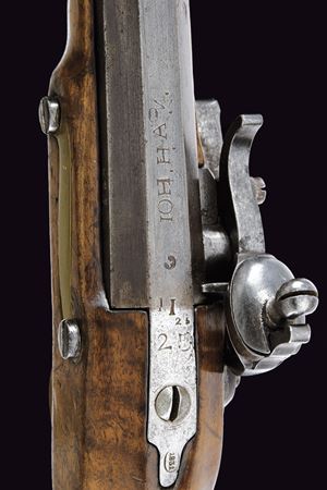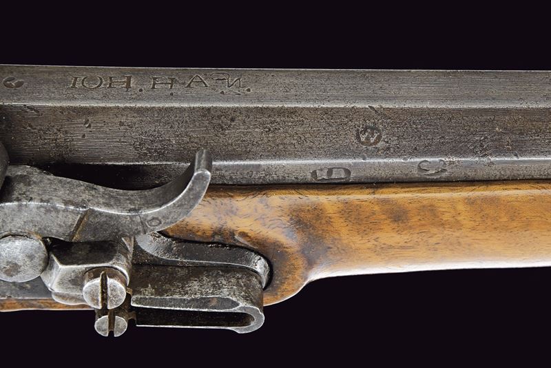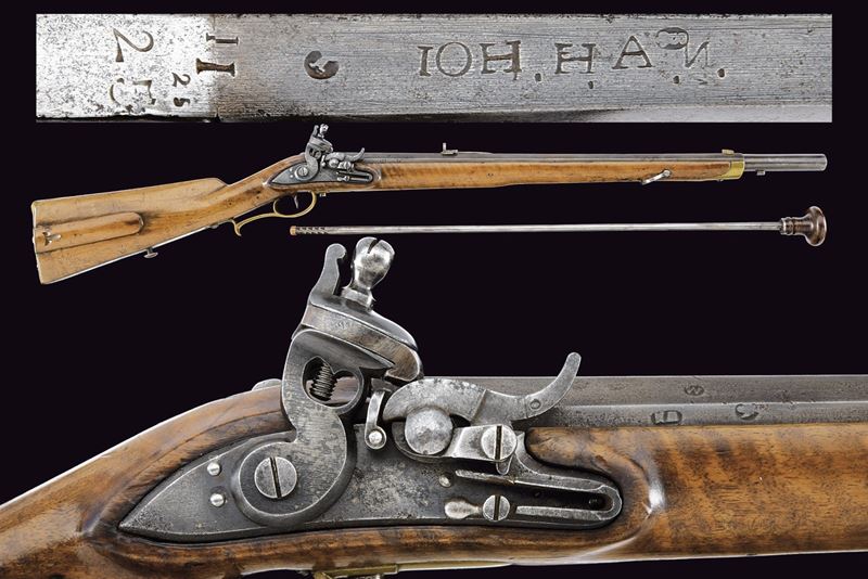 Canna rigata, ottagonale con volata tonda; alla base marcata “IOH. H. A. N.”, data letta '837' (possibile 1837) e punzoni tra cui una “W” e altri. Alzo a due fogli; mirino in ottone; attacco per baionetta; calibro 13,9 mm. Codetta recante le marcature '1831', '25' e '25'. Batteria a sistema Console. Cassa intera con patchbox e fornimenti in ottone. Completo della rara bacchetta disgiunta con impugnatura in legno, in oltre un "stura focone". Esemplare molto raro.