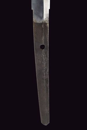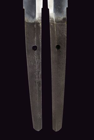Lama Shinogi-zukuri, Iori-mune (Nagasa 69 cm.) con hamon visibile, hada solo lievemente visibile. Alcuni Kizu al filo, apparentemente nessun danno fatale. Nakago con un Mekugi-ana. Mei (antica?). Habaki in metallo color argento. In Koshirae ottocentesco da Tachi. Aoi-gata tsuba in metallo tipo ottone ornata con trafori a Inome e con resti di doratura. Fuchi e kabutogane sempre in metallo color ottone con resti di doratura. Tsuka-ito (più tarda?) in tessuto color marrone. Tsuka con Samè in pelle di razza. Menuki in ottone a triplice Aoi-mon (Tokugawa). Saya in lacca bruna screziata con frammenti di madreperla e arricchita in lacca rossa applicata a "dripping" (piccole mancanze alla finitura). Fornimenti sempre in metallo color ottone con resti di doratura. Saya-ito en suite con la Tsuka (sottostante manica in tessuto ricamato). Ashikanamono con Obi-tori in pelle con resti di decorazioni dipinte. Segni d'uso e del tempo.