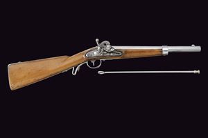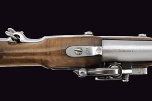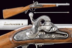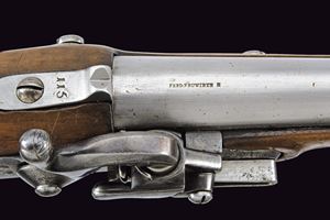 Canna liscia, corta, tonda, con base quadra marcata "FERD. FRUWIRTH", "M", "JJ" e con data "853", calibro 17 mm. Codetta con alzo fisso marcata "115". Batteria a molla in avanti con sistema Augustin, munita di sicura; cartella datata "851" con punzone imperiale. Cassa in legno con fornimenti in ferro; anello da sella. Provvista di bacchetta e moschettone. Rara.