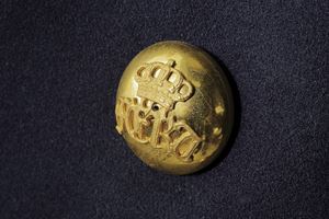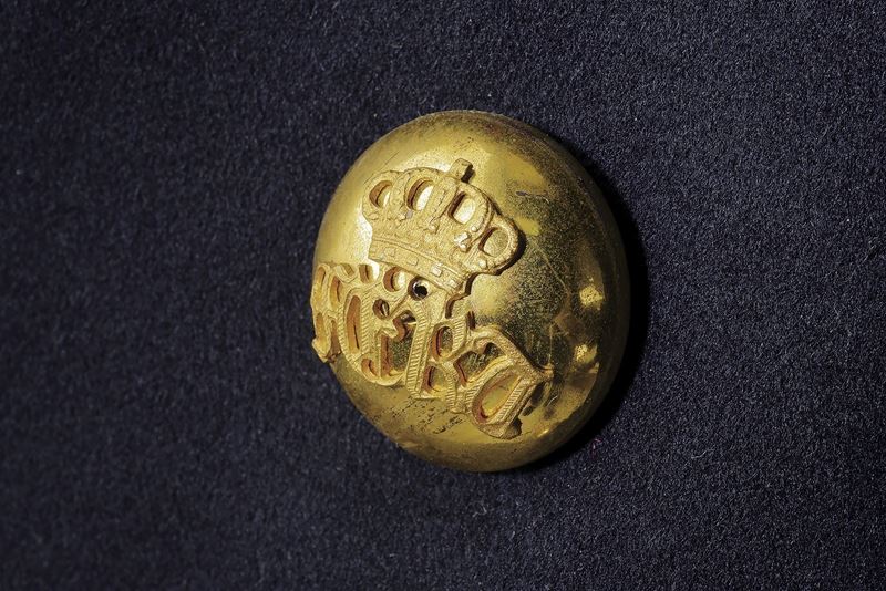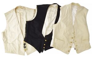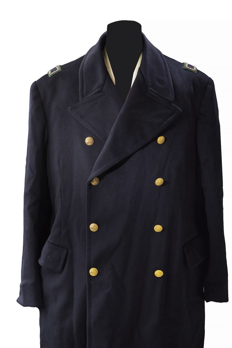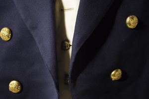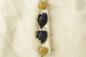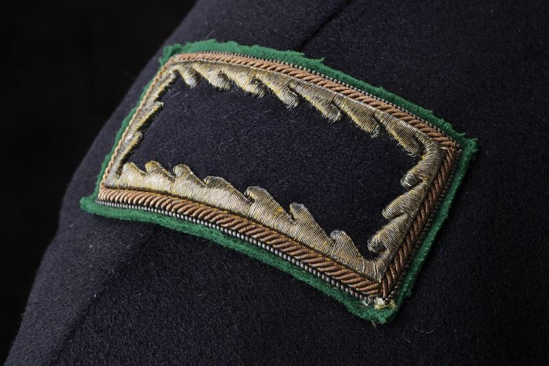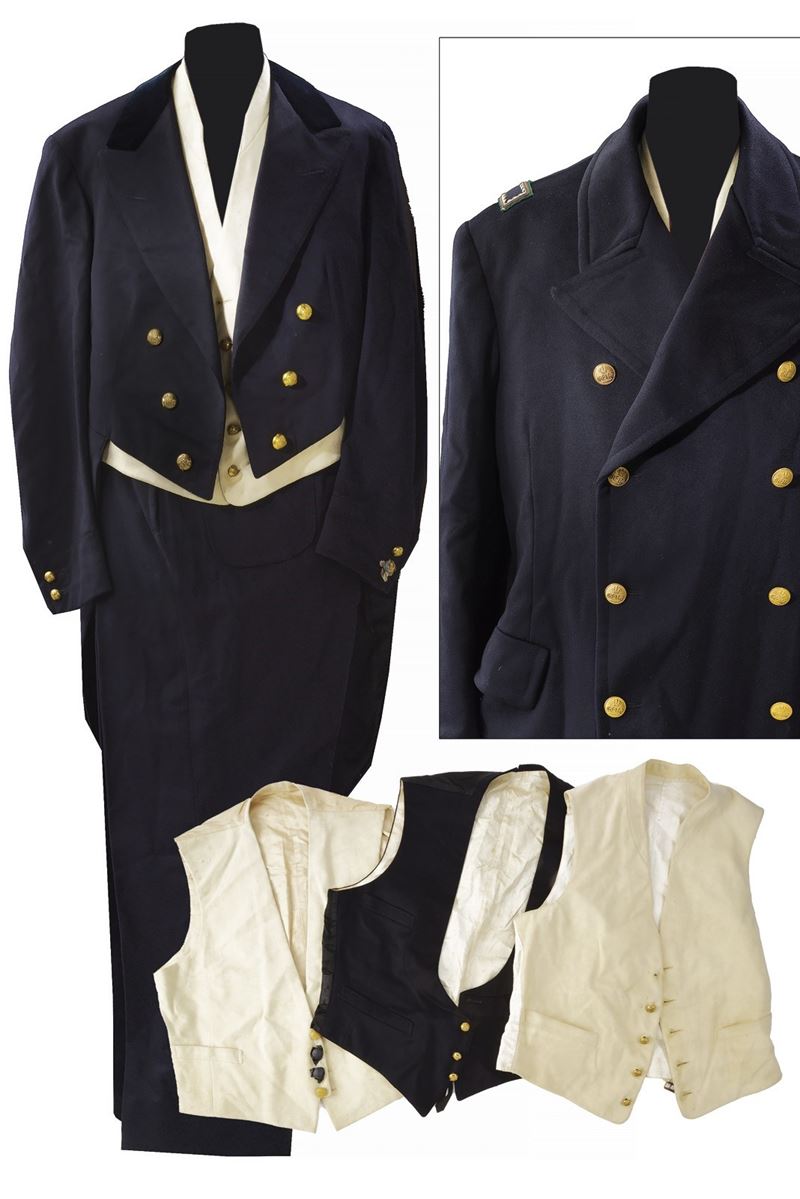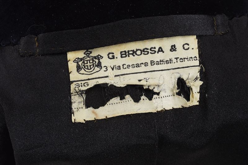 Giacca a code in lana color blu con colletto parzialmente in velluto, bottoni dorati con emblema "FERT" coronato, etichetta strappata all'interno di "G. BROSSA & C.", fodera in seta nera e bianca. Due panciotti color bianco, con bottoni (alcuni ancora incartati) recanti lo stesso emblema di quelli della giacca. Un panciotto color blu con i medesimi bottoni. Uno dei panciotti bianchi reca l'etichetta: "L. BERETTA & c. SUCC.RI DI A. FARE & C. ...", "anno 1937" e "Sig. Grisi della Piè cav. Dion." Pantaloni (macchie) con etichetta en suite alla giacca (anche questa strappata). Cappotto con bottoni dorati sempre recanti la dicitura "FERT" coronata, foderato all'interno in seta nera, con etichetta dell'Unione Militare e con fregi sulle spalle. Leggeri segni d'uso e del tempo. Fori di tarme non presenti o non visibili. Raro.
