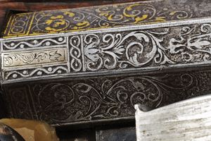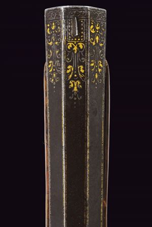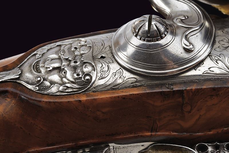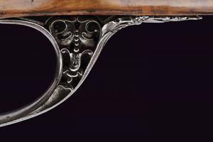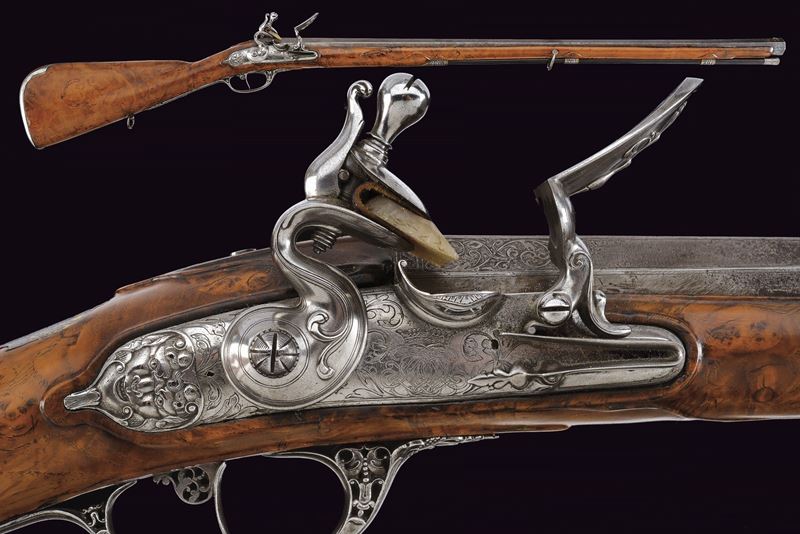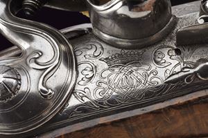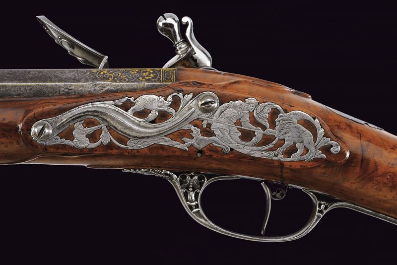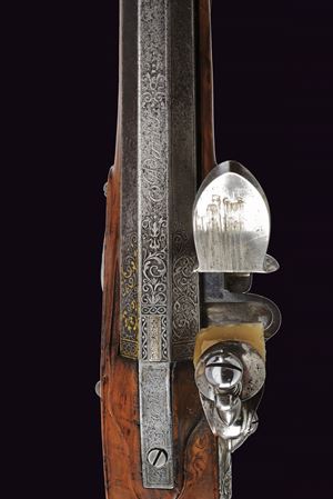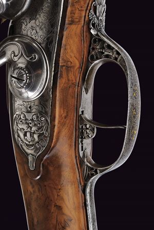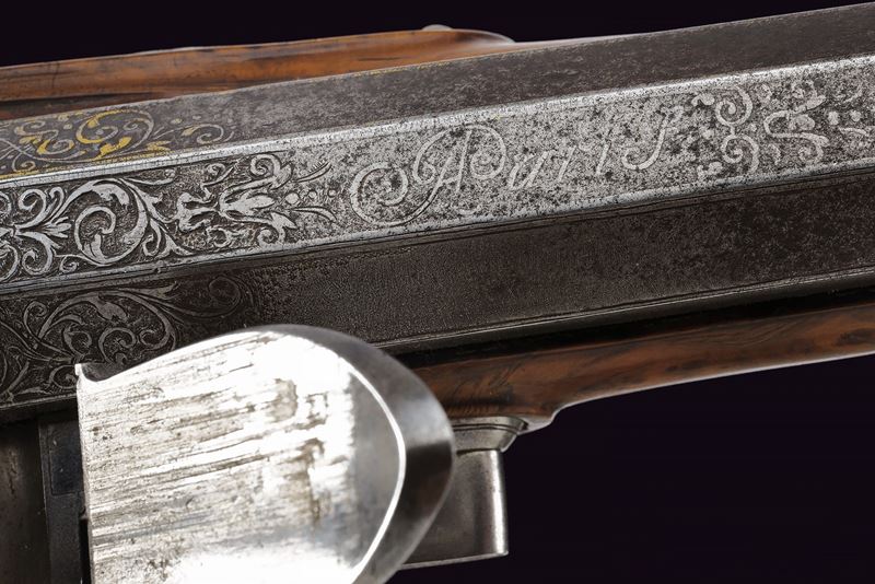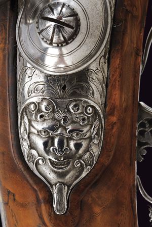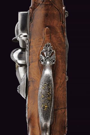 Bella e pesante canna di forma ottagonale rigata, anima ellittica con rigatura a due eliche (appena visibile); la camera di scoppio decorata a volute floreali, alcune presentano ancora resti doratura, reca inciso la firma del fabbricante "Brion / a Paris", in parte sulla coeva e in parte sulla culatta; volata leggermente strombata e munita di tacca di mira, anche questa ornata a modi floreali in parte rimessi in oro; cal. 14.5 mm. Batteria alla moderna con cartella leggermente bombata, intagliata alla coda con un bel mascherone in bassorilievo, il resto inciso a volute, con al centro delle iniziali nobiliari coronate. Cassa intera in radica di noce con piccole volute intagliate sul fusto e a ridosso del canale della bacchetta. Bei fornimenti in ferro, in parte rimessi in oro (mancanze), alcuni con girali rimesse in oro, il calciolo con apertura tonda a scatto, per l'alloggiamento delle palle. Il ponticello magnificato cesellato e messo a giorno con volute e motivi floreali. La contropiastra sempre in ferro messo a giorno, con una scena cinegetica. La campanella sul calcio per la tracolla con base rimessa in oro. Al dorso dell'impugnatura scudetto in ferro ed oro, cesellato e inciso a bulino, di forma cartouche barocca movimentata. Lo scudo, di tipo francese antico, è inquartato e timbrato da una corona nobiliare aperta. Bocchino e passanti a tubetto con anellature con resti di agemine in oro. Bacchetta originale con cavastracci in ferro e battipalla in argento delineato.