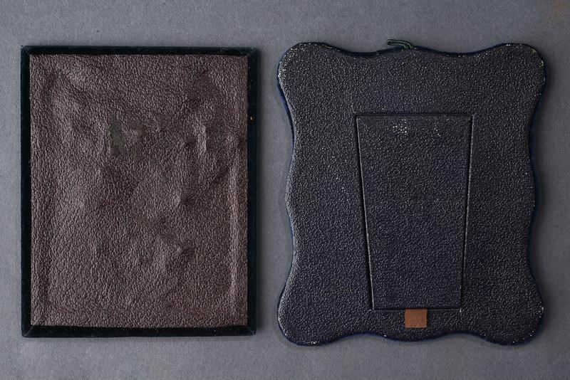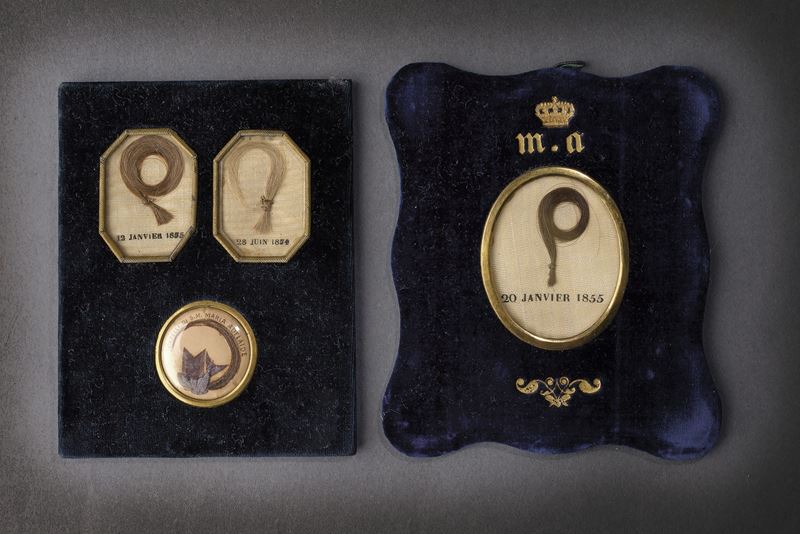 Paio di quadretti in legno rivestito di velluto blu. Il primo conserva, entro un piccolo oblò e due cornici ottagonali, ciocche di capelli della consorte del primo re d’Italia. Il secondo, entro un ovale sormontato dal monogramma “MA” (per Maria Adelaide) sotto corona reale, contiene ulteriori capelli e la data della sua morte: “20 Janvier 1855”.