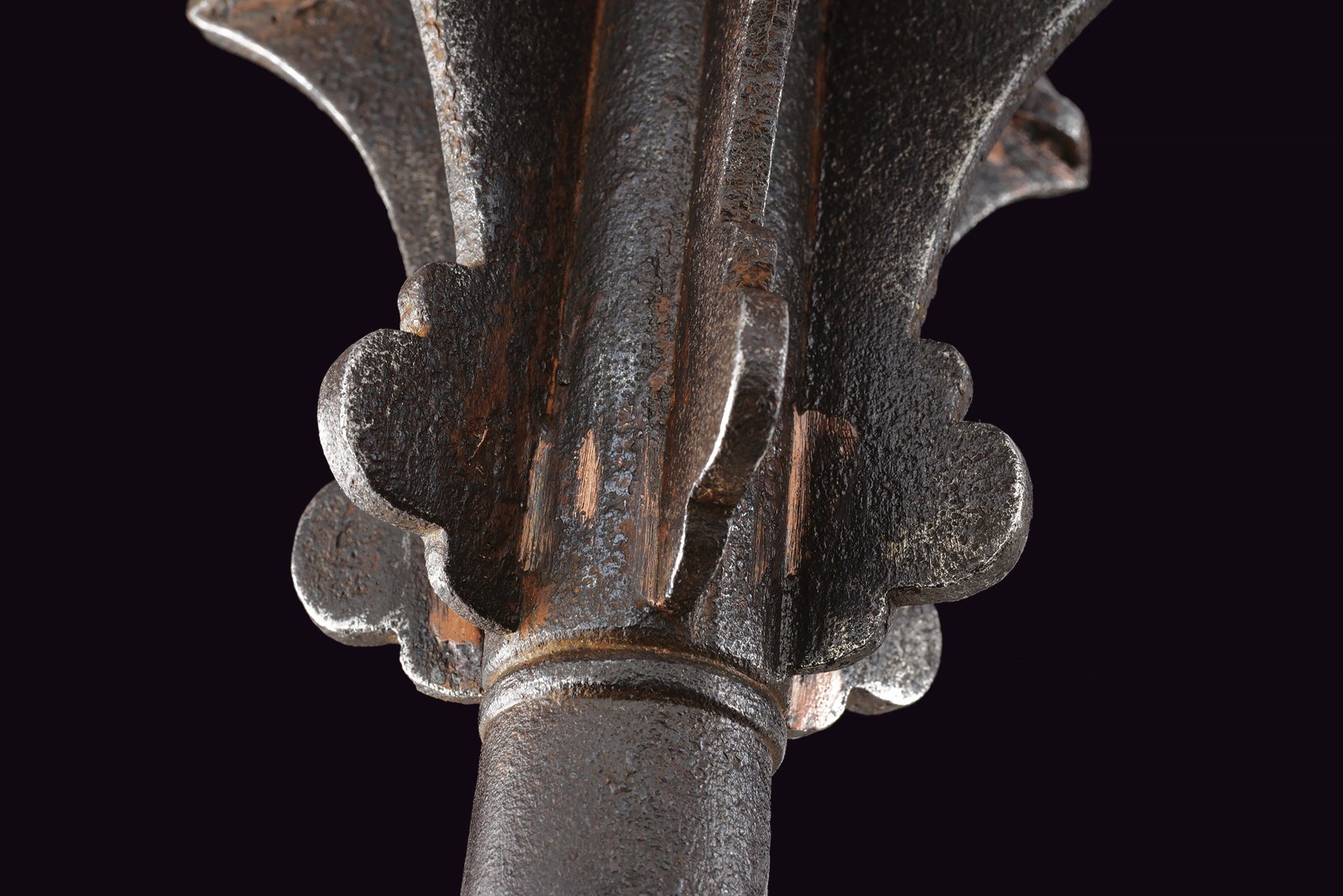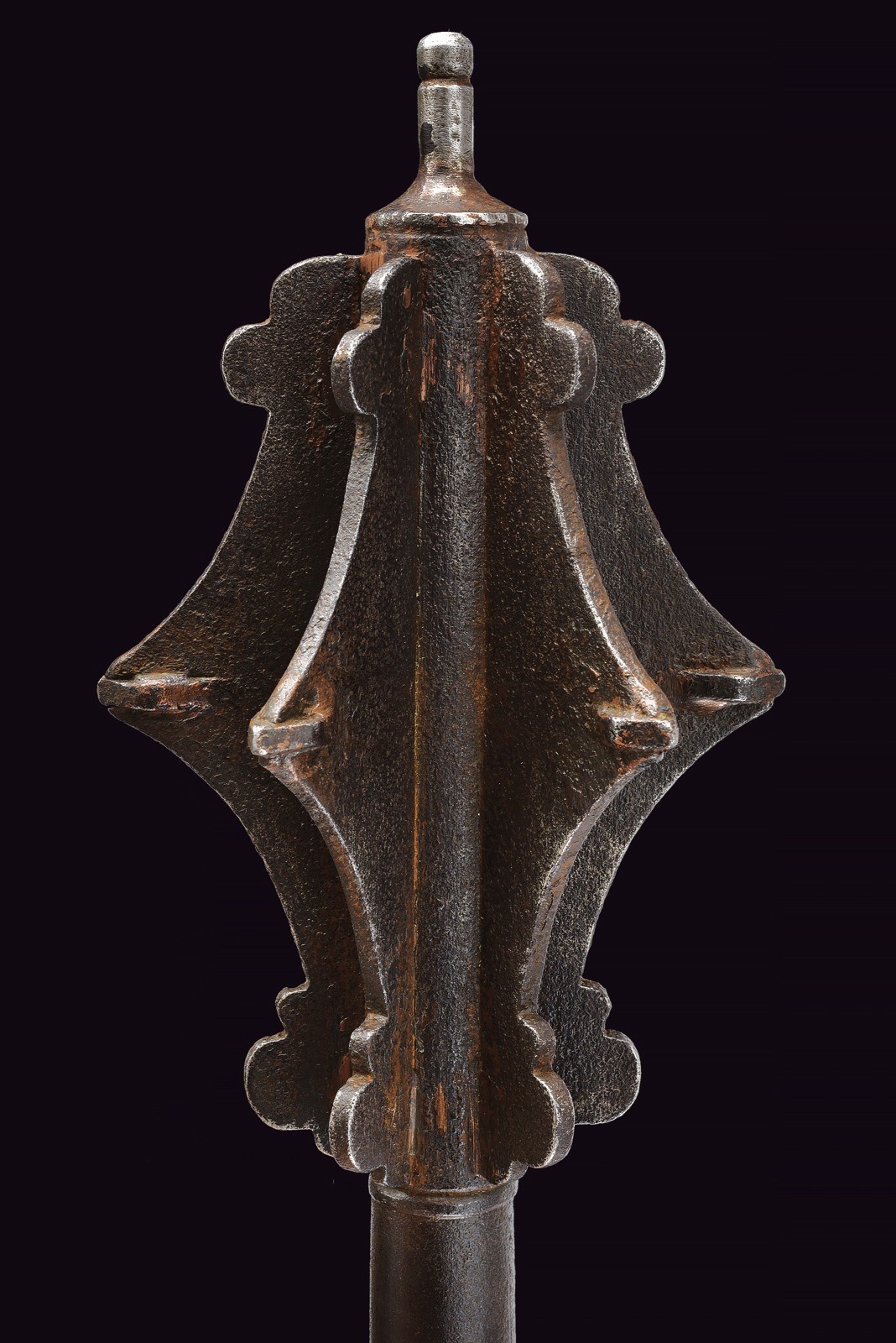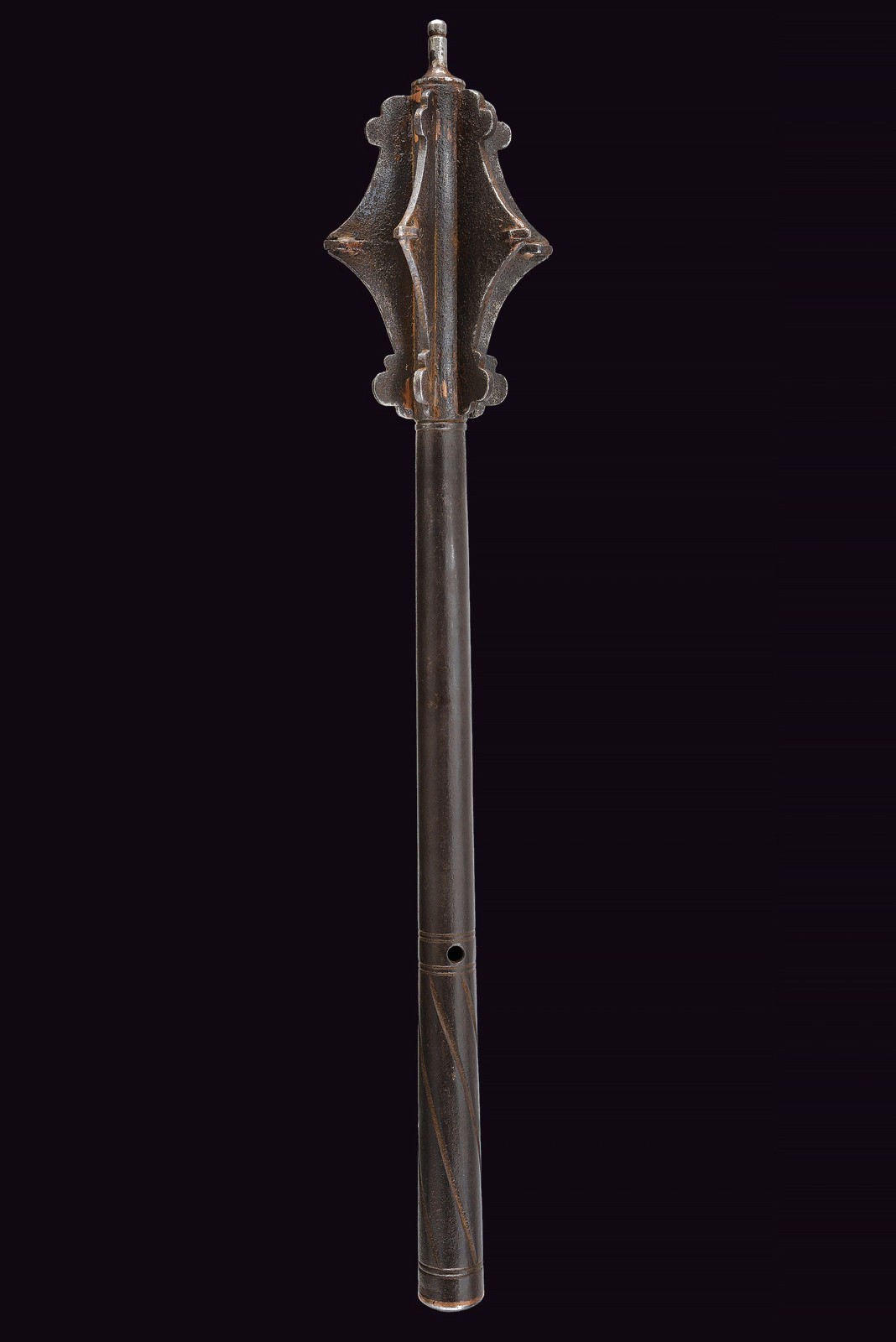 Completamente in ferro, testa composta da sei coste cuspidate e rinforzate al centro e ondulate alle estremità, fissate con saldatura di rame, al sommo un bottoncino slanciato di forma cilindrica. Fusto lavorato in un unico pezzo con l'impugnatura, il primo di forma cilindrica e con superficie liscia, il secondo decorato con sgusci obliqui e bande trasversali; foro per la cinghia.