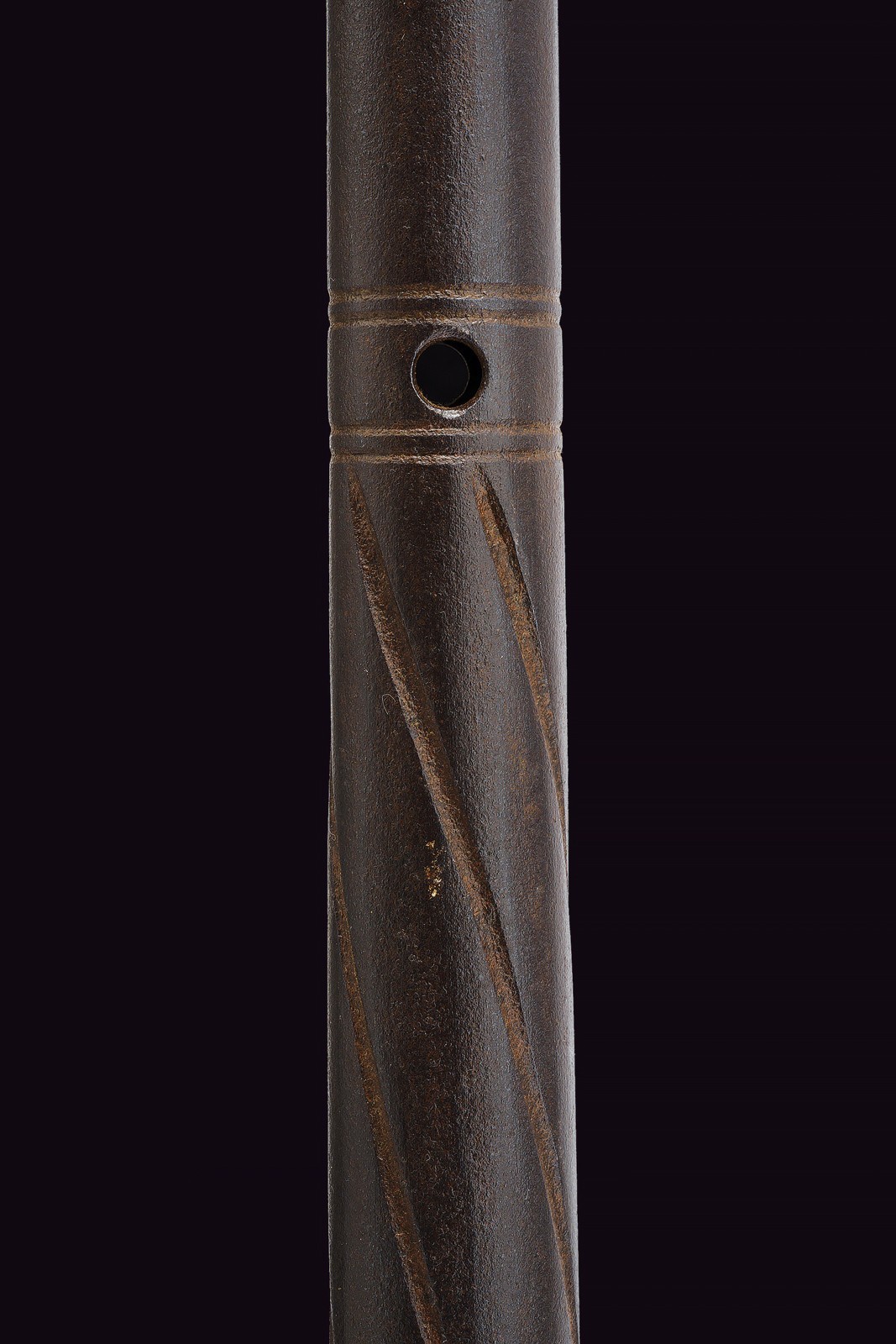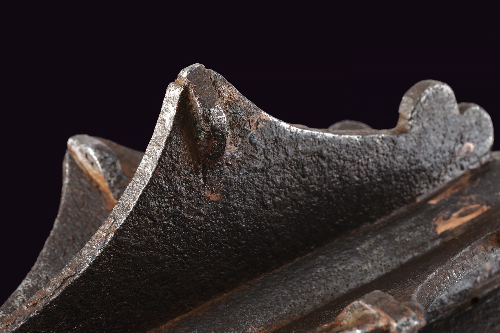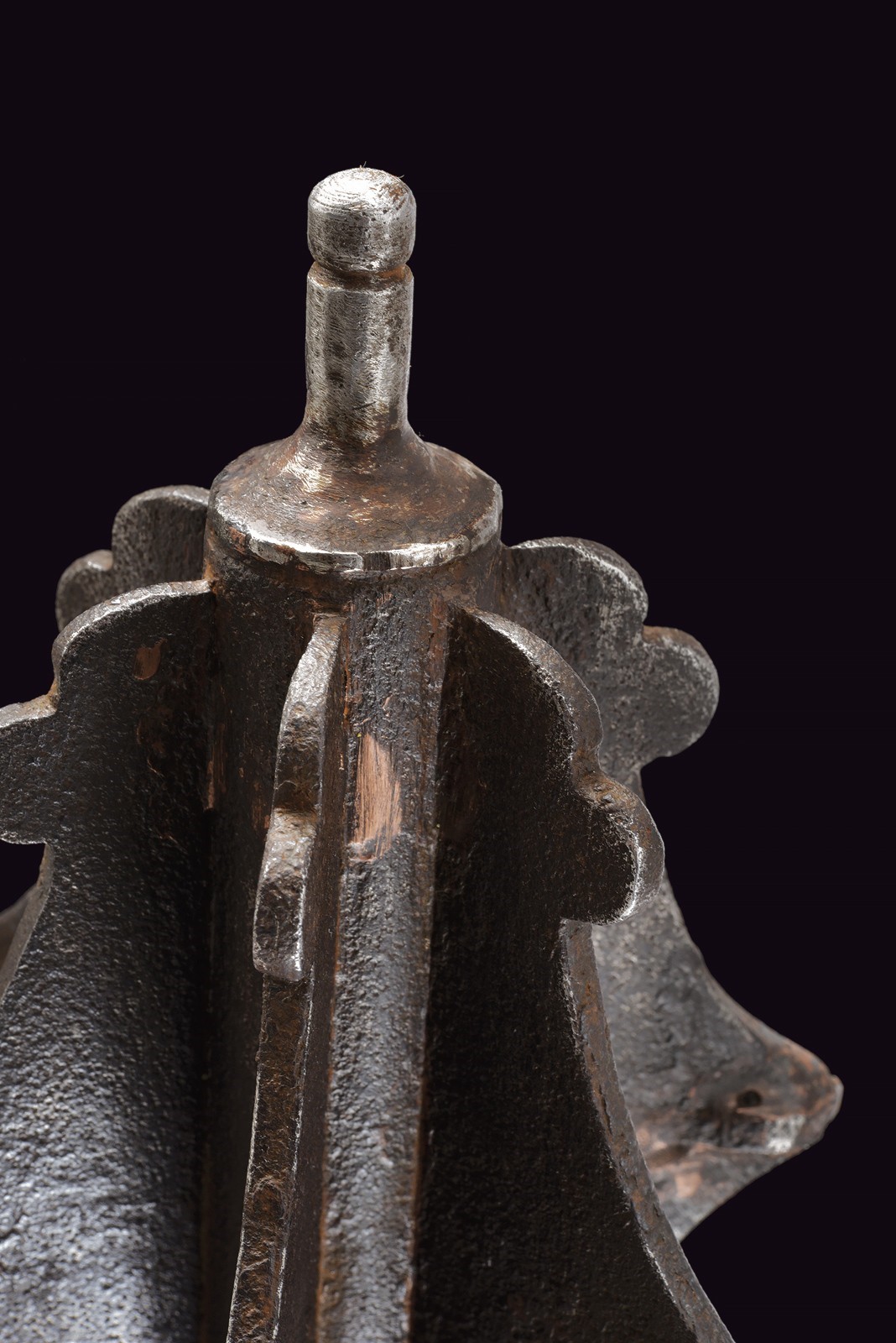 Completamente in ferro, testa composta da sei coste cuspidate e rinforzate al centro e ondulate alle estremità, fissate con saldatura di rame, al sommo un bottoncino slanciato di forma cilindrica. Fusto lavorato in un unico pezzo con l'impugnatura, il primo di forma cilindrica e con superficie liscia, il secondo decorato con sgusci obliqui e bande trasversali; foro per la cinghia.