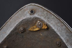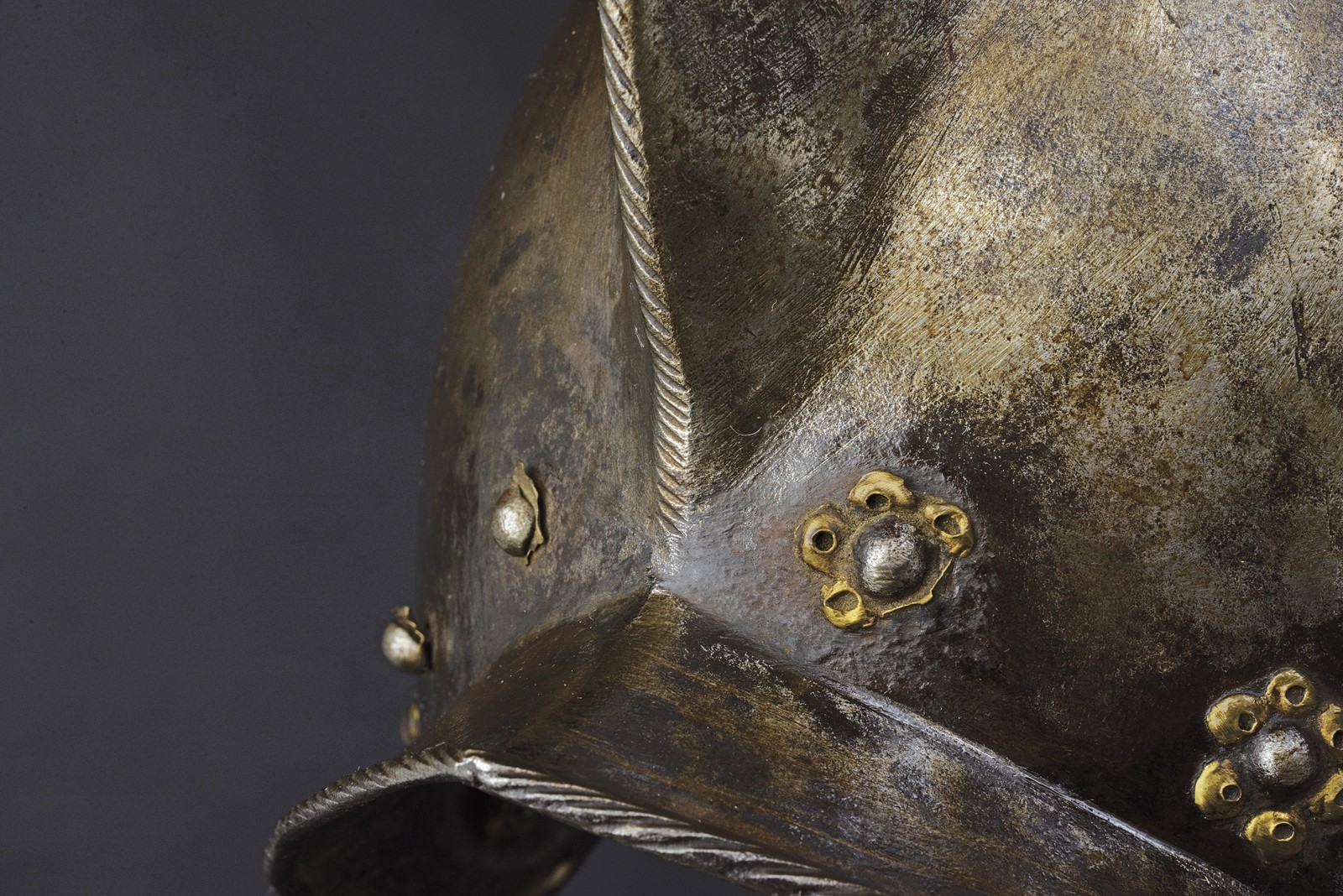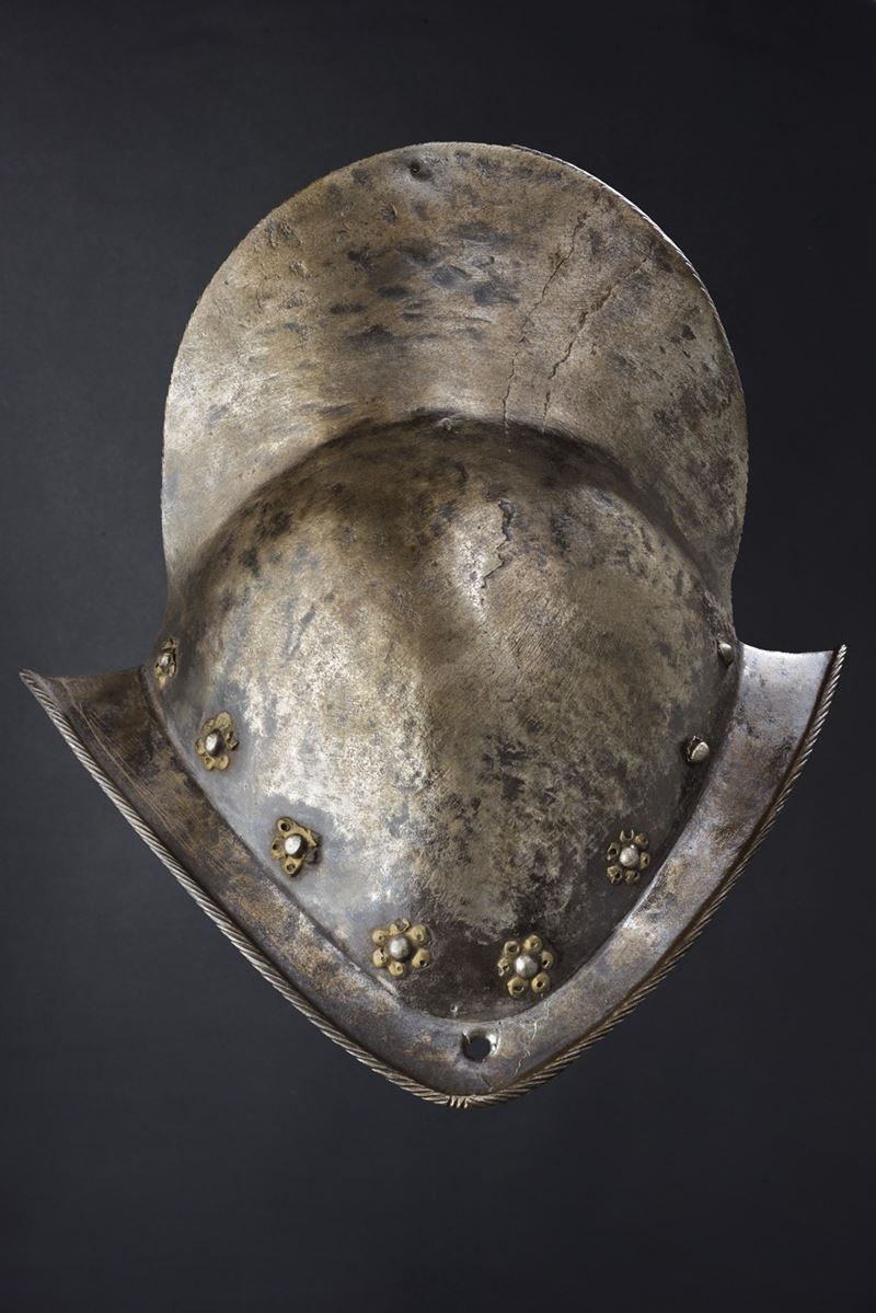 Coppo in ferro liscio con alta cresta cordonata; alla base giro di rivetti con rosette in ottone originali (tre mancanti). Tesa a barchetta pronunciata con bordo tondo a fine cordonatura. Sfogliatura speculare sulla cresta. Un foro per parte al centro della tesa.