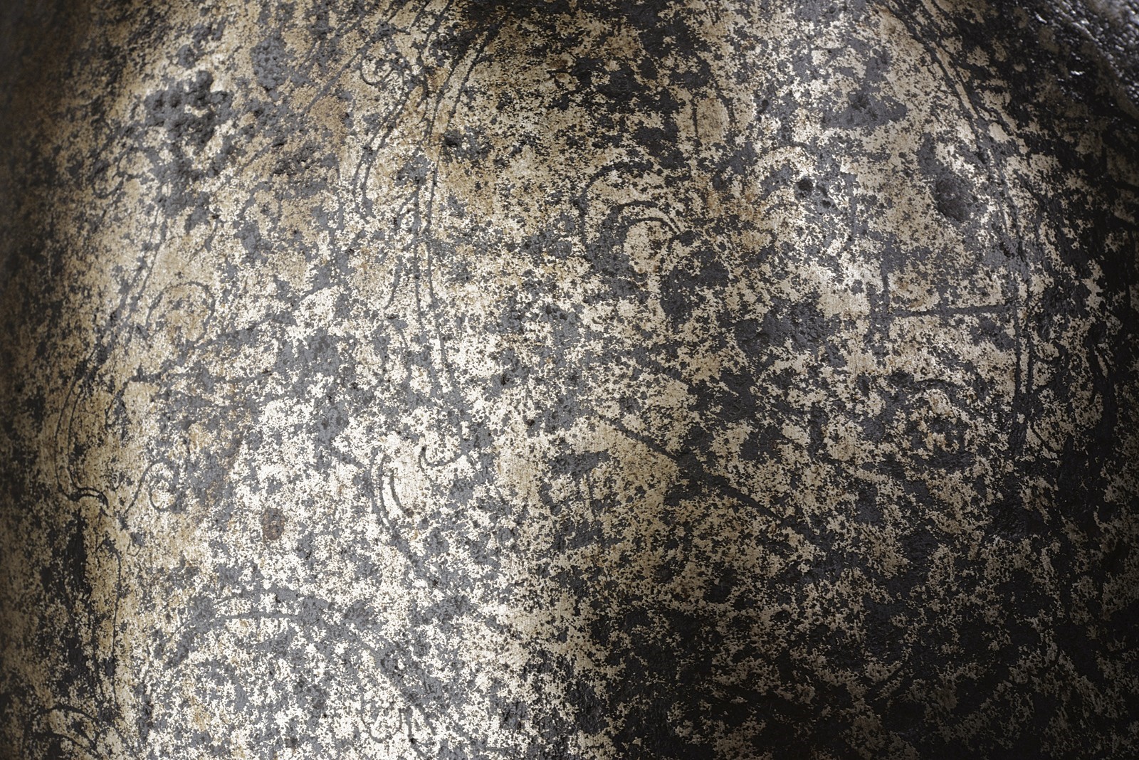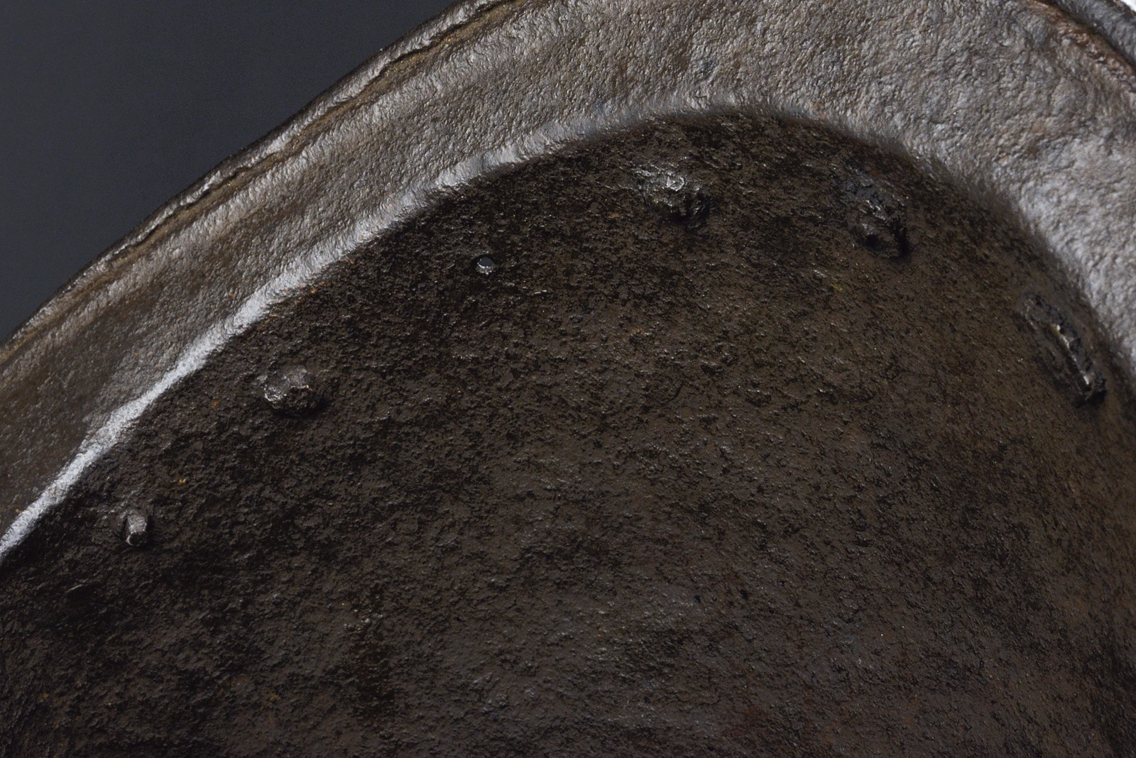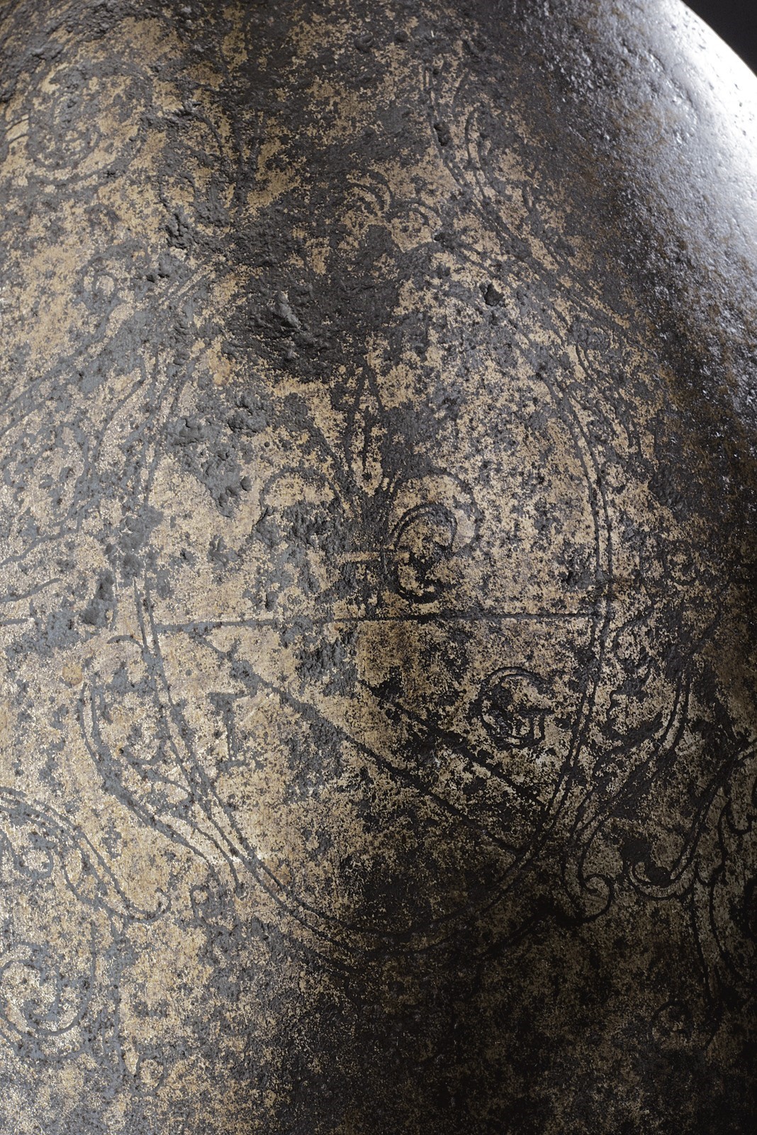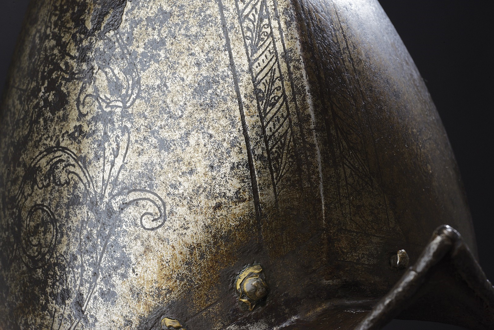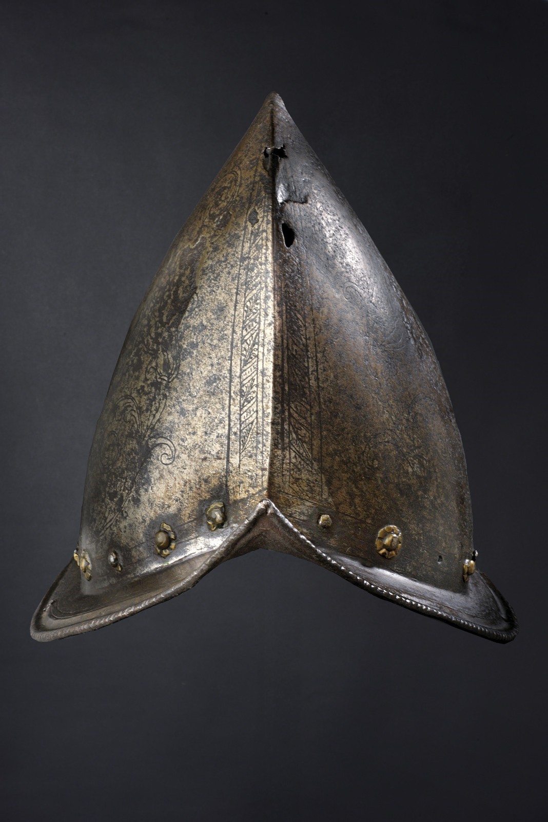 In ferro, coppo alto a forma ogivale (due piccole mancanze) e con forte apice ricurvo; decorato a tutto campo con uno scudo centrale ovale e scorniciato a svolazzi fitoformi, recante armi gentilizie troncato al giglio fiorentino con banda e cifre "I G". Alla base giro di rivetti in ferro (in parte con rosette in ottone); resti della pennacchiera a cartiglio (incompleta). Tesa a barchetta, incisa a palmette, margine a lista ribassata e bordo tocco a fingere il tortiglionne; un apice co danni.