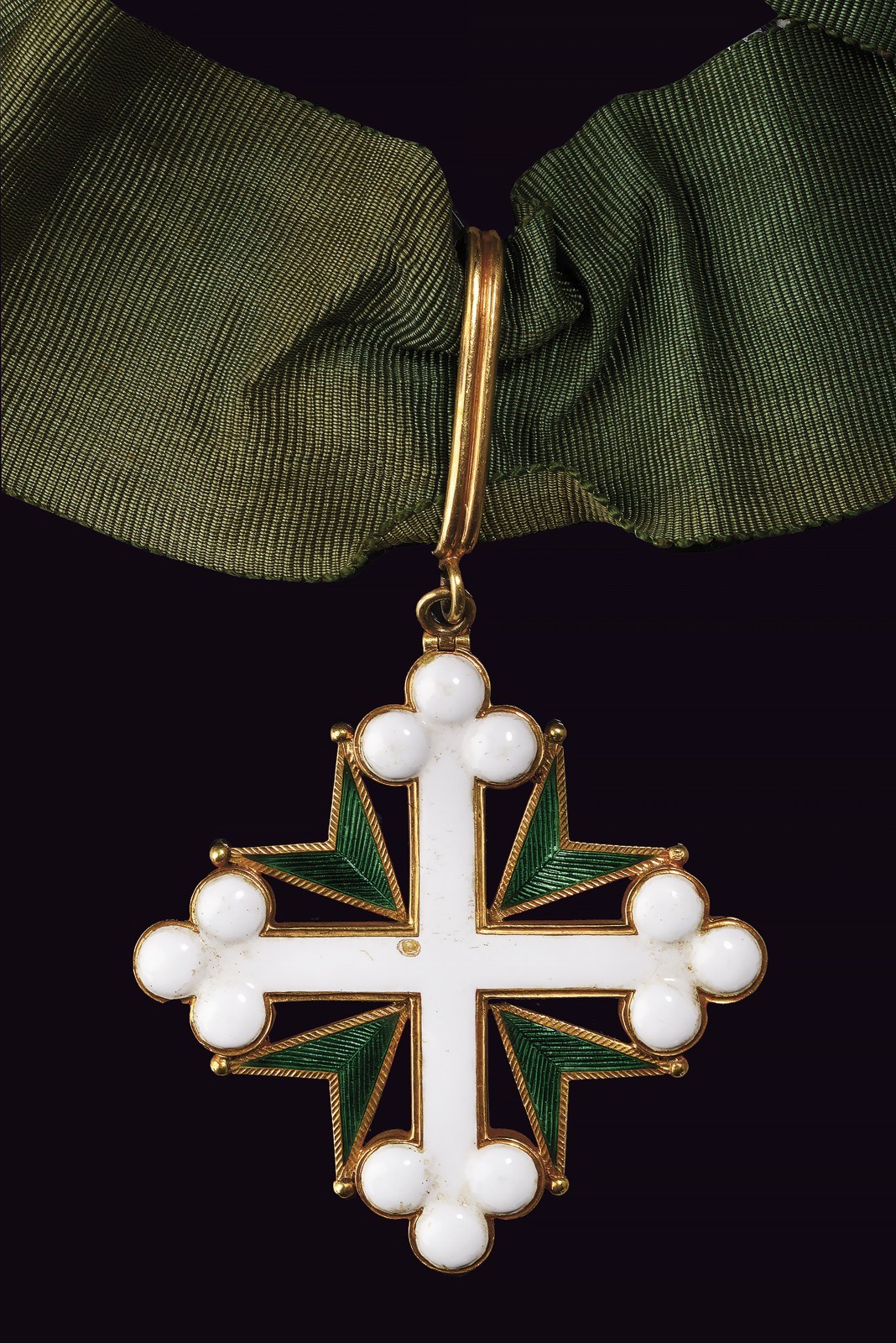 Croce di commendatore. In oro e smalti. Piccolo chip. L'anello piccolo movibile. Completo di nastro da collo.