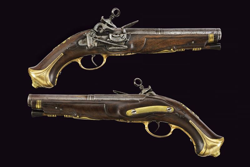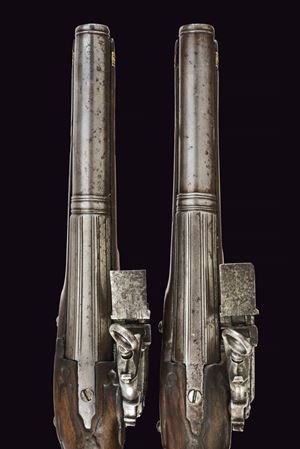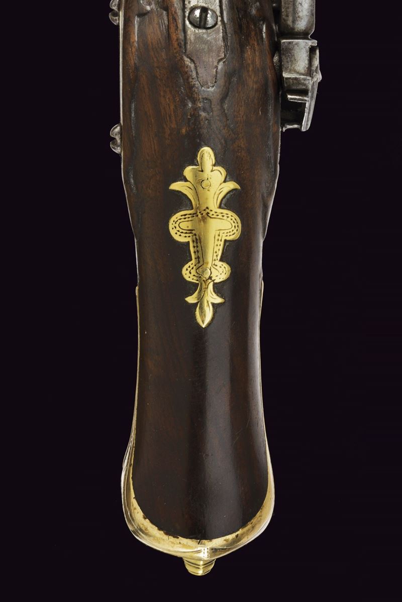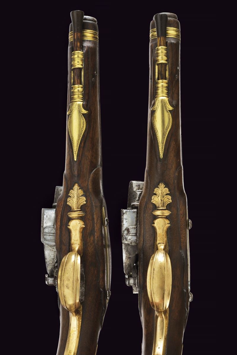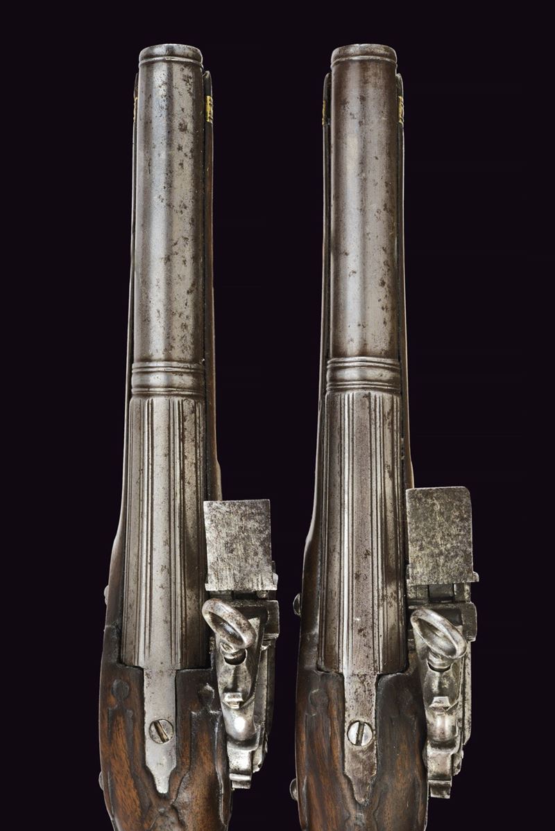 Canne lisce a due ordini, quadra con piccole scanalature longitudinali, e tonde con gioia di bocca e cornicette al cambio, cal. 18 mm. Batterie alla micheletta ornate da delineare e piccoli fogliami sul cane. Cassa intera in noce con intagli; fornimenti in ottone con modanature. Bacchette di restauro in legno con battipalla in corno.