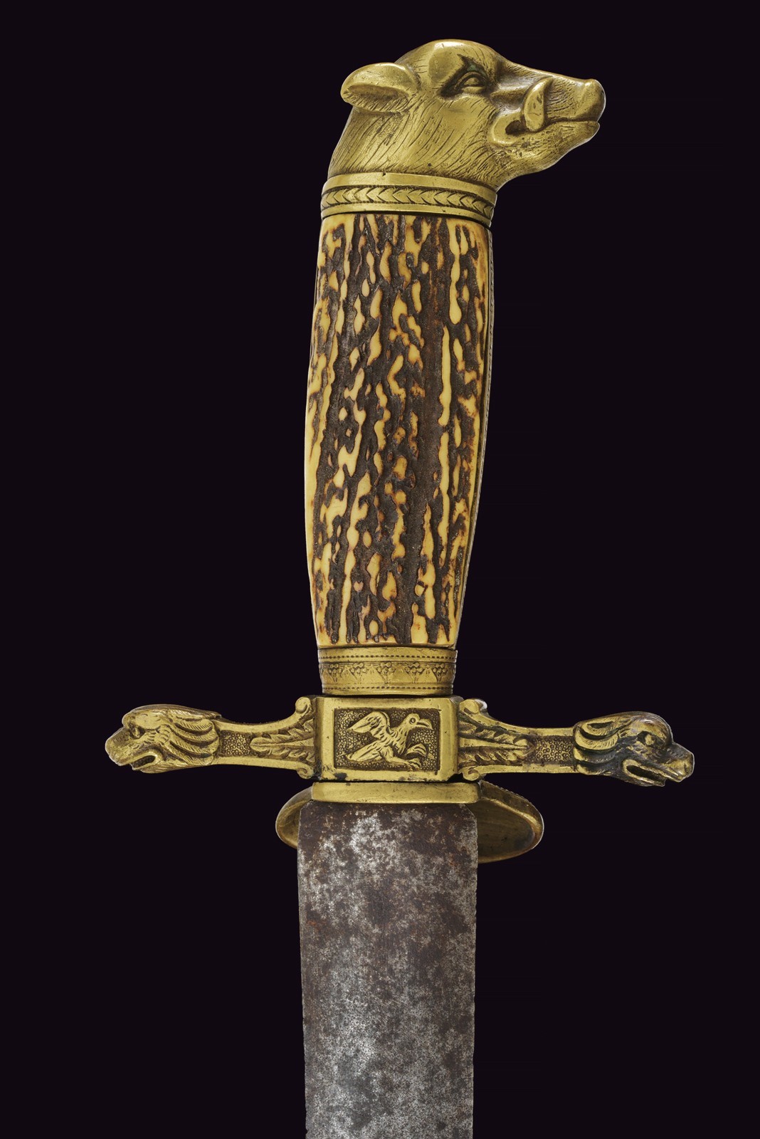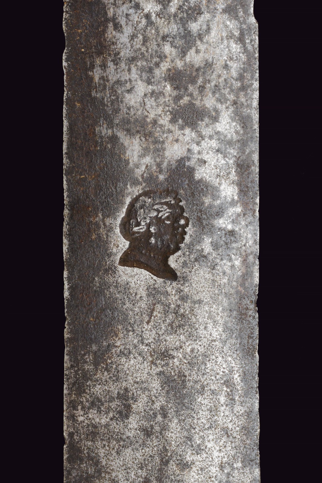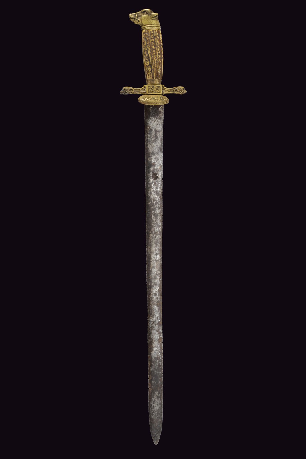 Vecchia lama dritta a due fili di sezione lenticolare (intaccature), su entrambi i lati profonda marca con testa ornato da una corona d'alloro. Fornimento in bronzo, la piccola pelta con scena di caccia a un volatile; lo stesso tipo di volatile sul massello, i bracci con teste di leone, il grande pomo a testa di cinghiale. Impugnatura in corno di cervo. Privo di fodero.