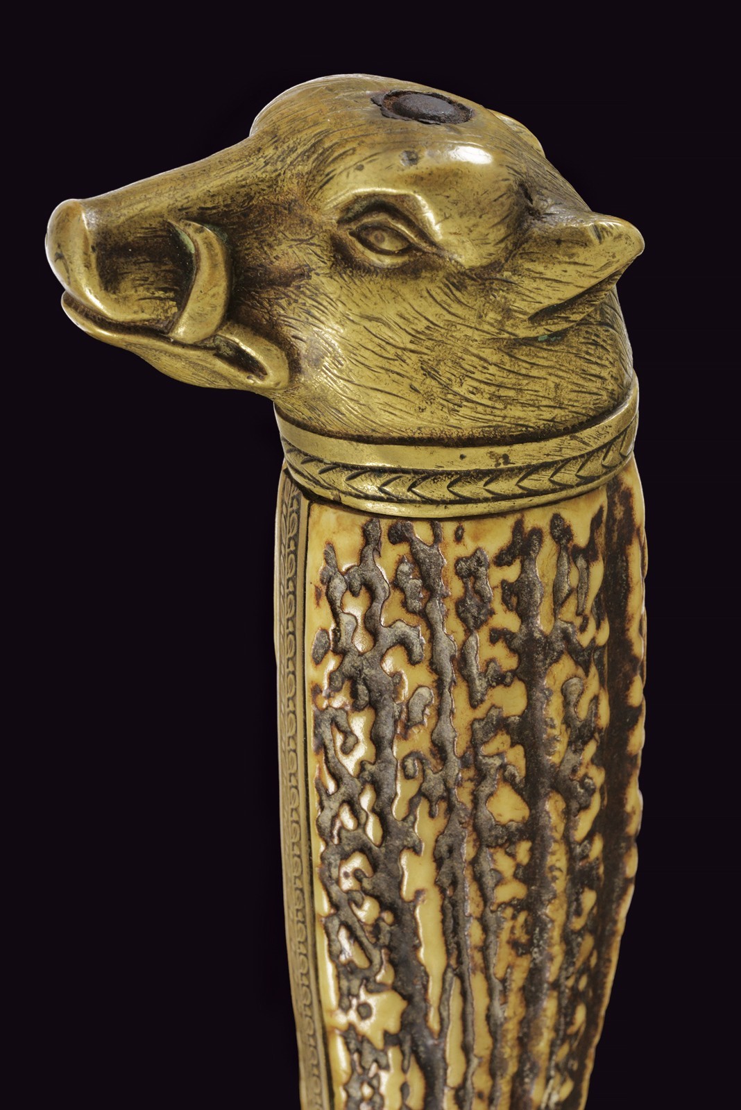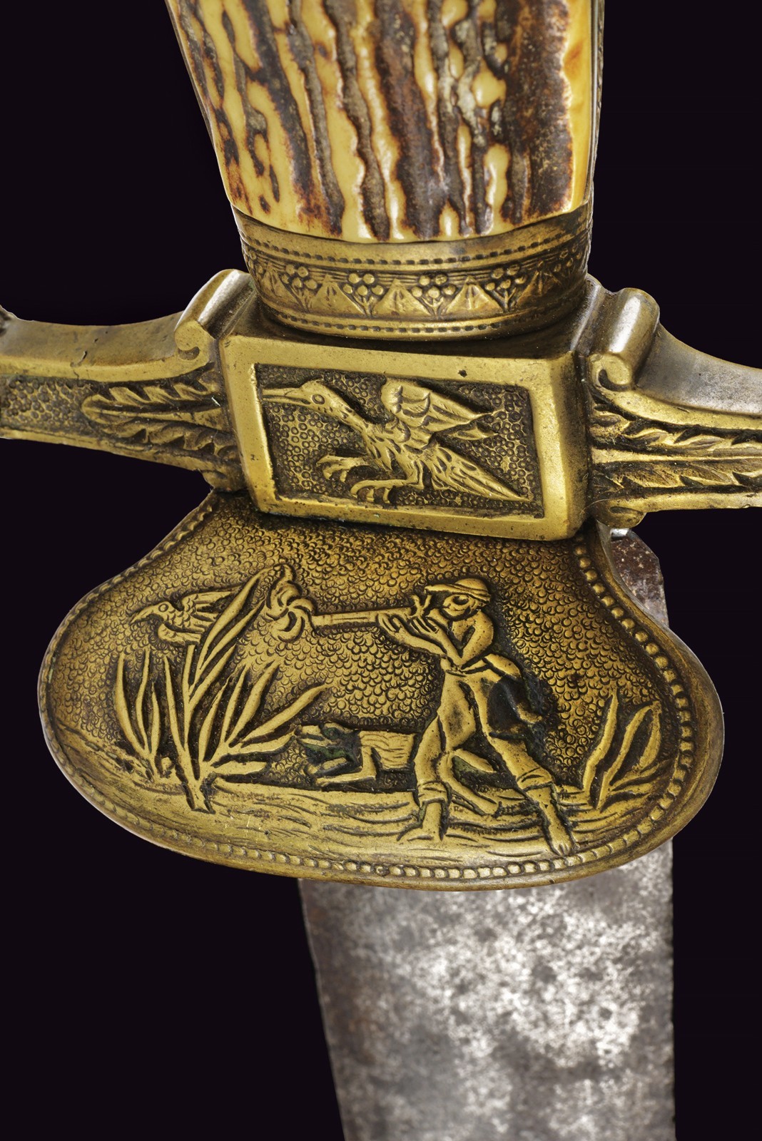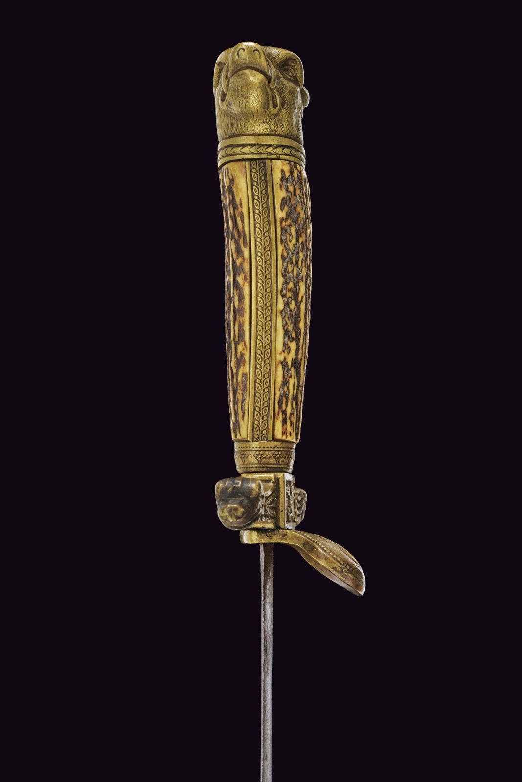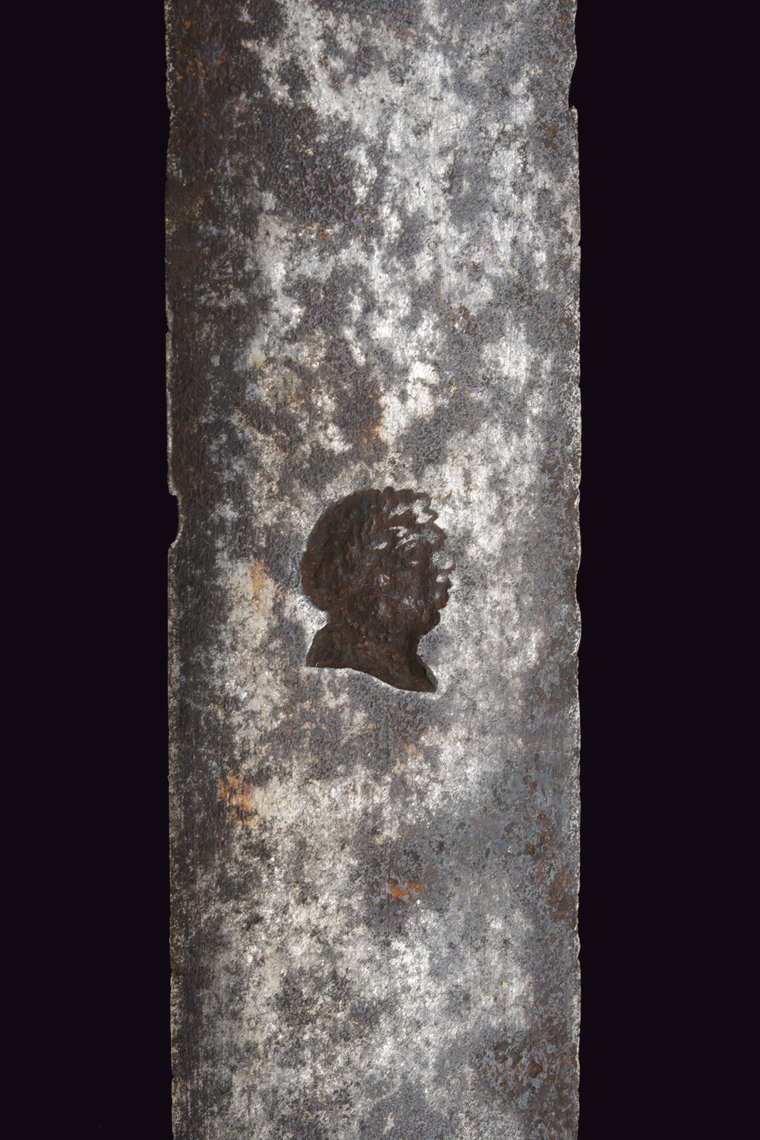 Vecchia lama dritta a due fili di sezione lenticolare (intaccature), su entrambi i lati profonda marca con testa ornato da una corona d'alloro. Fornimento in bronzo, la piccola pelta con scena di caccia a un volatile; lo stesso tipo di volatile sul massello, i bracci con teste di leone, il grande pomo a testa di cinghiale. Impugnatura in corno di cervo. Privo di fodero.