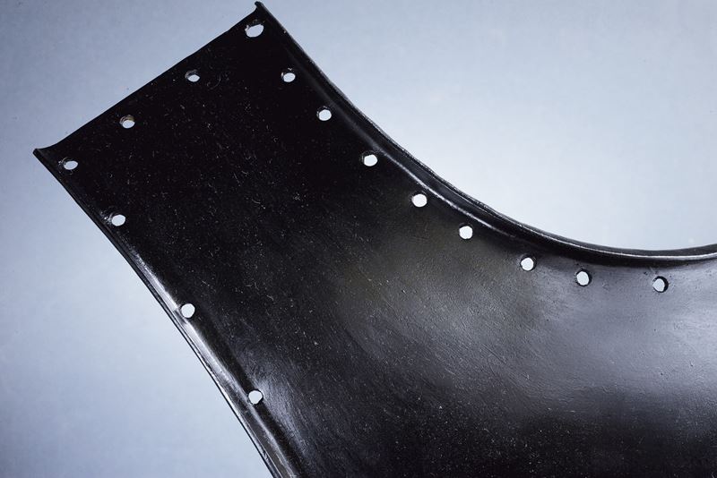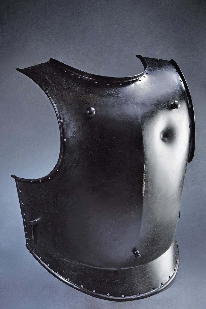 In ferro annerito (rinfrescato), ricavato da un unico pezzo, costolato in mezzeria; scollo e giri ascellari a bordo rialzato; traccia di prova di botta; due bottoni e due ganci laterali per il fissaggio delle cinghie. Tutti i bordi fittamente forati per l’alloggiamento della falsata. Peso 4.7 kg. In uso alla cavalleria austriaca fino al 1860.