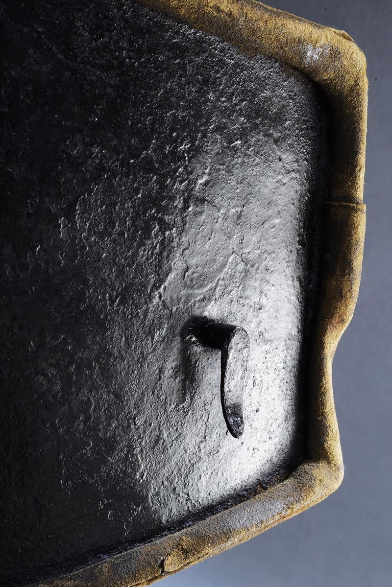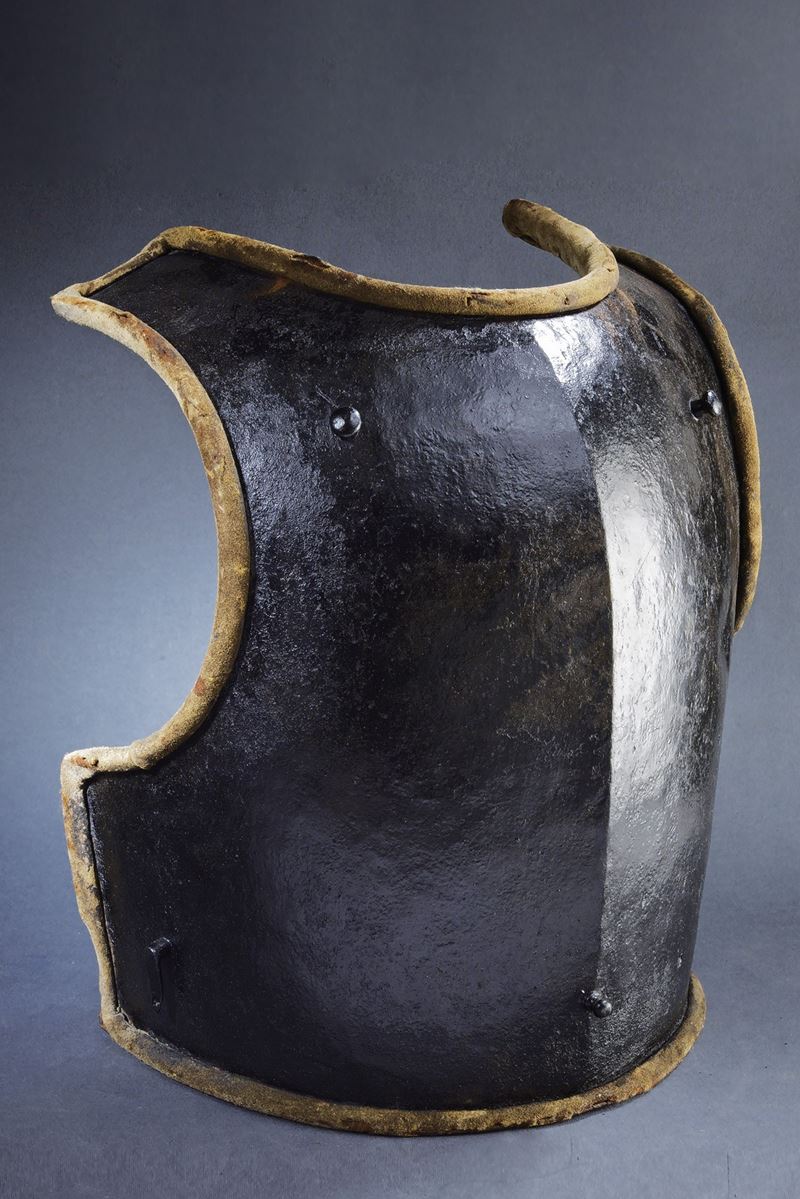 In ferro annerito, ricavato da un unico pezzo, costolato in mezzeria; scollo e giri ascellari a bordo rialzato; traccia di prova di botta; due bottoni e due ganci laterali per il fissaggio delle cinghie. Tutti i bordi rivestiti in cuoio, con piccoli resti della falsata. Peso 5,3 kg. Rara. In uso della cavalleria pesante austriaca del '700.