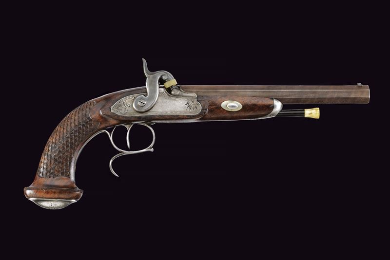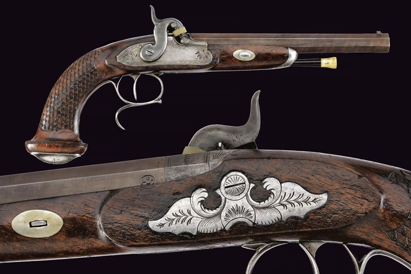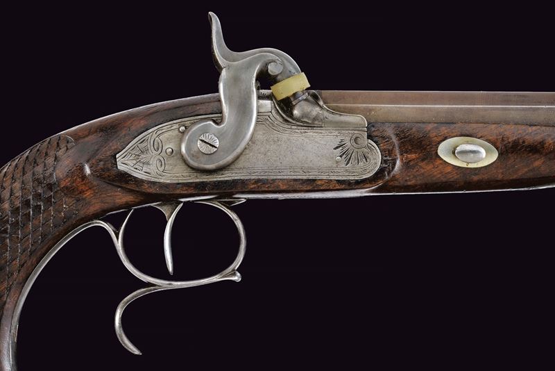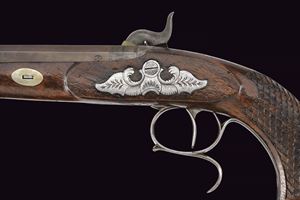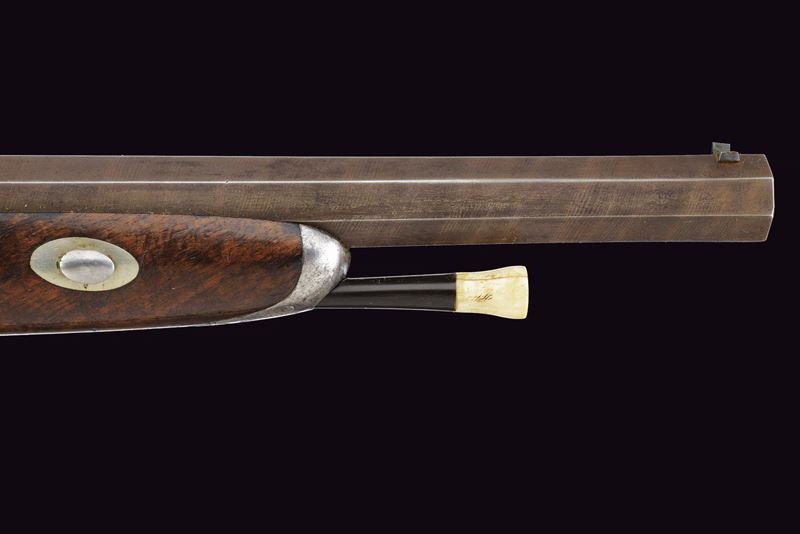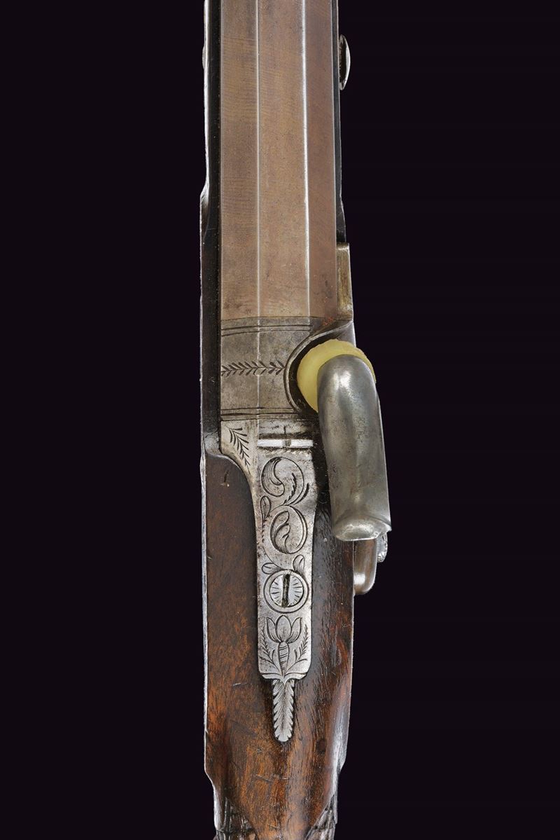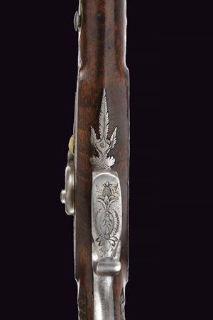 Canna ottagonale rigata, la base con cornici incise e sul lato sinistro con punzone del banco di prova di Liegi; mirino, cal. 12 mm. Codetta incisa a fiorami e munita di alzo. Batteria a luminello a molla in avanti con bordo inciso e coda con ragnatela; il cane probabilmente sostituito in epoca successiva. Mezza cassa in legno; il calcio scolpito con trama a griglia romboidale, questi presentano nel vertice basso un piccola sfera. Fornimenti in ferro inciso, il ponticello con poggiadito, la coccia di forma ellittica. Bacchetta in legno con battipalla in osso e cavastracci avvitabile in ferro.