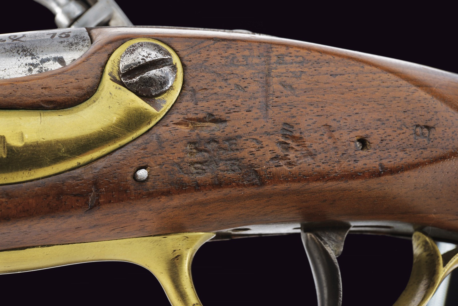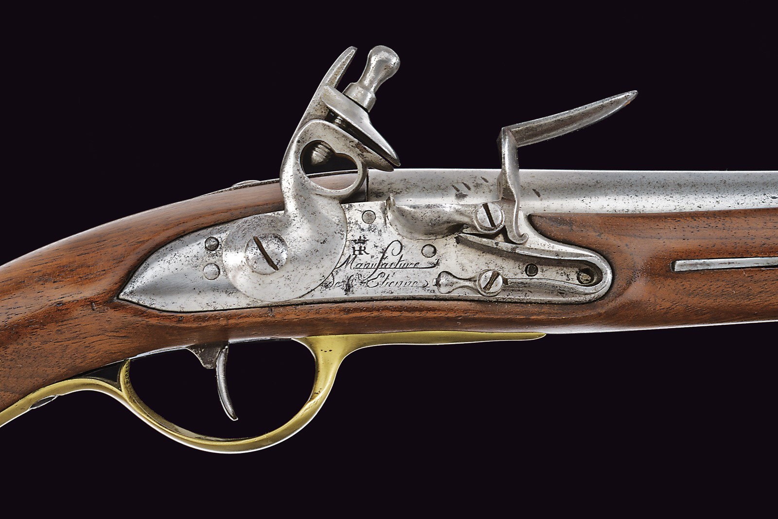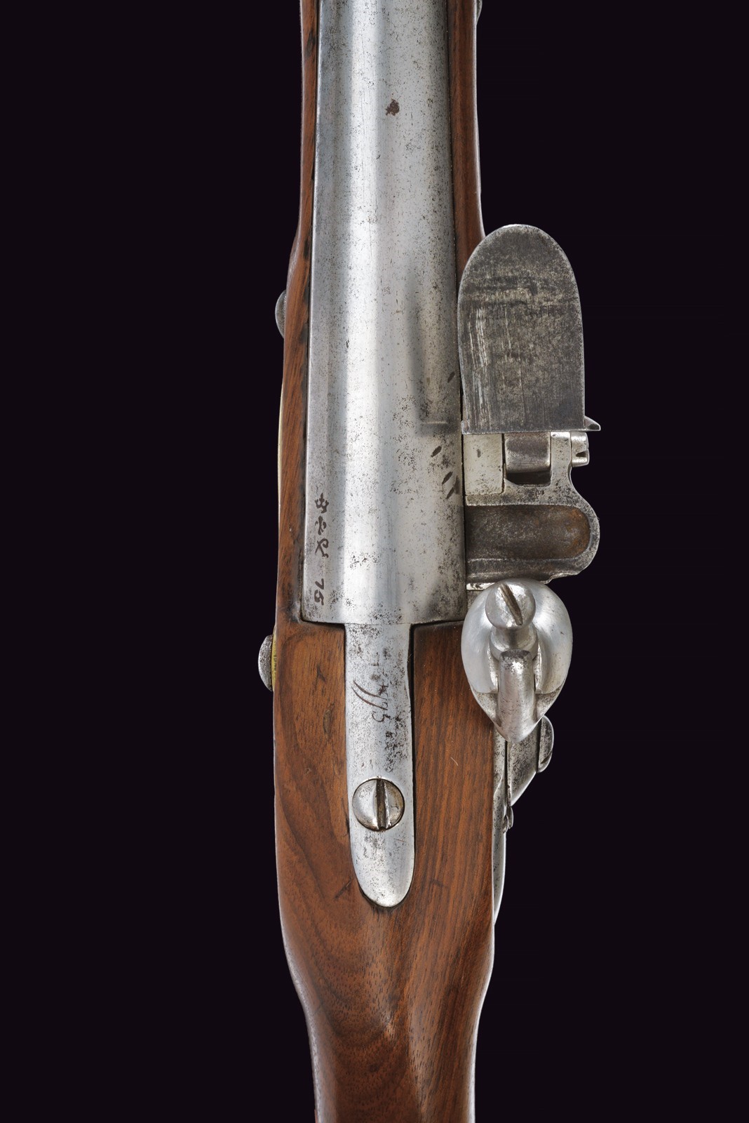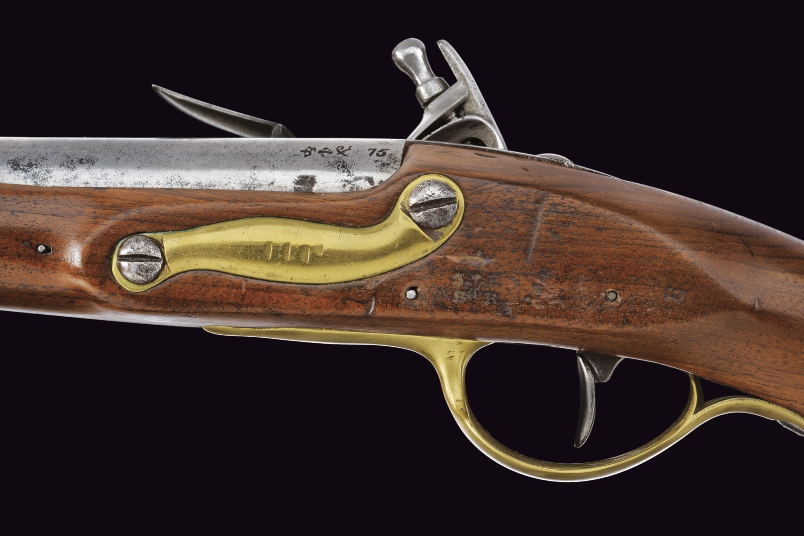 Canna tonda, liscia, la camera di scoppio con punzoni e numerata "75"; cal. 17 mm; codetta con dicitura del modello. Batteria a pietra focaia con firma della manifattura di St. Etienne e con punzone "HR" sotto corona. Cassa intera in legno in ottimo stato di conservazione, dietro alla contropiastra timbri ; con fornimenti in ottone e bacchetta in ferro.
