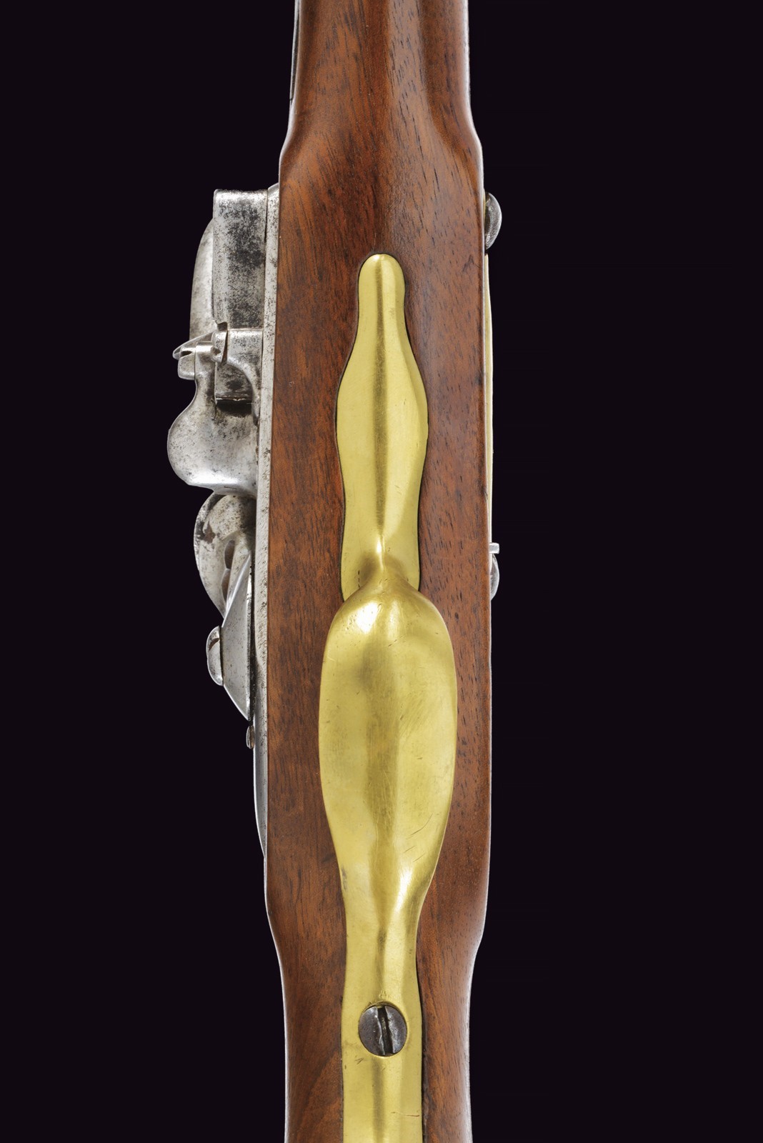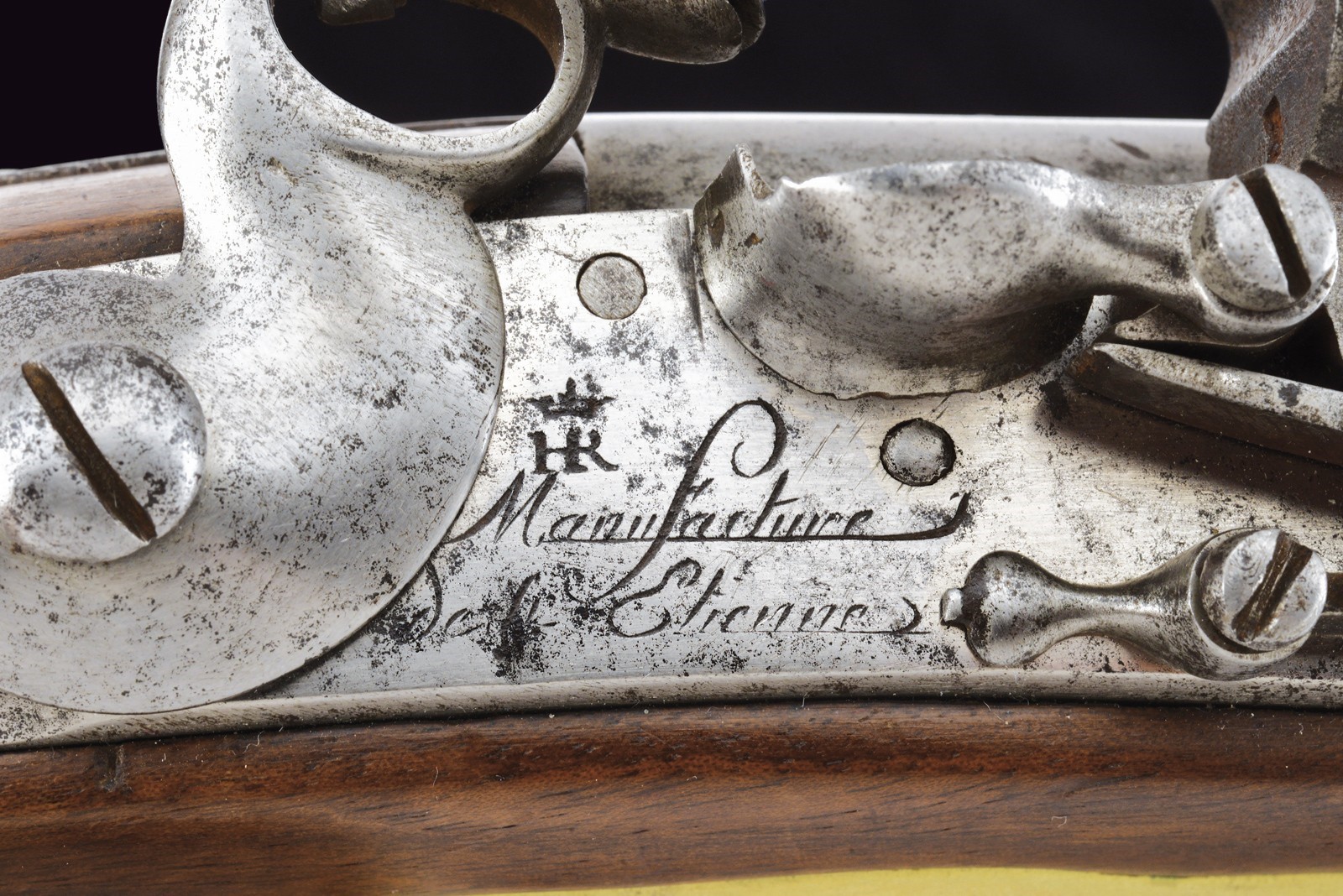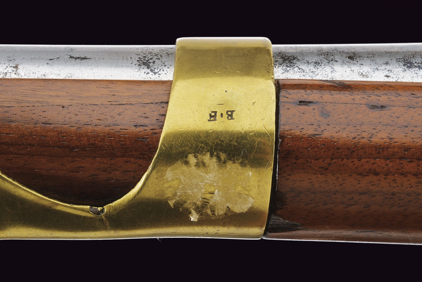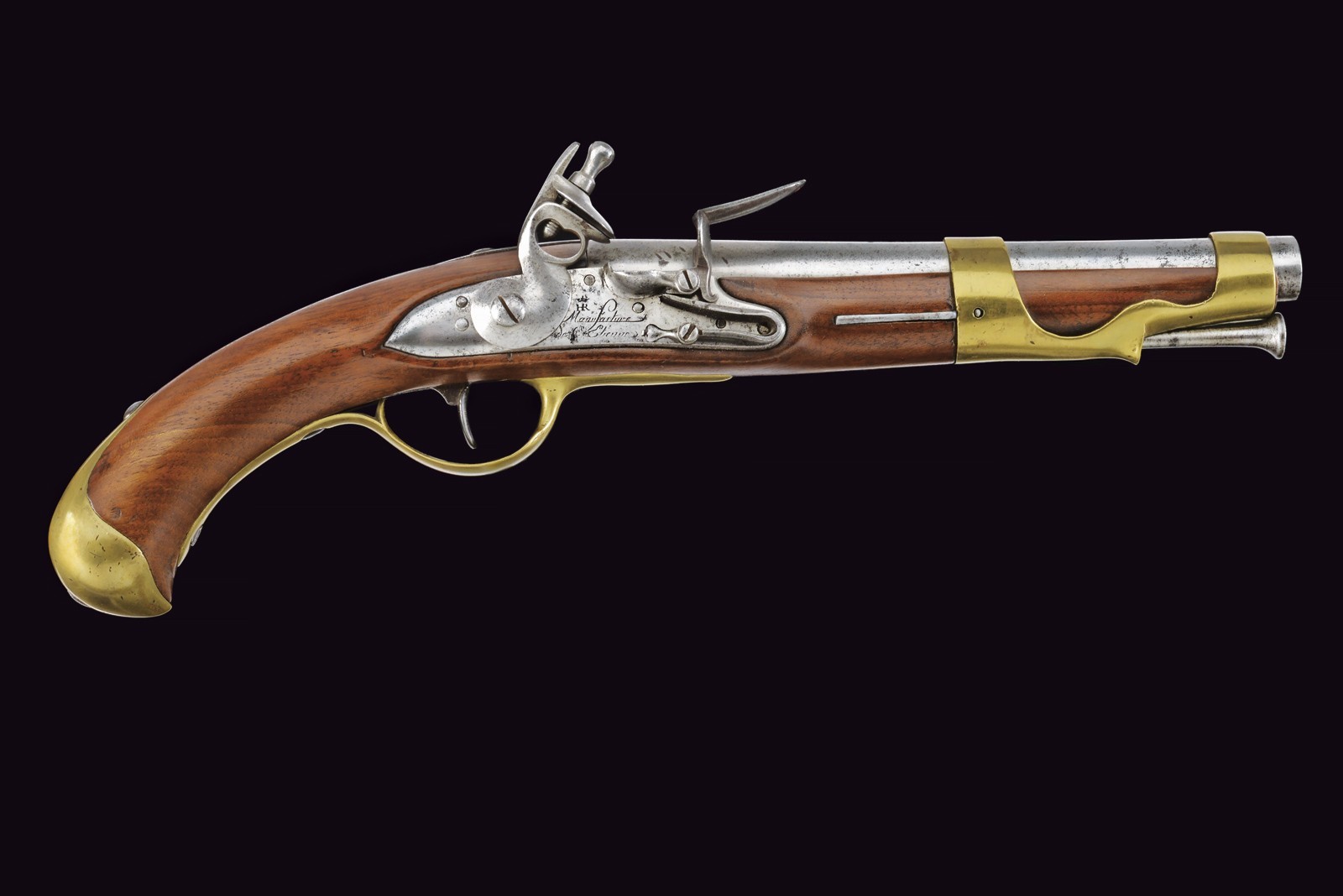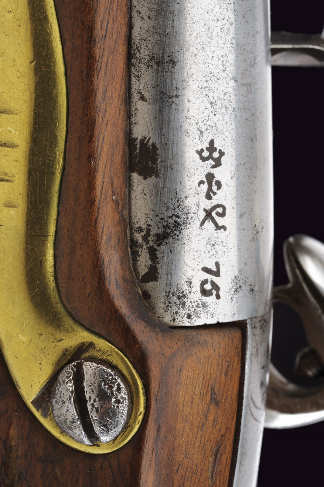 Canna tonda, liscia, la camera di scoppio con punzoni e numerata "75"; cal. 17 mm; codetta con dicitura del modello. Batteria a pietra focaia con firma della manifattura di St. Etienne e con punzone "HR" sotto corona. Cassa intera in legno in ottimo stato di conservazione, dietro alla contropiastra timbri ; con fornimenti in ottone e bacchetta in ferro.
