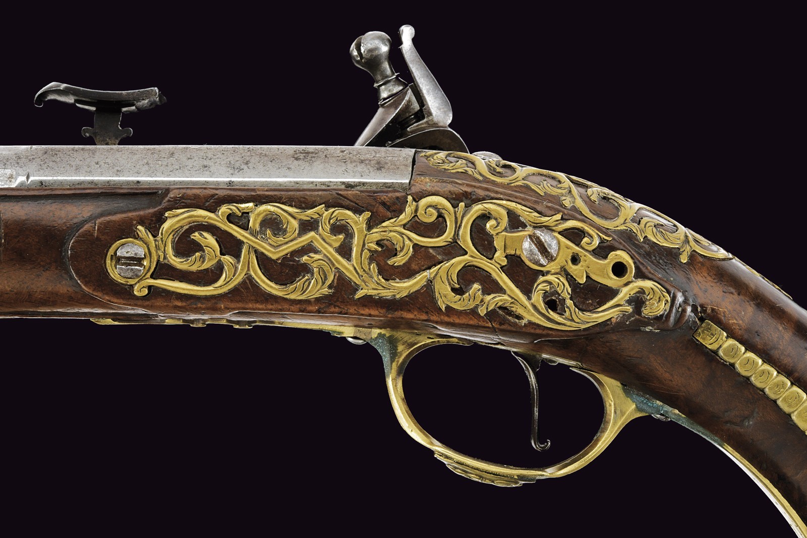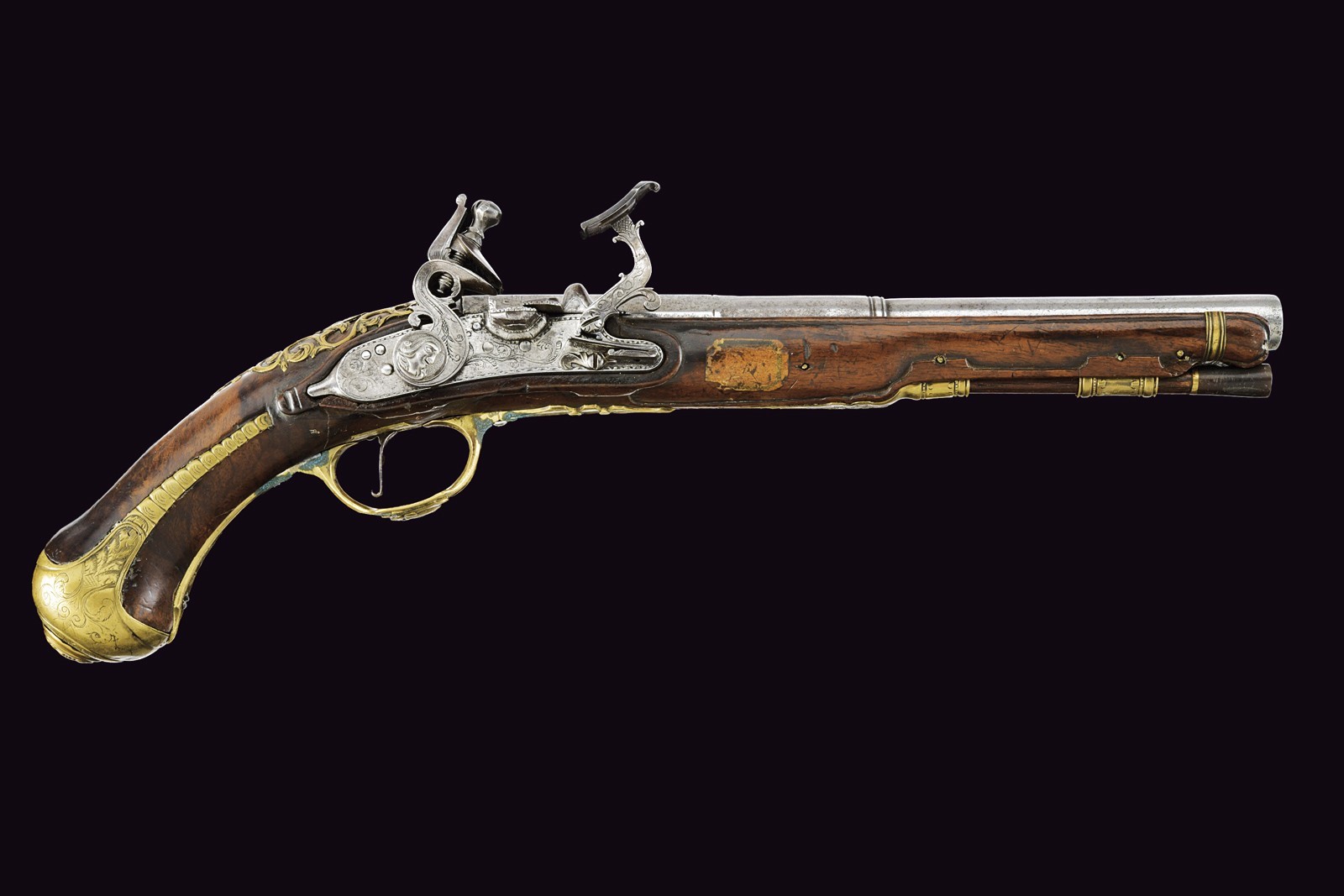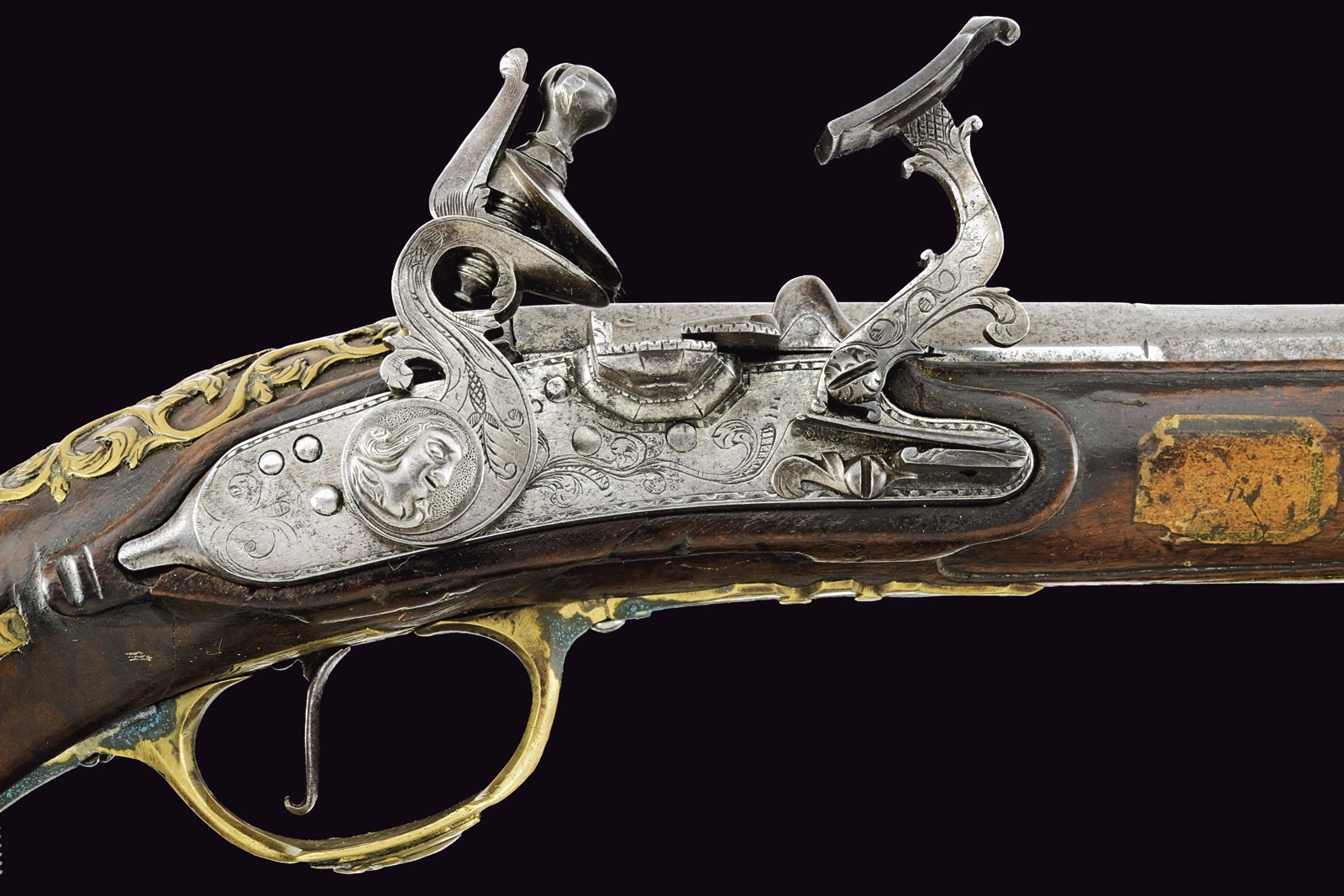 Canna liscia a tre ordini, quadra, faccettata e tonda con cornicetta scanalata al secondo cambio d'ordine, cal. 16 mm. Batteria con cartella, cane e collo della martellina piatti, con fini incisioni a volute, la vite del cane intagliata con un profilo muliebre; internamente firmata "Il Cerboncelli". Cassa intera in noce con profilature scorniciate; il terminale del fusto con una fascetta in ottone scanalato. Tutti i fornimenti in ottone ben incisi, il ponticelli e e il bottone della coccia con profili muliebri in rilievo. La contropiastra e il decoro introno alla codetta, intagliati e messi a giorno. Bacchetta in legno di restauro con battipalla in corno.