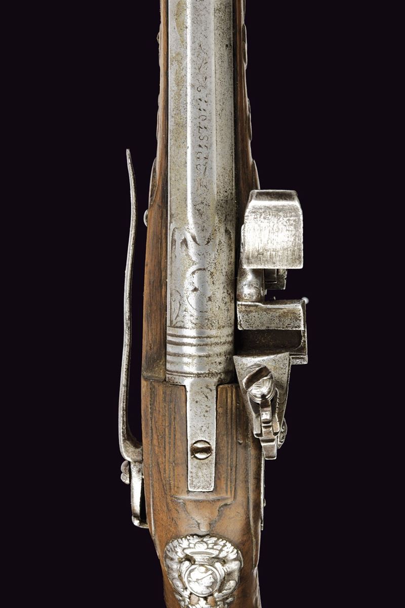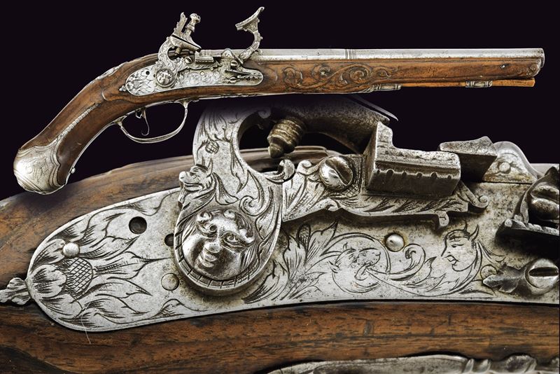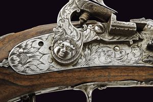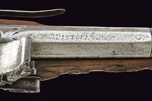 Canna liscia a due ordini, quadra e tonda con cornicette al cambio; alla camera di scoppio cornicette scanalate, resti di medaglione molto consunto e resti di una firma in stampatello "PISTOIA"; cal. 14 mm. Bella batteria di foggia arcaica con cartella piatta incisa a volute e fiorami, come pure il cane e la martellina; corpiscodellino scorrevole, vite del cane intagliata a forma di mascherone; all'interno firmata in stampatello "G. B.". Cassa intera in noce con cornice liscia intagliata intorno alla cartella e alla contropiastra, fusto sottocanna con motivi di volute in bassorilievo. Fornimenti in ferro, la contropiastra messa a girono con fiori e un medaglione, gancio da cintura liscio in ferro. Il calcio con un scudetto traforato con profilo. La coccia con incisioni di trofei di armi, il bottone sempre con mascherone. Bacchetta in legno.