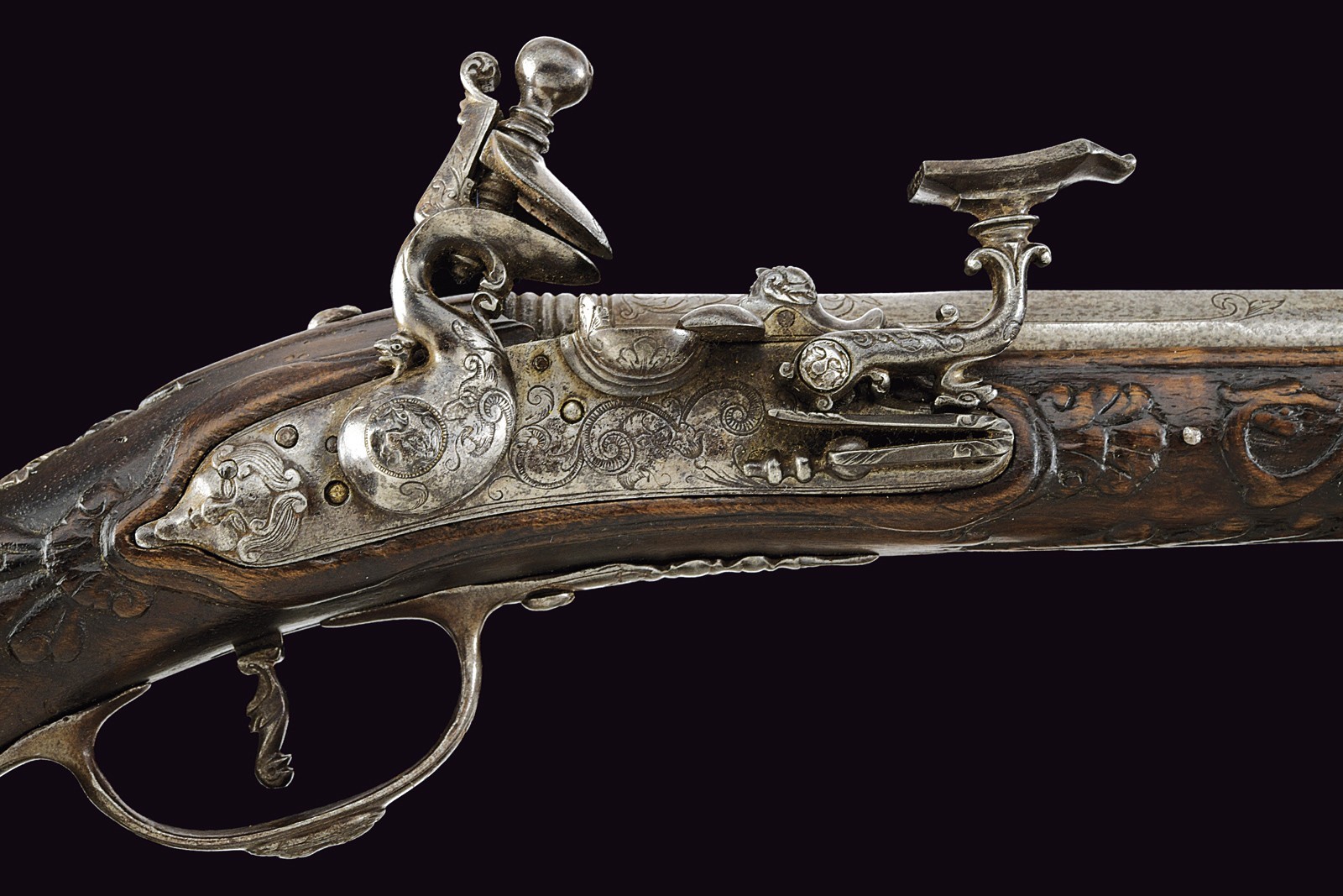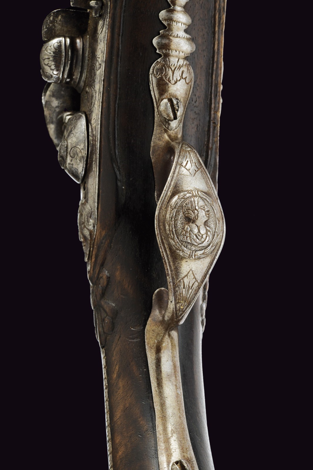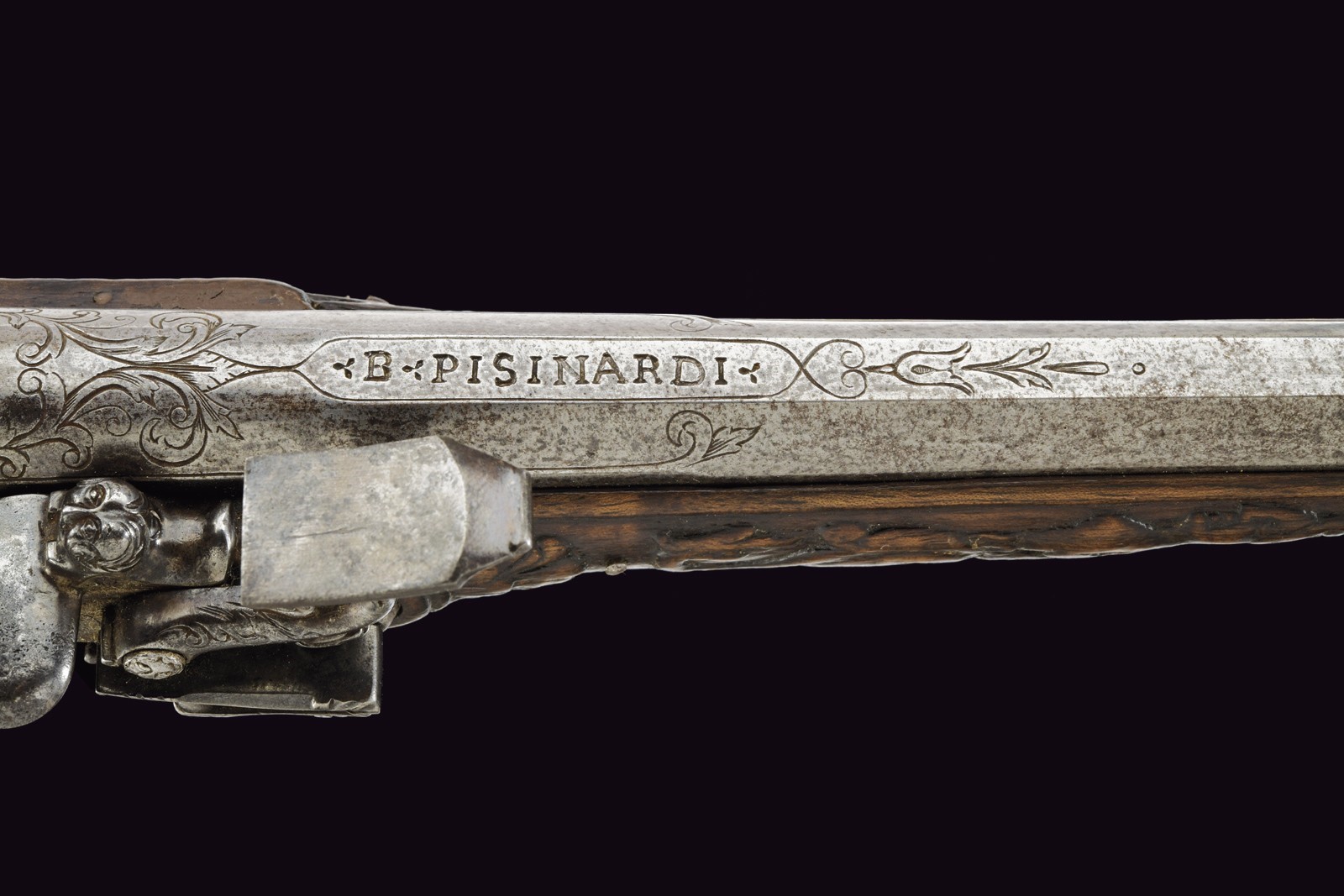 Canna liscia di forma tonda munita di culatta quadra e bindella su quasi tutta la lunghezza; alla camera di scoppio serie di cornicette ed anellature, in seguito incisioni floreali e all'inizio della bindella la firma in stampatello maiuscolo "B PISINARDI; in volata ulteriori incisioni floreali, cal. 11.5 mm. Batteria a pietra con cartella tondeggiante incisa a volute floreali, la coda con mascherone. Cassa intera in legno (segni d'uso e del tempo, piccoli difetti), scolpita al fusto a grottesche, volute e busto. Fornimenti in ferro incisi a volute floreali e grottesche. Bacchetta in legno con cavastarcci in ferro e battipalla in osso.