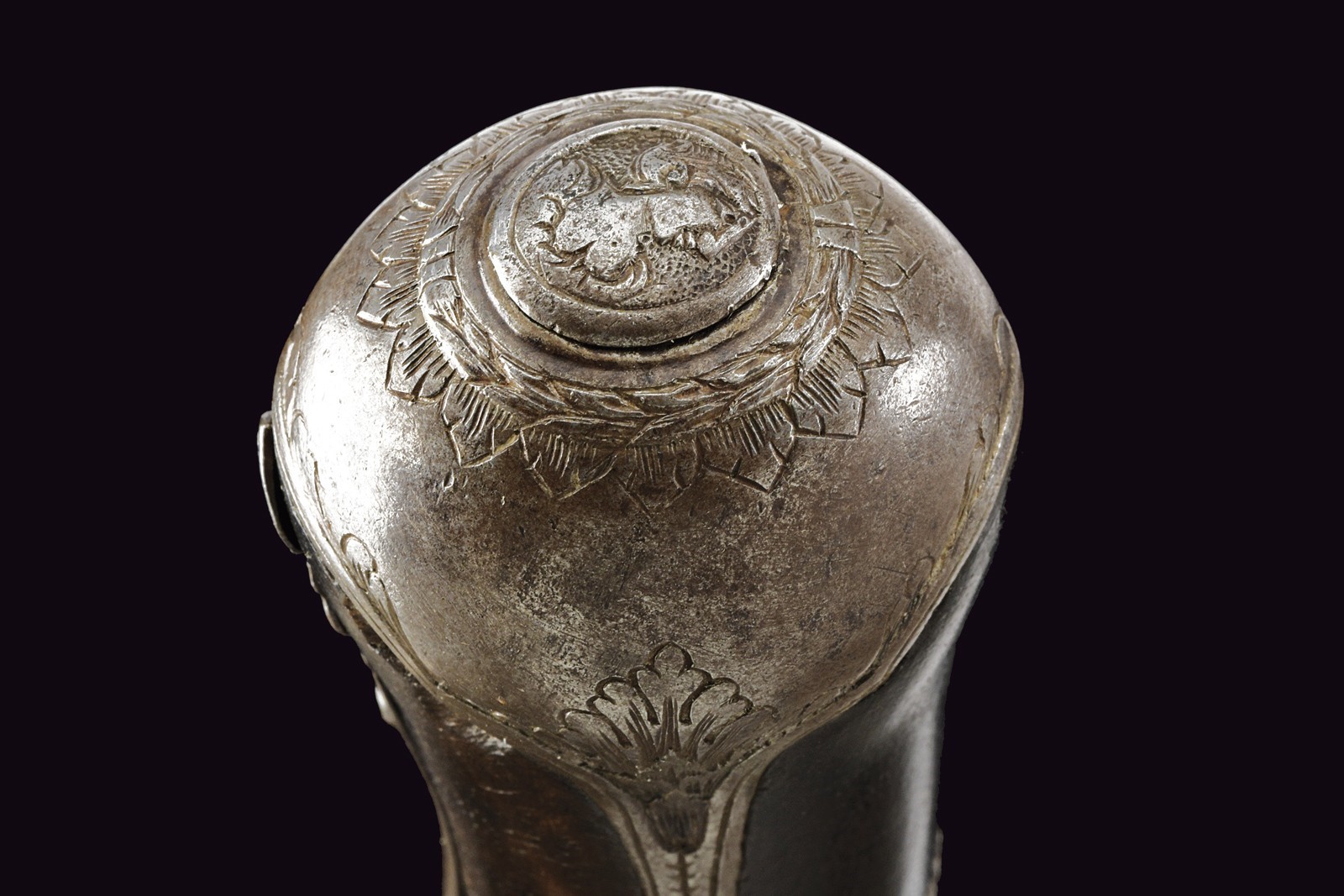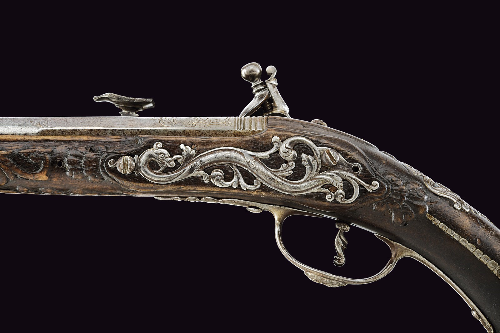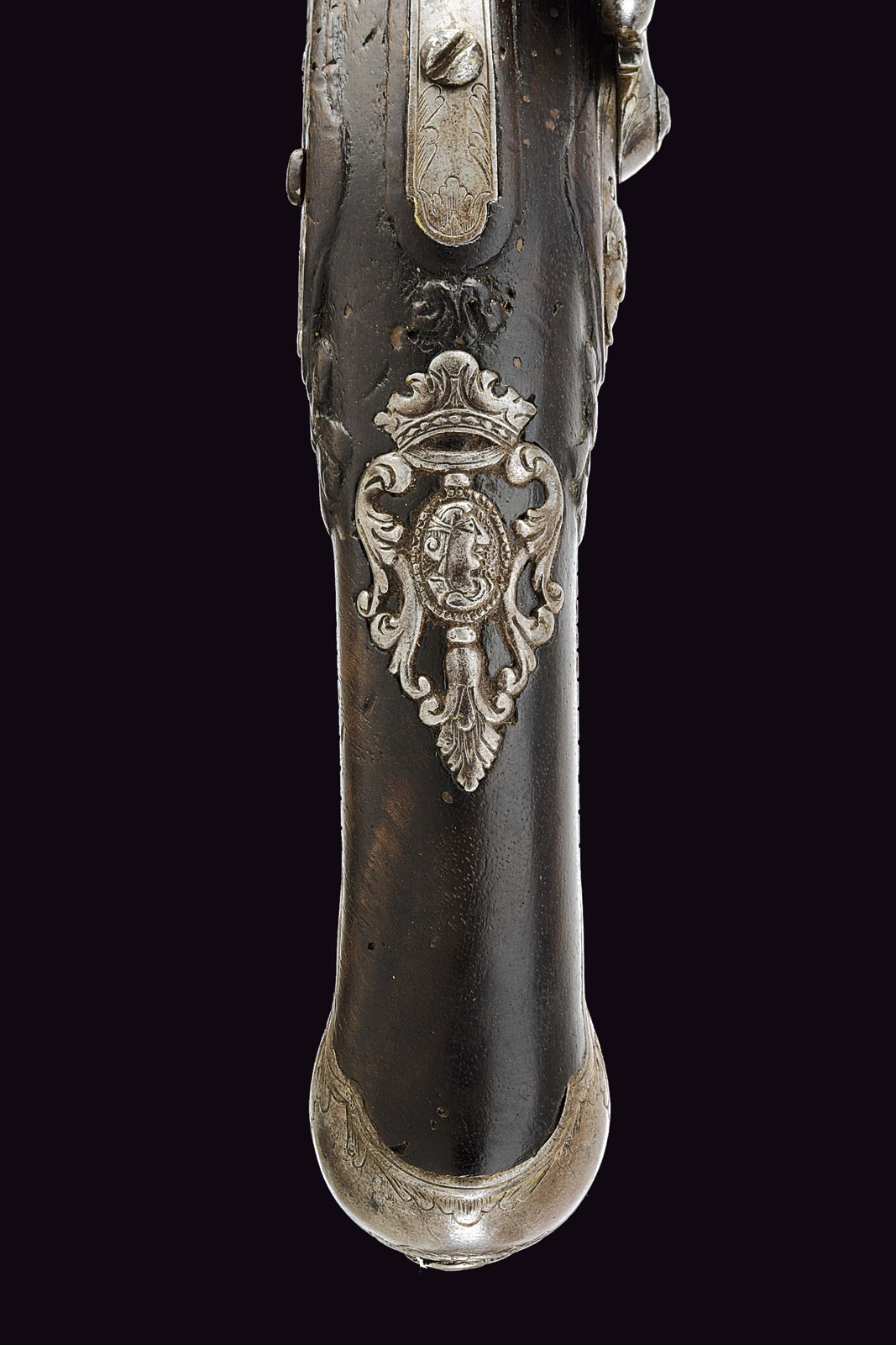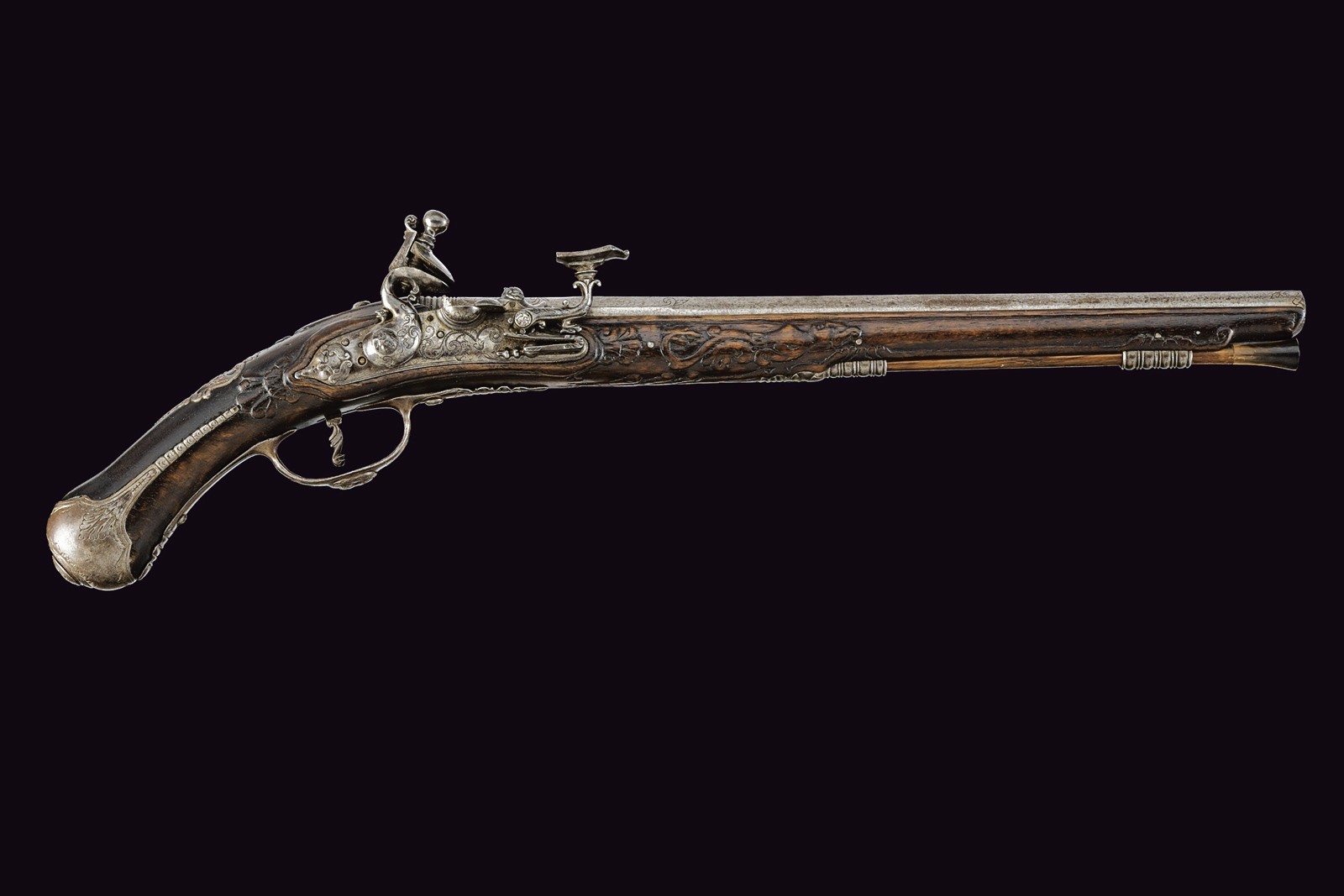 Canna liscia di forma tonda munita di culatta quadra e bindella su quasi tutta la lunghezza; alla camera di scoppio serie di cornicette ed anellature, in seguito incisioni floreali e all'inizio della bindella la firma in stampatello maiuscolo "B PISINARDI; in volata ulteriori incisioni floreali, cal. 11.5 mm. Batteria a pietra con cartella tondeggiante incisa a volute floreali, la coda con mascherone. Cassa intera in legno (segni d'uso e del tempo, piccoli difetti), scolpita al fusto a grottesche, volute e busto. Fornimenti in ferro incisi a volute floreali e grottesche. Bacchetta in legno con cavastarcci in ferro e battipalla in osso.
