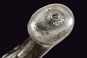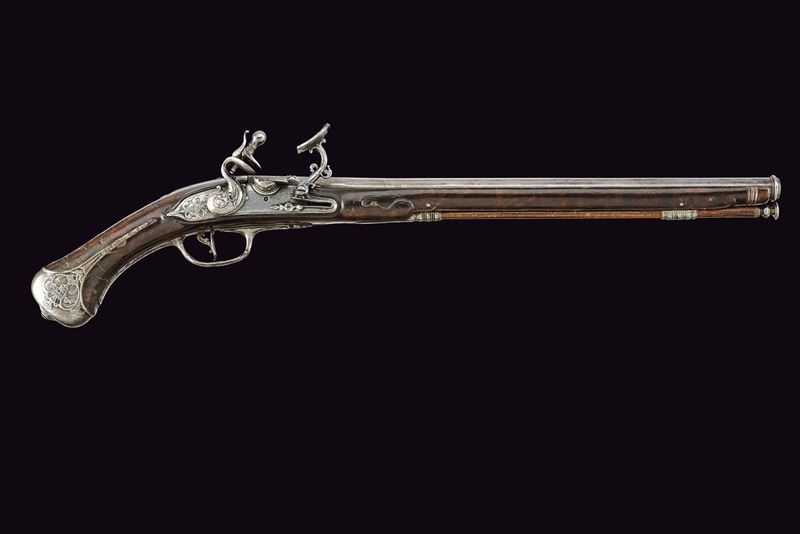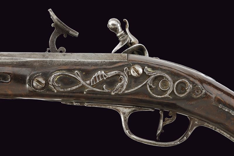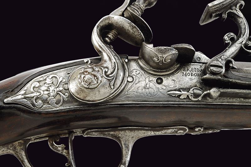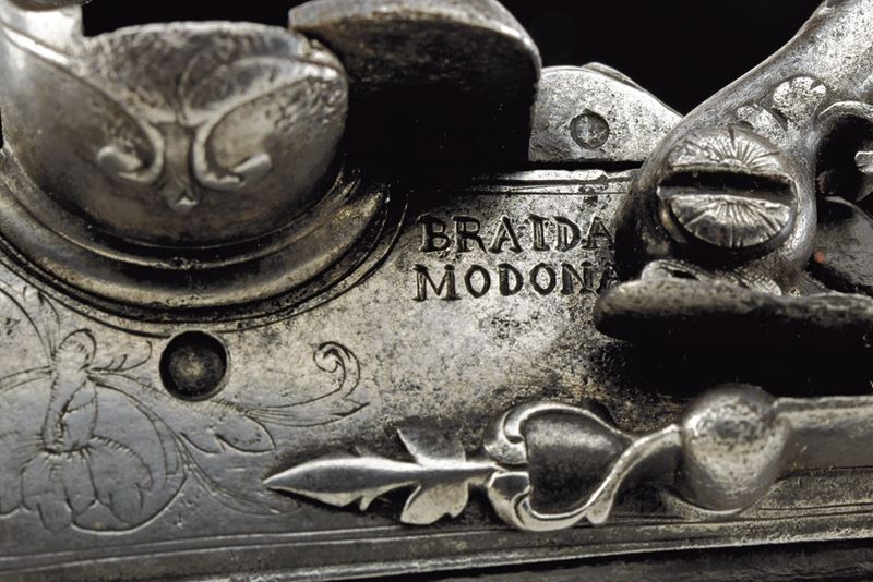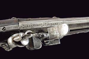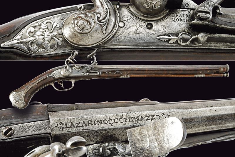 Canna lunga, liscia, a due ordini, prima quadra e poi a multi facce, alla camera di scoppio la firma "LAZARINO COMINAZZO" fra trifogli( vedi "Brescian Firearms" di Nolfo di Carpegna, Roma 1997, a pag. 253-57); alla volta piccola gioia di bocca, cal. 12.5 mm. Batteria a pietra, cartella firmata "BRAIDA MODONA", al centro con incisione a motivo floreale, la coda con mascherone in bassorilievo; collo del cane e della martellina operati a volute. Cassa intera in radica ( piccoli difetti e piccoli restauri al calcio). Fornimenti in ferro sobriamente incisi ed intagliati a volute e grottesche. Bacchetta in legno con castrati in ferro e testa tornita a balaustro.