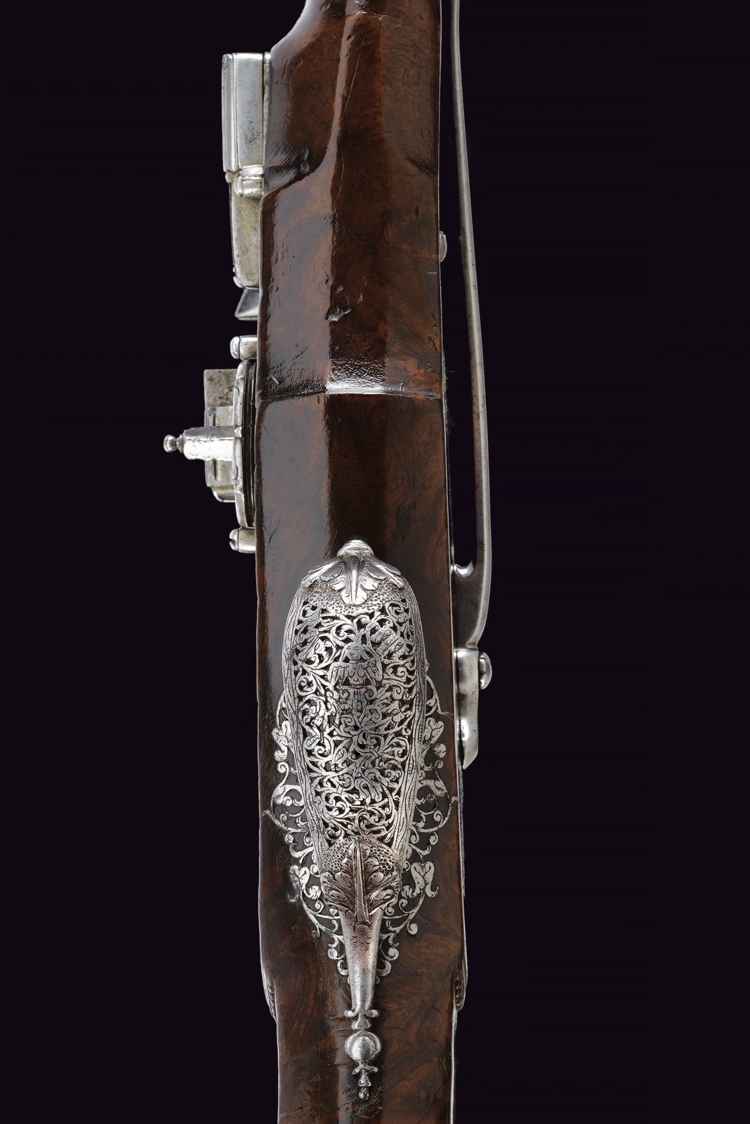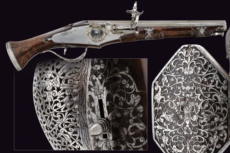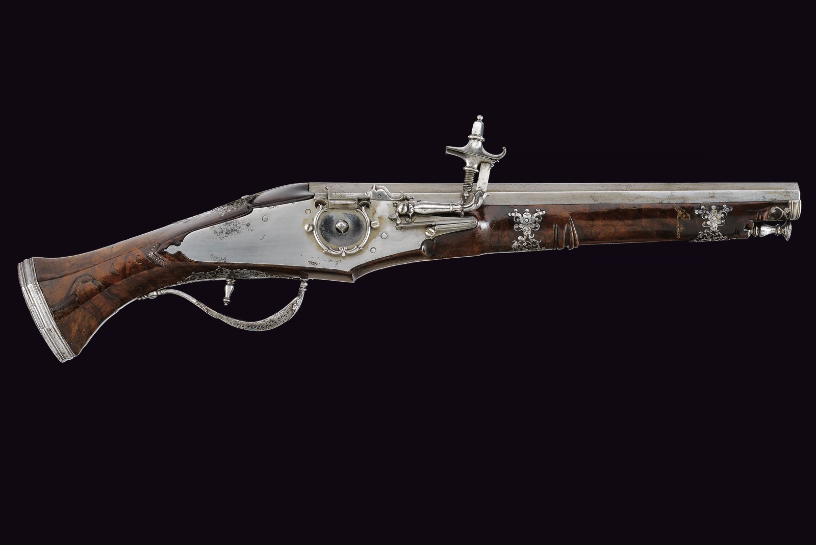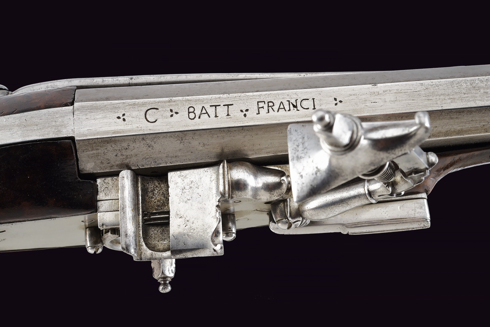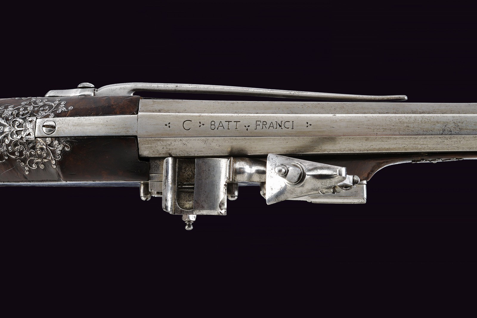 Canna liscia ottagonale, con rima apocrifa sulla canna "G. BATT. FRANCI" tra triplici puntinature; cal. 14 mm. Piastra a ruota di tipica foggia Brescia, cartella liscia con copri ruota intagliato, cane a balaustro con intaglio floreale; all'interno la marca tonda di Giovanni Antonio Gavacciolo. Cassa intera in noce ornata da tipici fornimenti in acciaio, messi a giorno ed incassati. Impugnatura faccettata con coccia in acciaio scanalato, recante decorazioni en suite. Gancio da cintura. Bacchetta in legno con cavastracci e battipalla tornito.