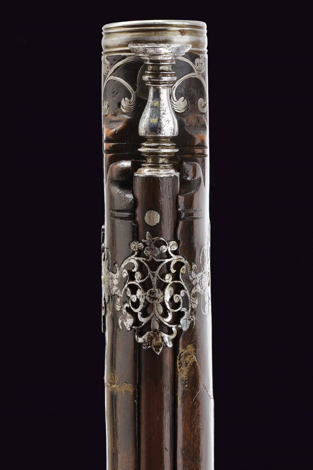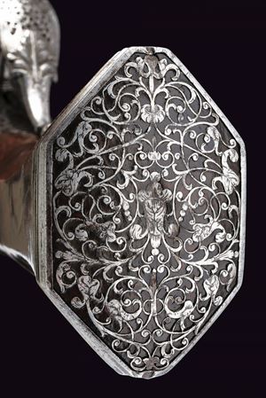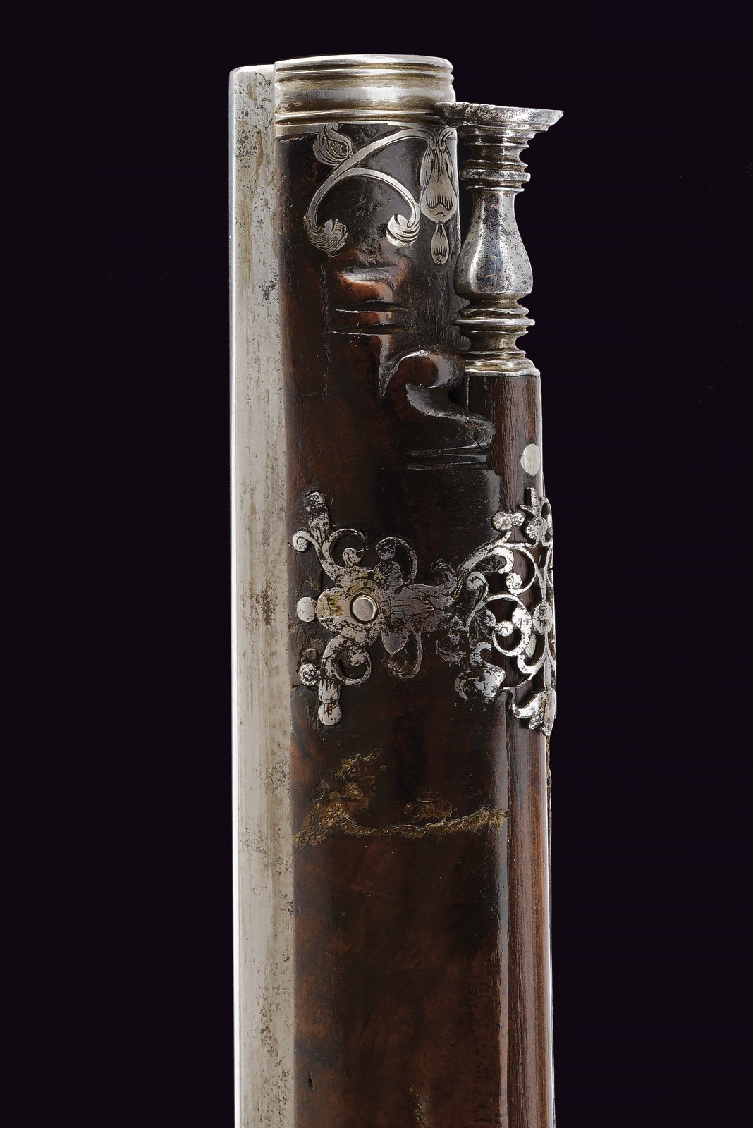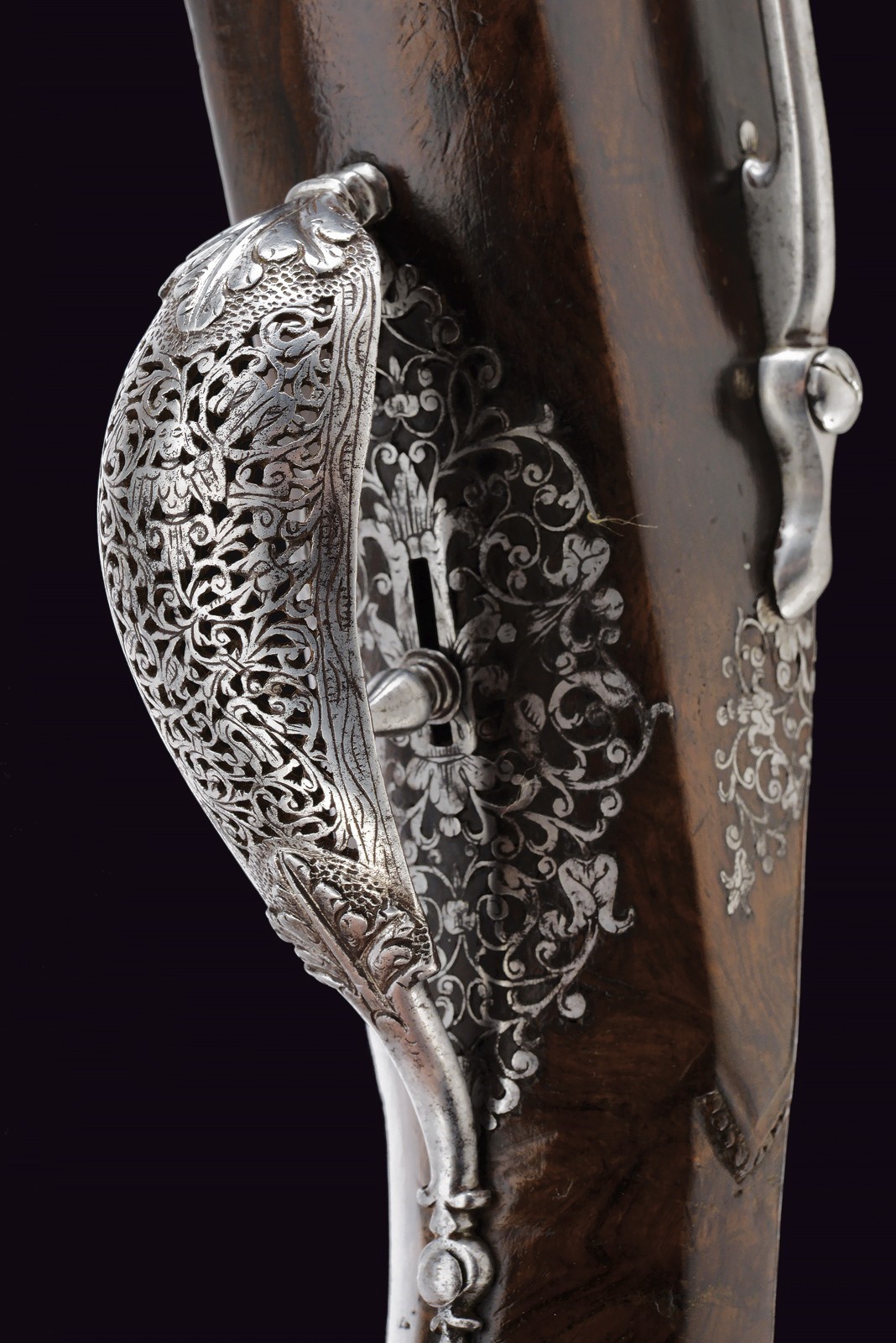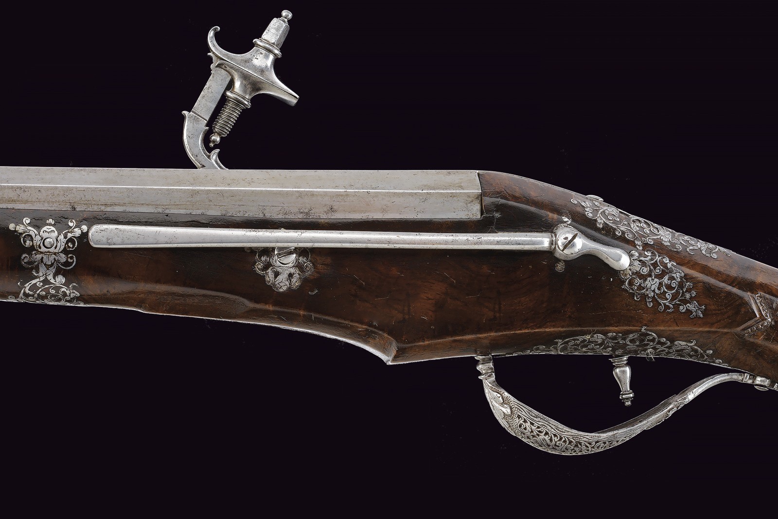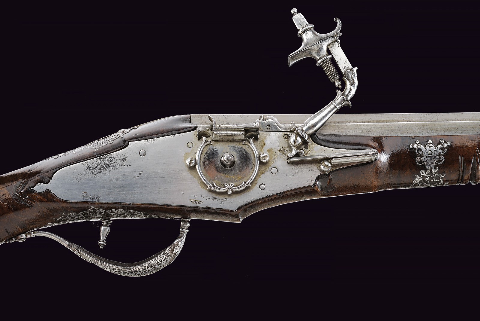 Canna liscia ottagonale, con rima apocrifa sulla canna "G. BATT. FRANCI" tra triplici puntinature; cal. 14 mm. Piastra a ruota di tipica foggia Brescia, cartella liscia con copri ruota intagliato, cane a balaustro con intaglio floreale; all'interno la marca tonda di Giovanni Antonio Gavacciolo. Cassa intera in noce ornata da tipici fornimenti in acciaio, messi a giorno ed incassati. Impugnatura faccettata con coccia in acciaio scanalato, recante decorazioni en suite. Gancio da cintura. Bacchetta in legno con cavastracci e battipalla tornito.