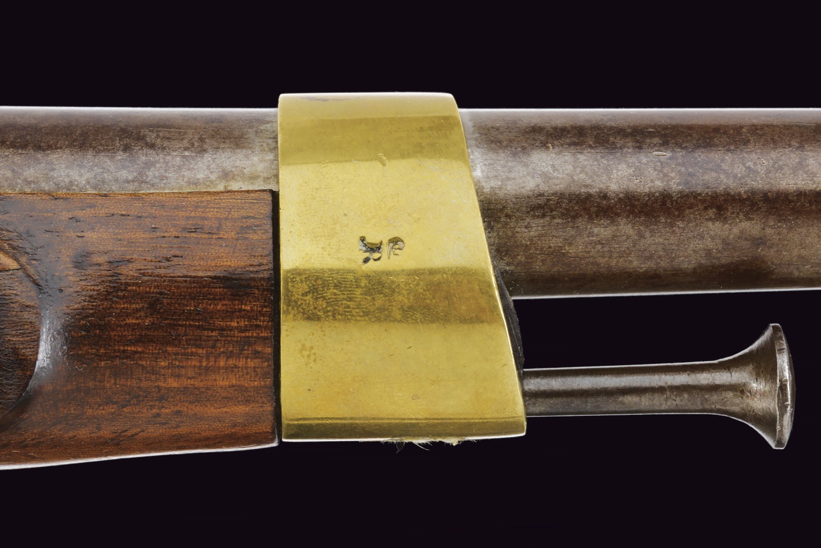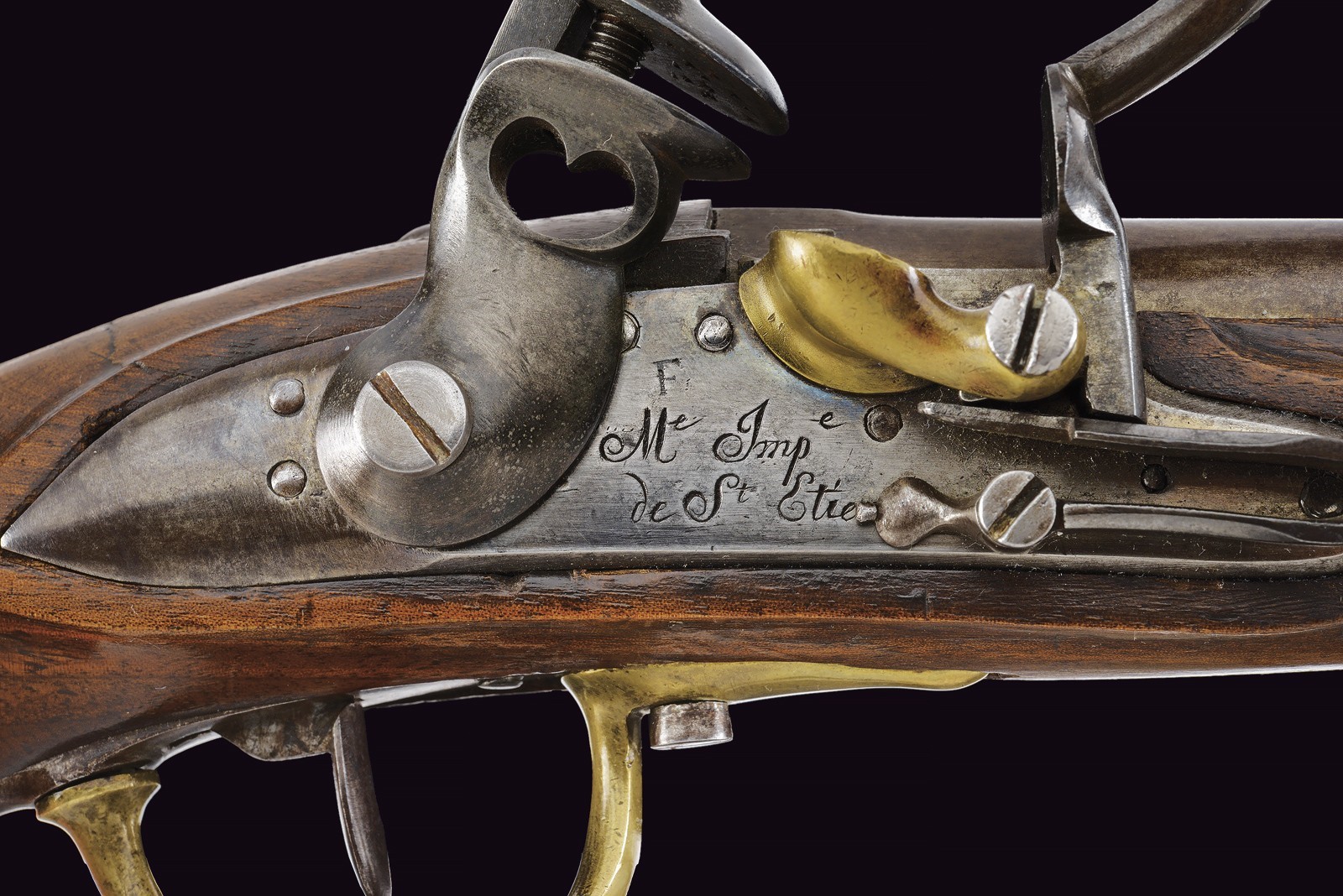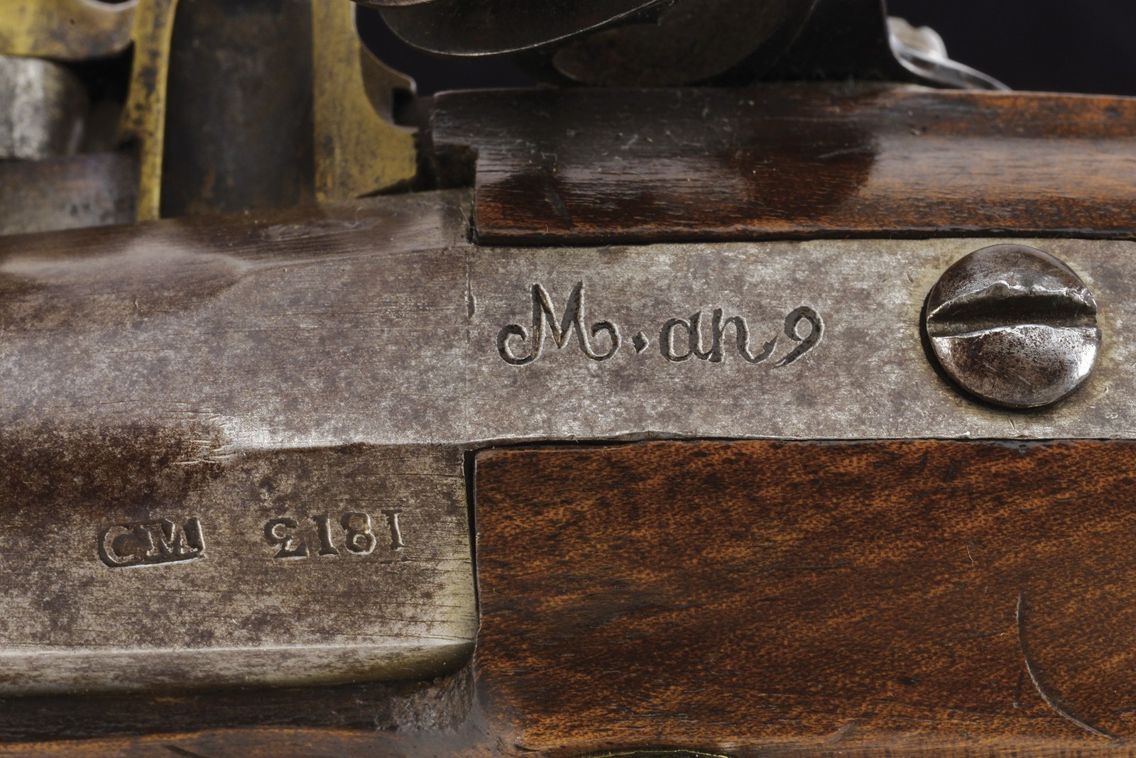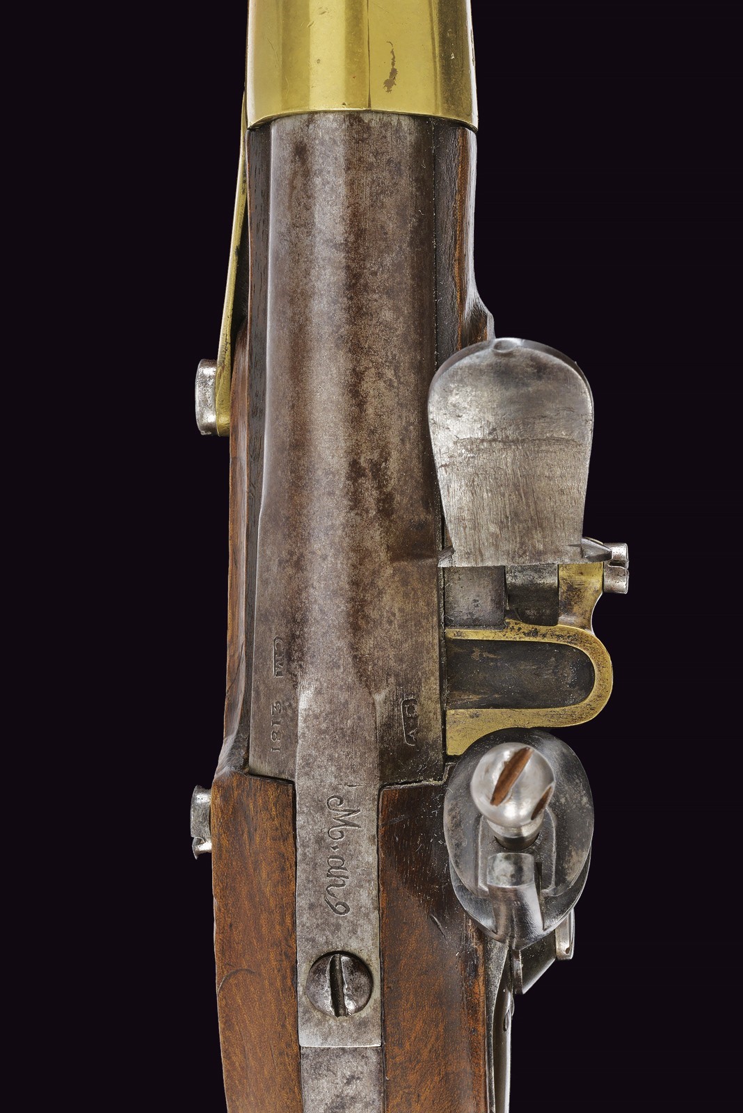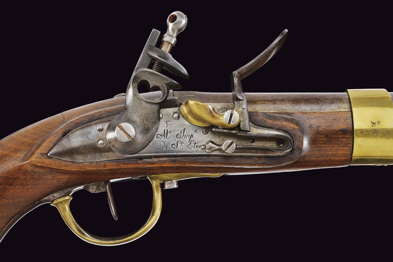 Canna tonda liscia con culatta quadra marcata "1813 e con punzoni "A C " e "C M", cal. 17 mm. Codetta con dicitura del modello. Batteria a pietra focaia con cartella piatta e marcata con la manifattura imperiale di St. etienne e con punzone "F"; scodellino in ottone, coda tondeggiante. Mezza cassa in legno con fornimenti in ottone punzonati. Bacchetta in ferro.