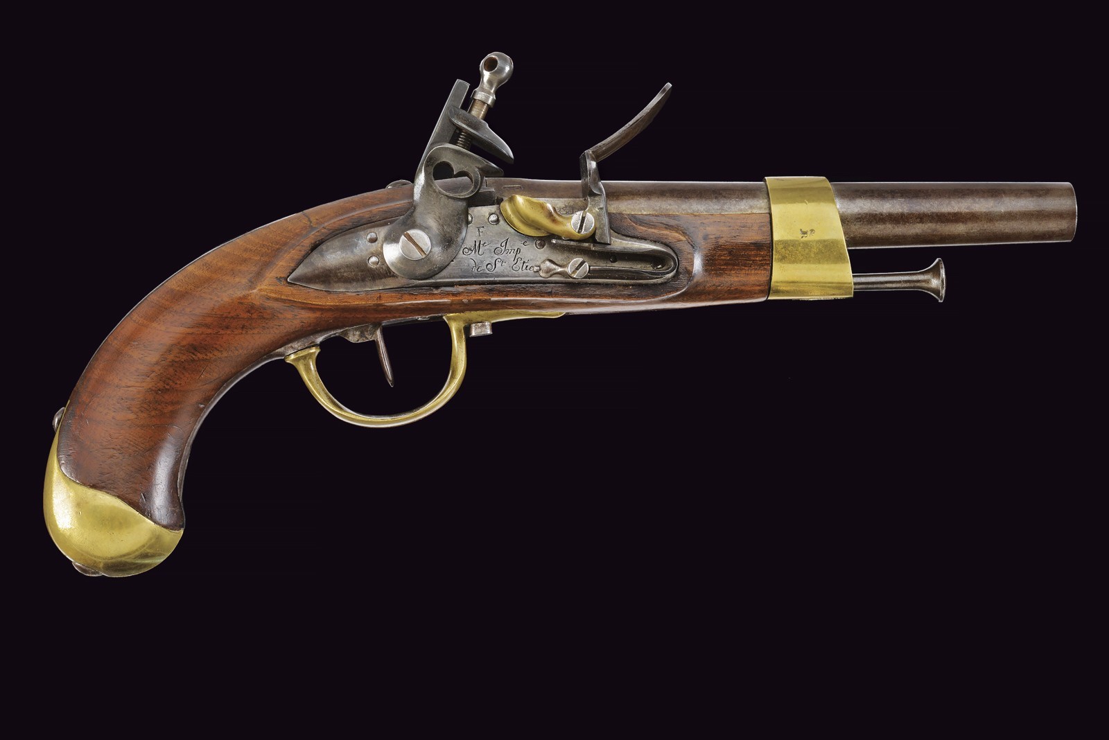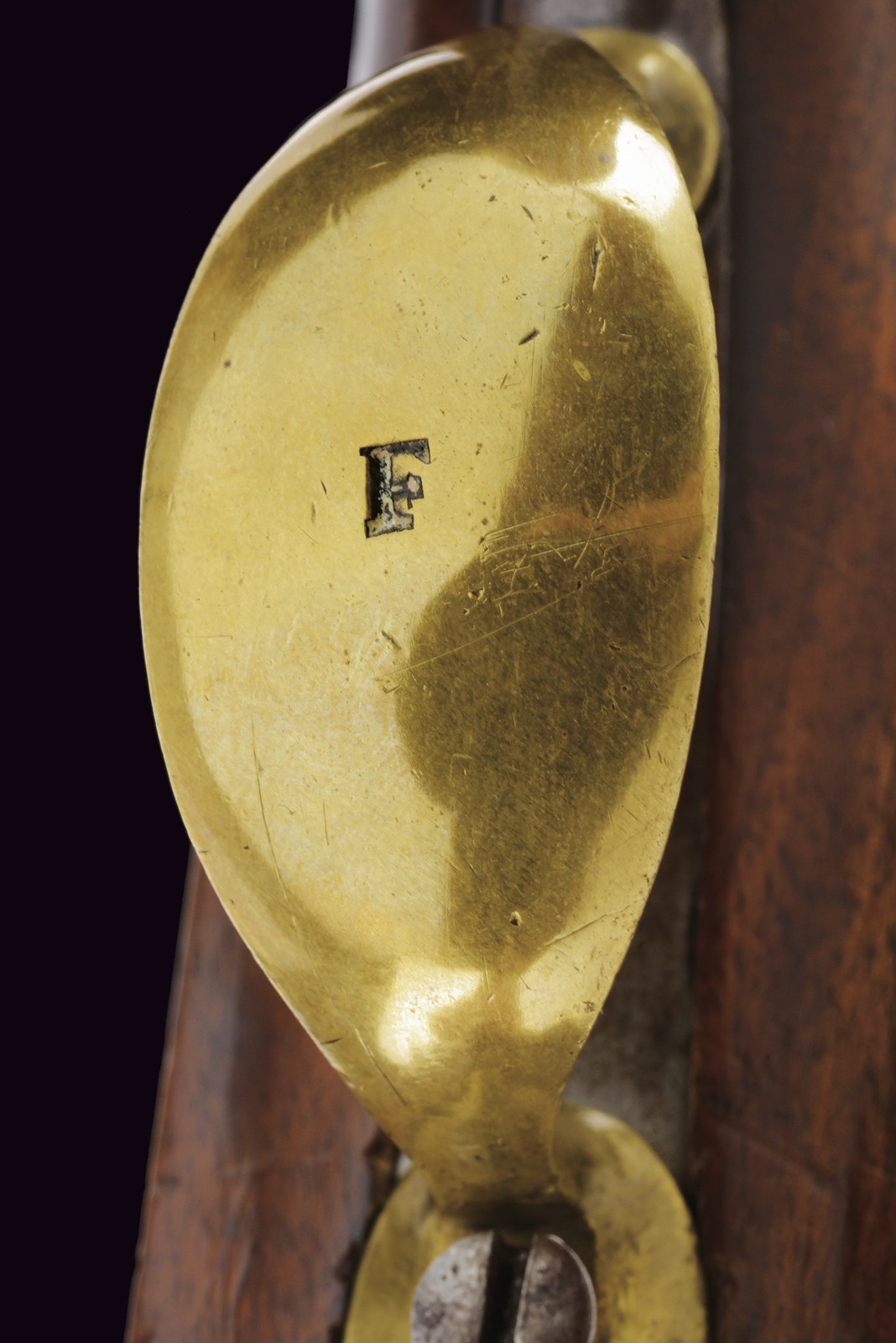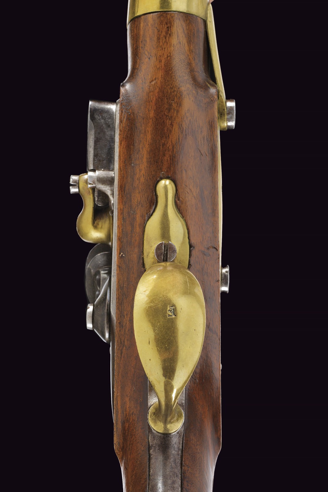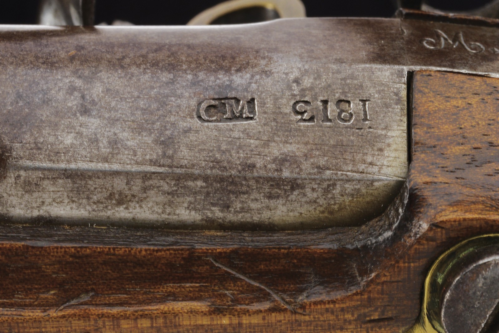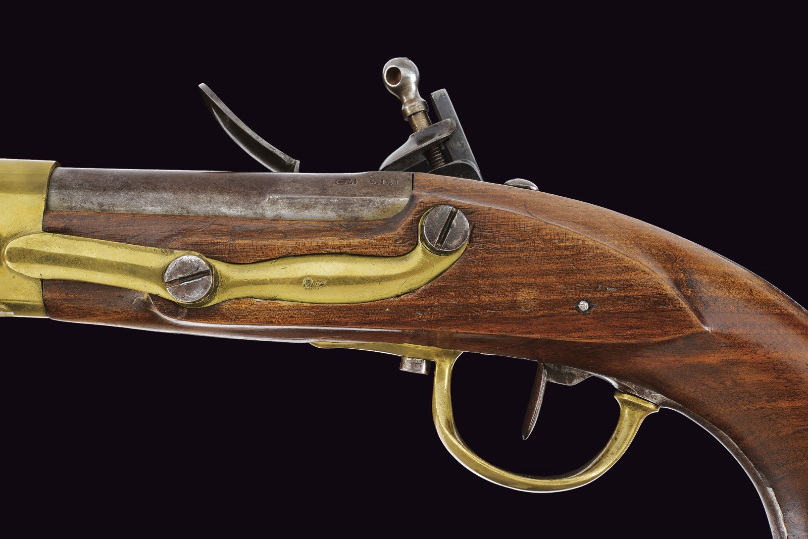 Canna tonda liscia con culatta quadra marcata "1813 e con punzoni "A C " e "C M", cal. 17 mm. Codetta con dicitura del modello. Batteria a pietra focaia con cartella piatta e marcata con la manifattura imperiale di St. etienne e con punzone "F"; scodellino in ottone, coda tondeggiante. Mezza cassa in legno con fornimenti in ottone punzonati. Bacchetta in ferro.