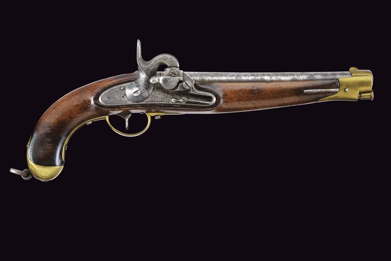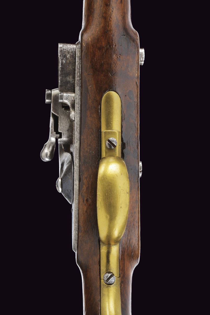 Canna liscia, la superficie con danni da ruggine, tonda con base lievemente quadra e con resti di due marchi poco leggibili; mirino sul bocchino; calibro 17 mm. Batteria con sistema Augustin, la cartella marcata "84" e con aquila bicipite, meccanica funzionante a due scatti. Cassa intera in legno con fornimenti in ottone. Bacchetta in ferro con battipalla in ottone. La coccia con anello di sospensione in ferro. Interessante e rara, solo pochi altri esemplari conosciuti.