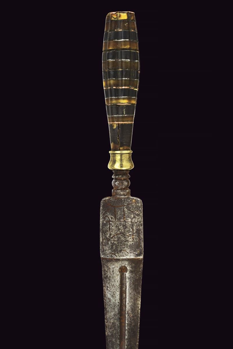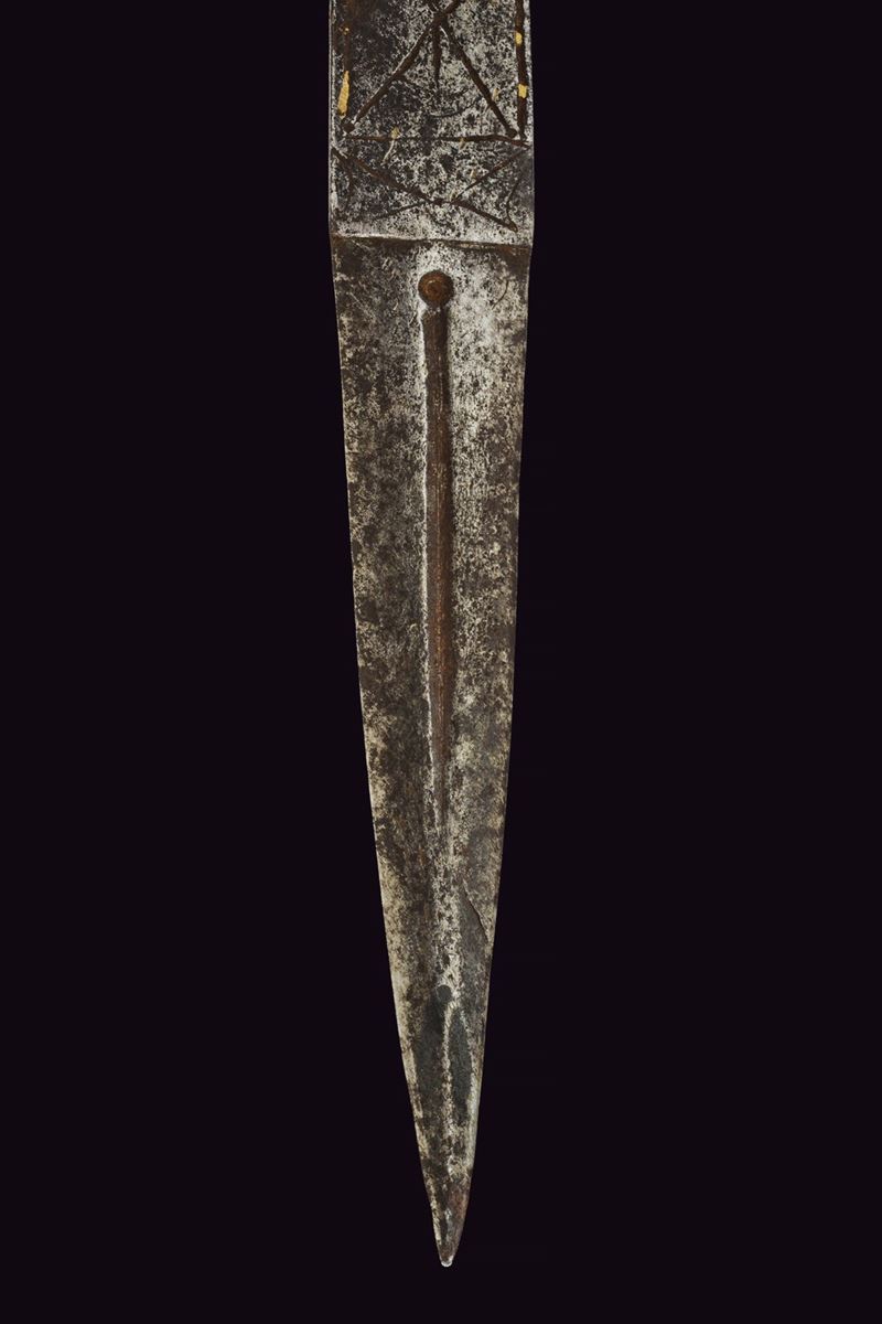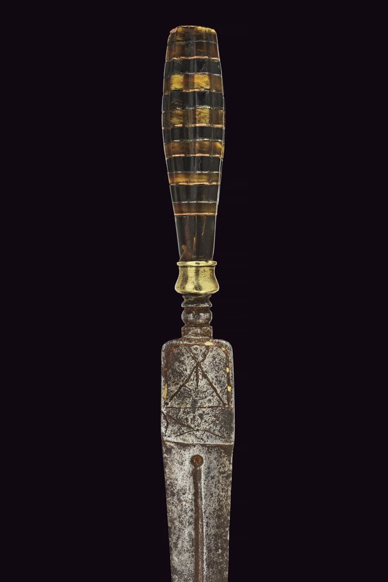 Lama a due fili con sguscio centrale, tallone rettangolare con semplici decori geometrici. Doppio nodo schiacciato tra scanalature. Ghiera in argento a vaso. Impugnatura scanalata composta da settori di corno in varie colorazioni, alternate da dischetti in rame e piombo.