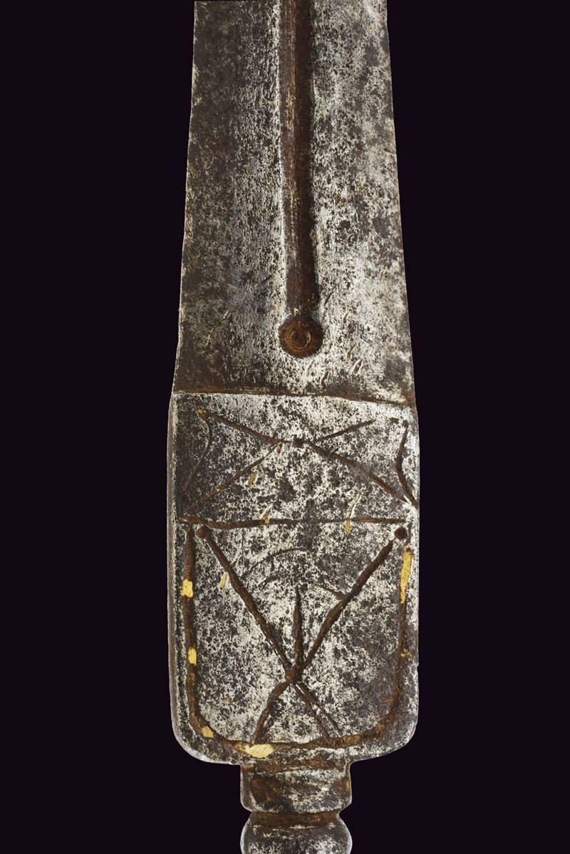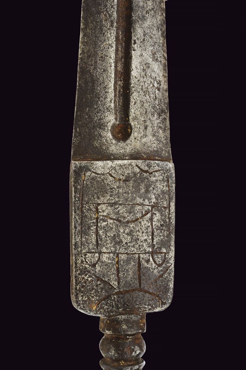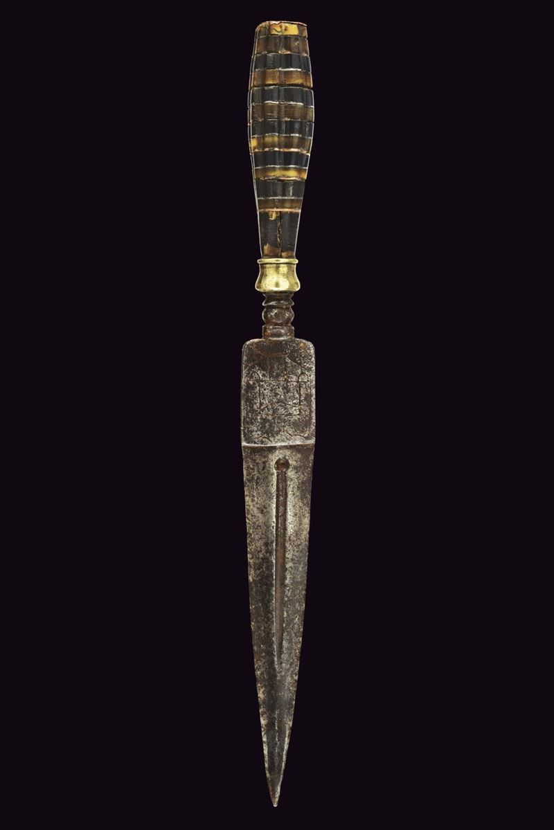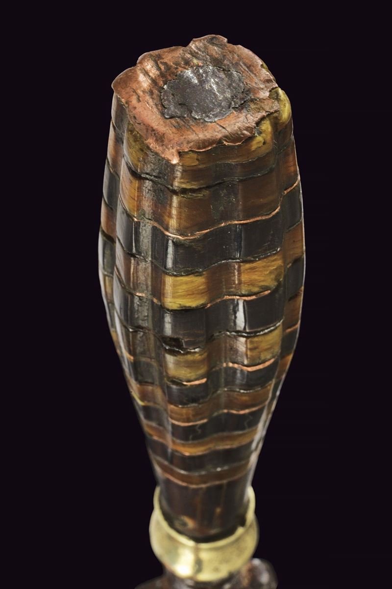 Lama a due fili con sguscio centrale, tallone rettangolare con semplici decori geometrici. Doppio nodo schiacciato tra scanalature. Ghiera in argento a vaso. Impugnatura scanalata composta da settori di corno in varie colorazioni, alternate da dischetti in rame e piombo.