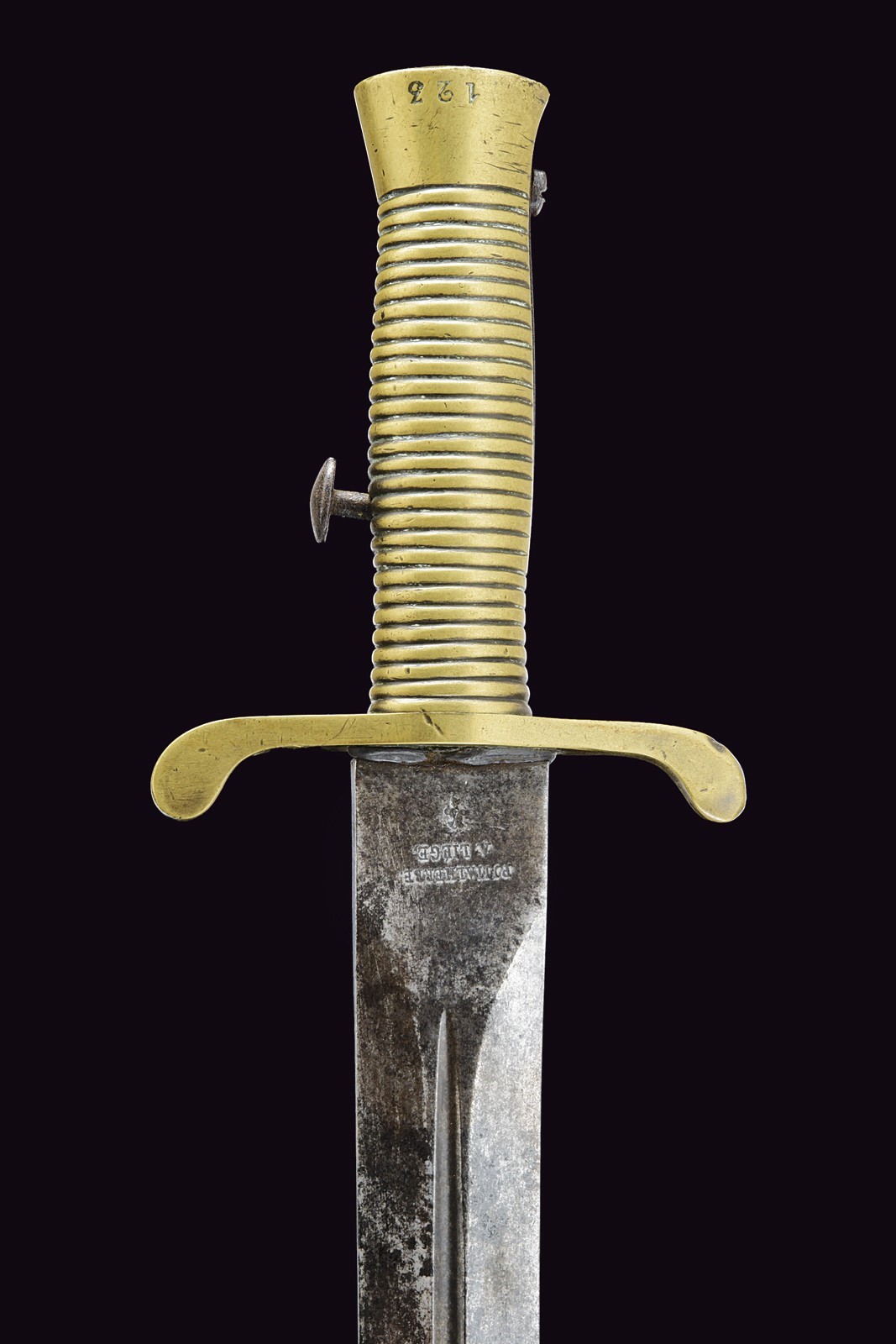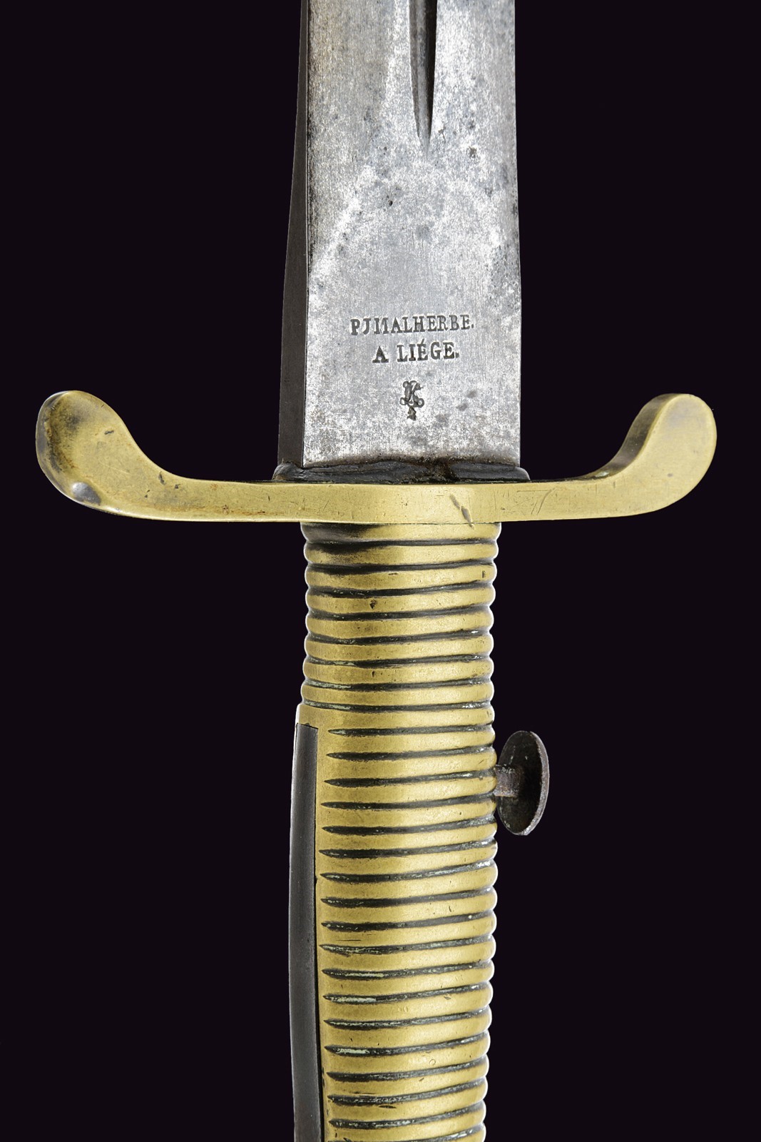 Robusta lama dritta a due fili, di forma lievemente lanceolata, la base con scanalatura centrale, in seguito costolata in mezzeria; il tallone marcato "P J MALHERBE A LIEGE" e con punzone. Fornimento in ottone in un unico pezzo con l'impugnatura; elso recante punzoni e con teste ingrossate e incurvate verso la lama; impugnatura a settori, pomo punzonato "B" e numerato "123"; bottone e molla in ferro.