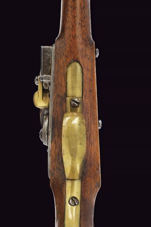 Canna liscia, tonda con base quadra e bindella per tutta la lunghezza, brunita, mirino in ottone; calibro 15 mm; codetta liscia. Batteria a pietra focaia con cartella piatta e scodellino in ottone, la martellina senza sicura, meccanica funzionante a due scatti. Cassa intera in legno, fornimenti in ottone. Bacchetta in legno con battipalla e cavastracci in ottone. Insieme ad una fondipalla.